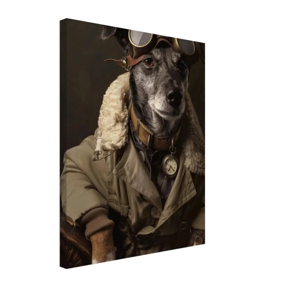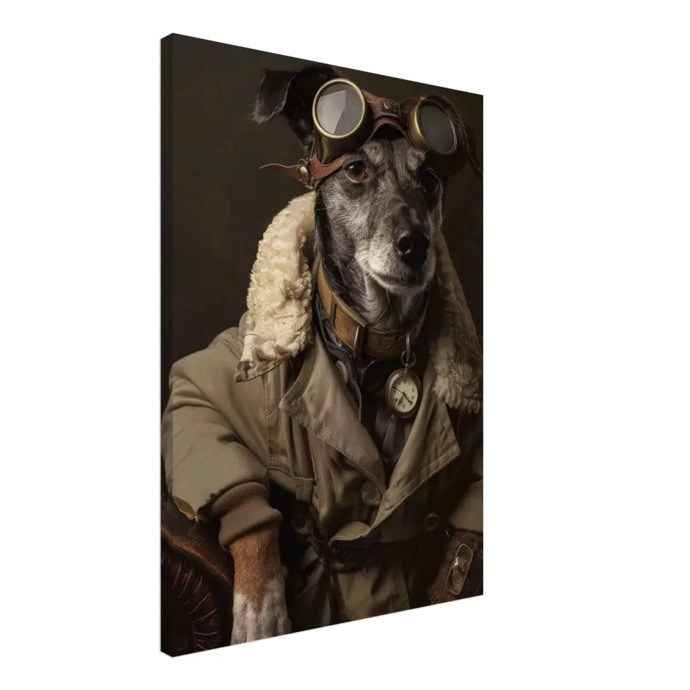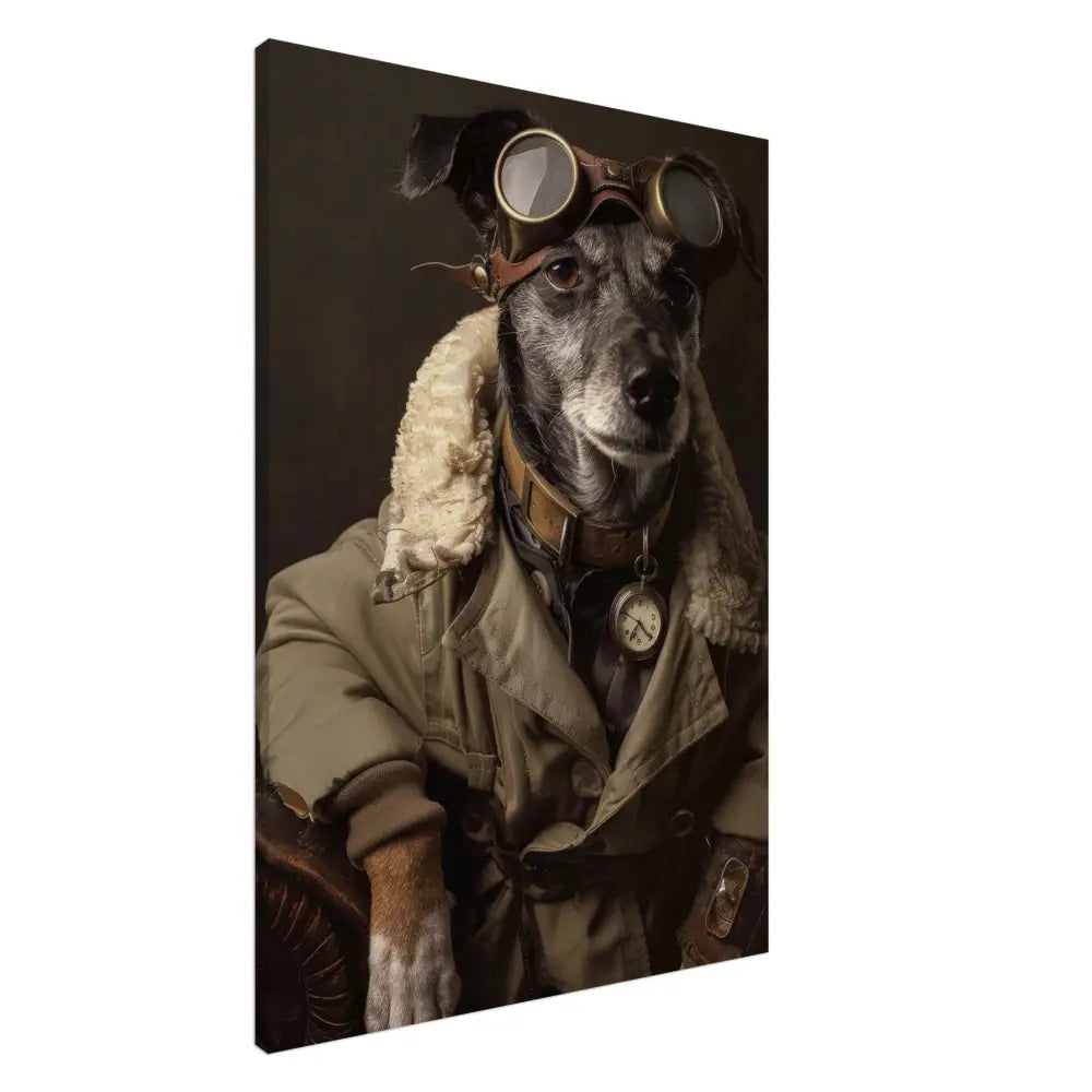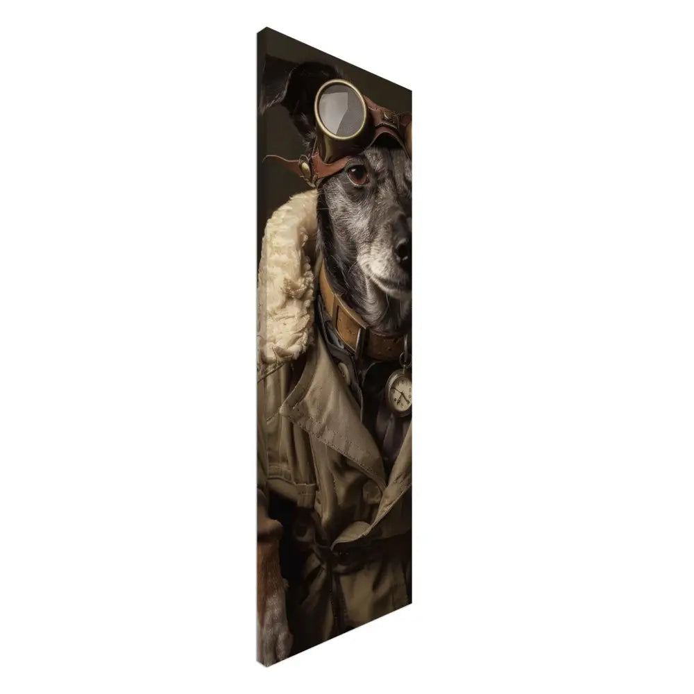 Deze afbeelding toont een dier, gekleed in een prachtige vintage steampunk outfit. Het draagt een gedetailleerde, beige jas met militaire accenten en zware knopen, afgewerkt met een gebroken witte, bontachtige kraag. Om de nek hangt een antieke klok in zilverkleur, elegant rustend tegen de donkere jas. De kop is versierd met een robuuste, lederen bril met koperkleurige metalen details, wat de indruk van een ontdekkingsreiziger wekt. De pootjes worden geaccentueerd door leren manchetjes met koperen stiksels en een mechanisch uiterlijk. De achtergrond is donker en mysterieus, waardoor het dier nog meer opvalt in zijn gedetailleerde outfit.