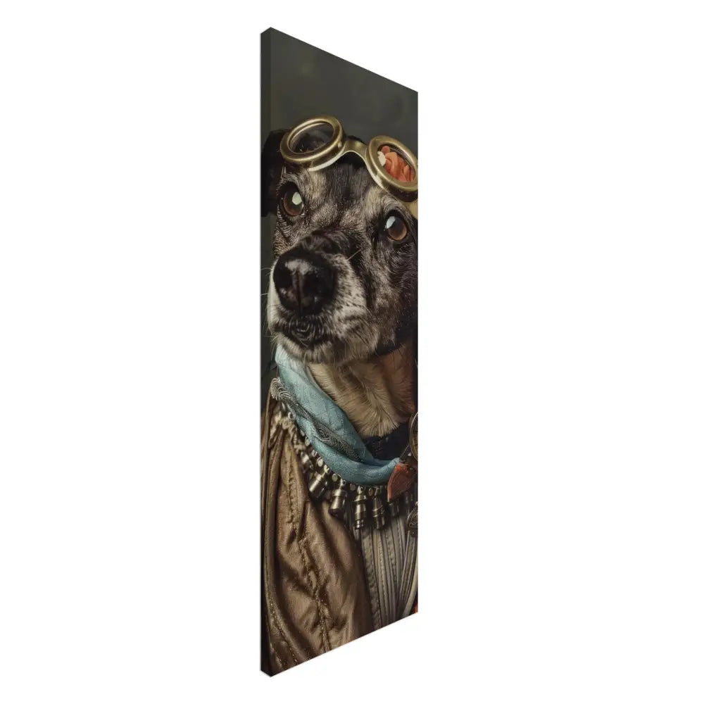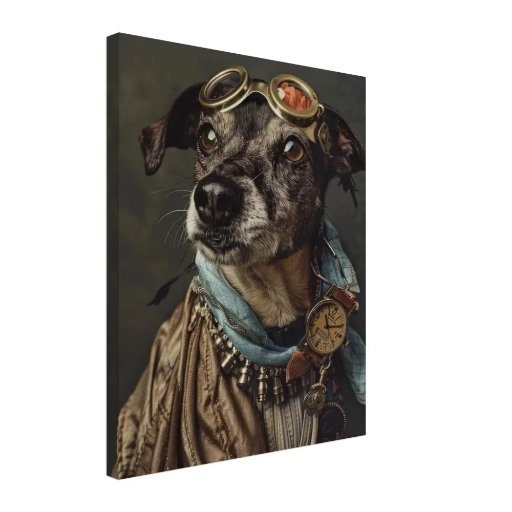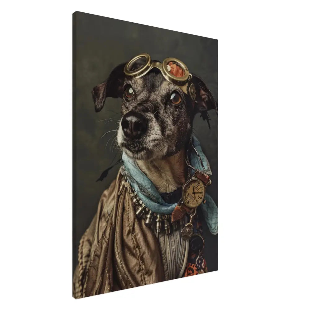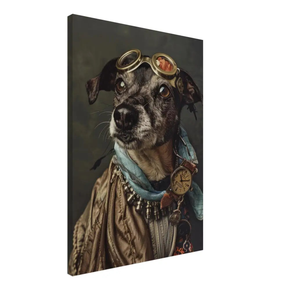 Deze afbeelding toont een hond, gekleed in een prachtige vintage steampunk outfit. Het draagt een luxueuze, goudkleurige jas met delicate borduursels en metalen accenten. Om de nek hangt een antieke bronzen klok, die een verfijnde en tijdloze uitstraling geeft. De kop wordt gesierd door een paar grote, koperen brillen met gedetailleerde randen, die perfect passen bij de rest van de outfit. Extra accessoires zoals turquoise leren sjaal en contrasterende stiksels accentueren de elegantie. De achtergrond is versierd met een subtiele, donkere patroon, waardoor de steampunk esthetiek nog verder naar voren komt.