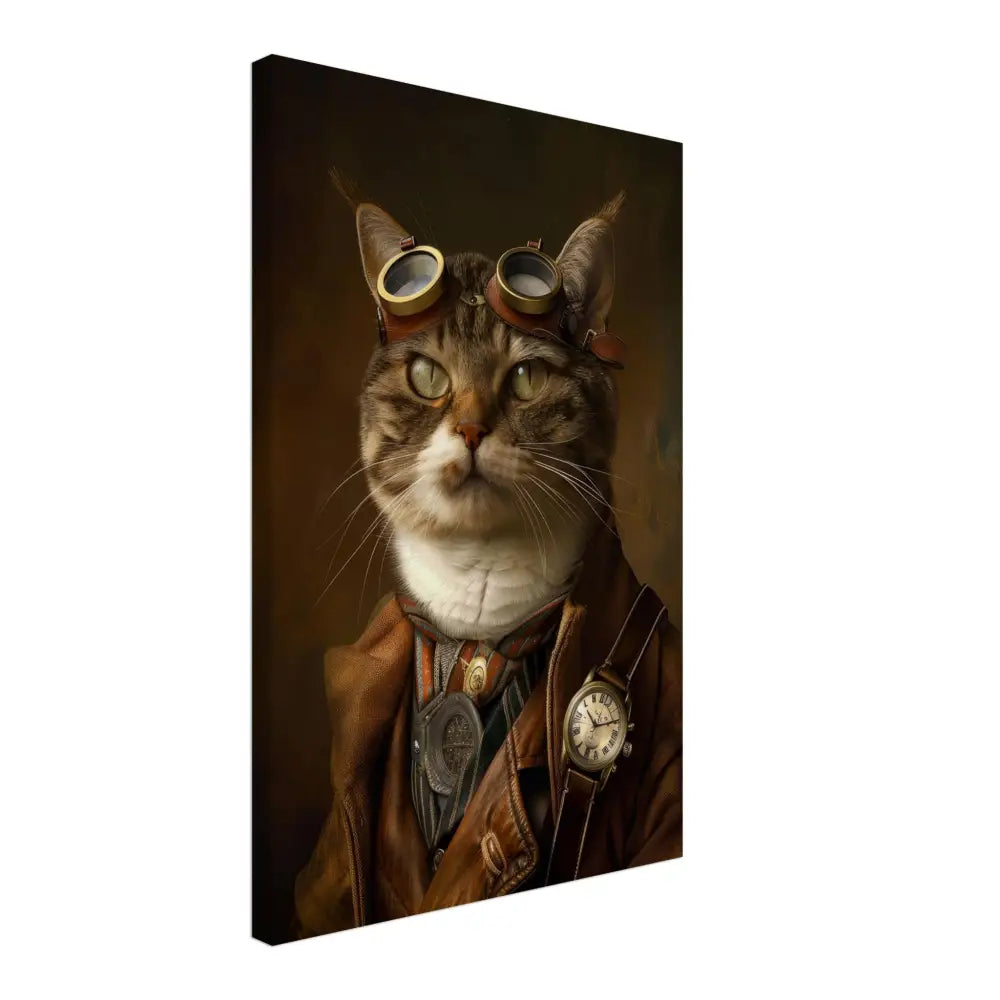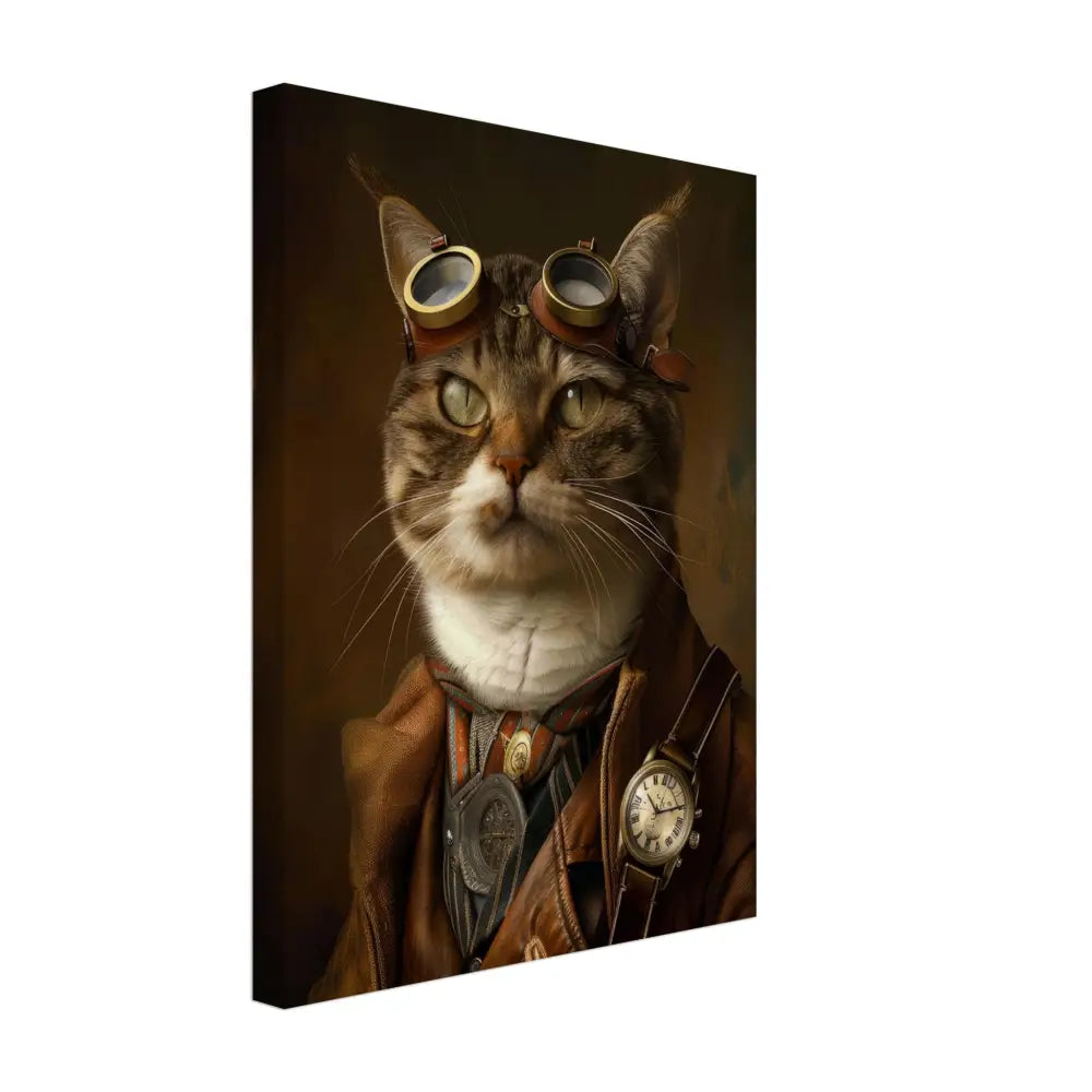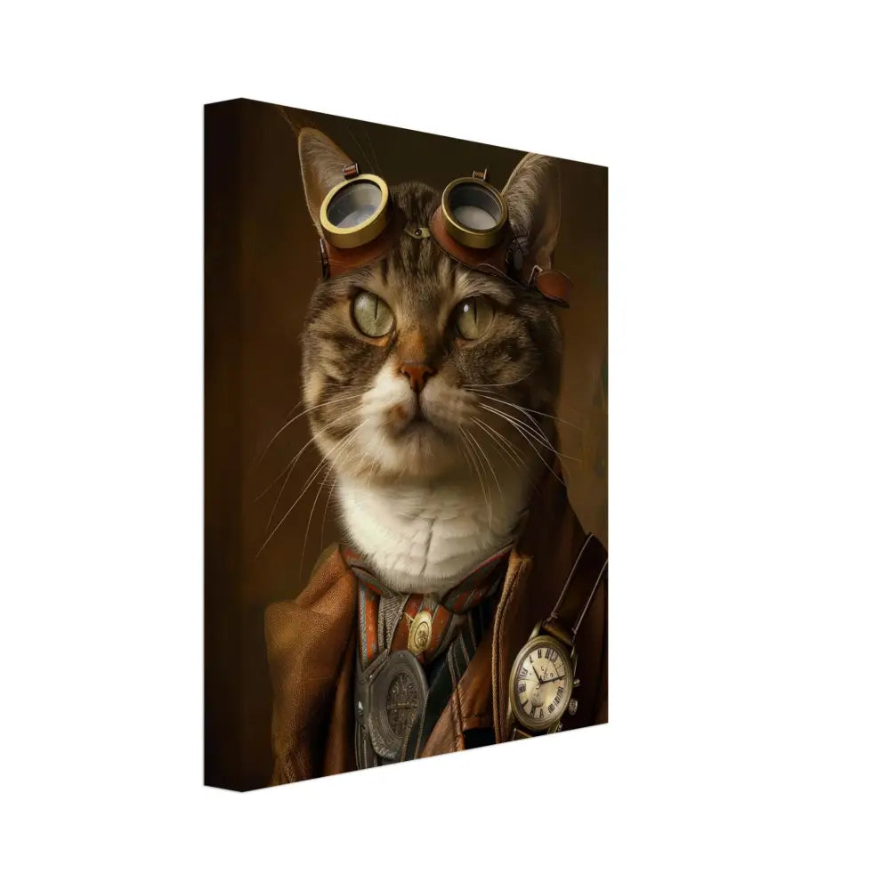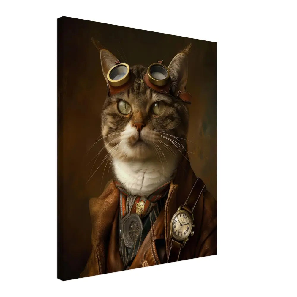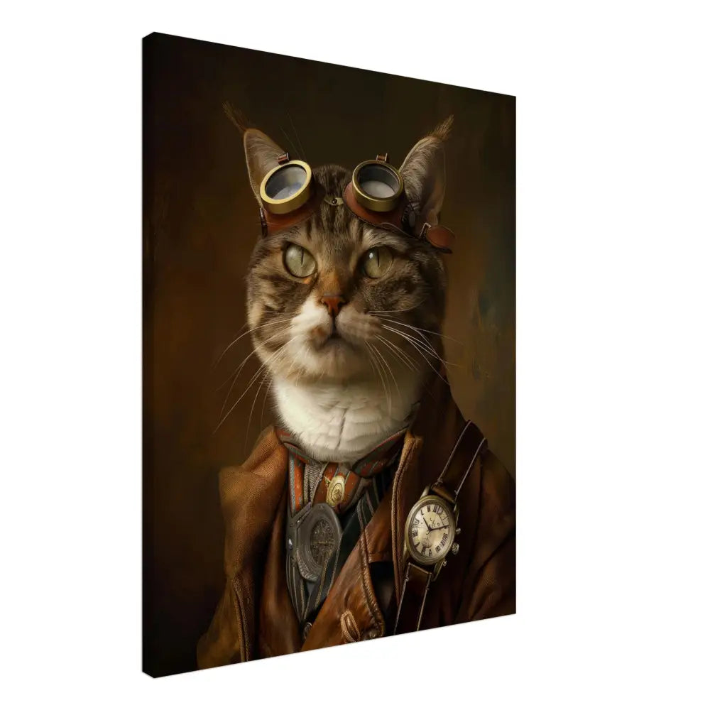 Dit schilderij toont een kat, gekleed in een prachtige steampunk outfit. Hij draagt een verfijnde, bruinleren jas met subtiele koperkleurige patronen en metalen accenten. Om zijn nek hangt een antieke zilveren klok, die zijn elegante uitstraling benadrukt. Zijn kop wordt gesierd door een paar imposante retro-futuristische brillen met bronzen metalen details, die hem een avontuurlijke uitstraling geven. Zijn pootjes zijn voorzien van stijlvolle bontachtige manchetjes en leren accenten, met contrasterende stiksels die het geheel compleet maken. De achtergrond bestaat uit een warme, aardetint die perfect aansluit op de vintage steampunk sfeer van het portret.