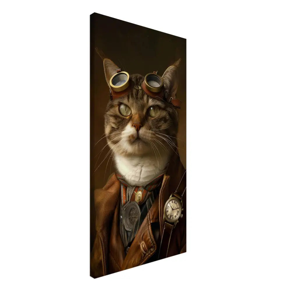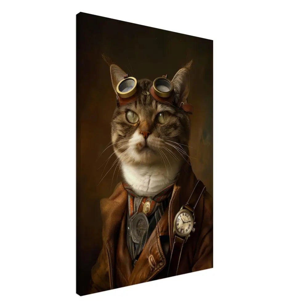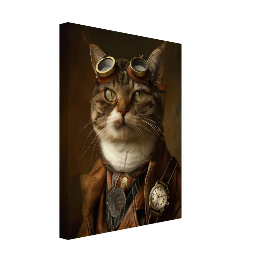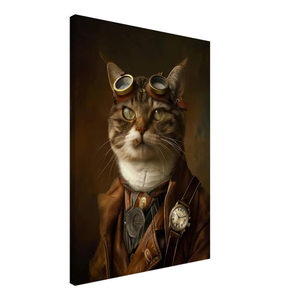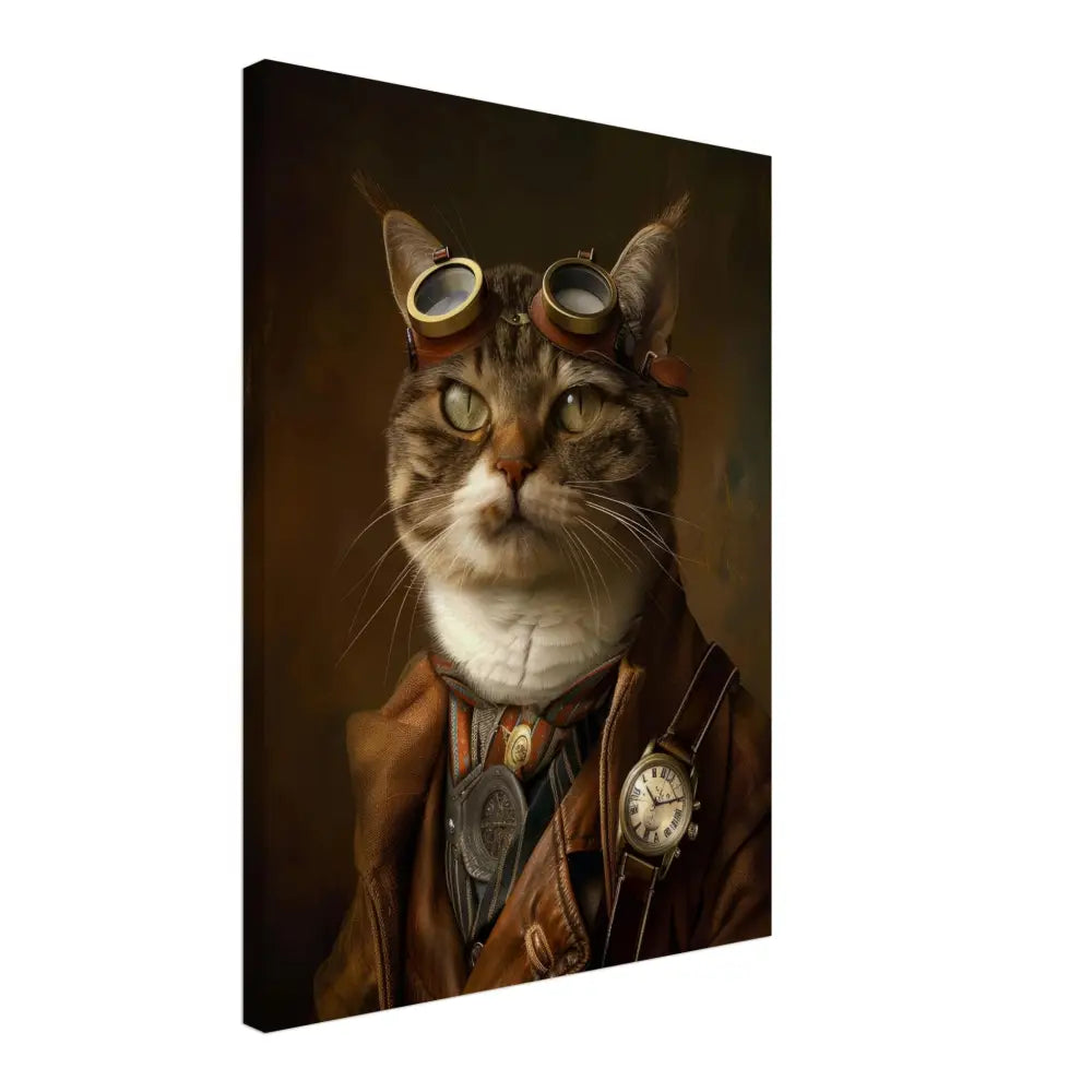 Dit schilderij toont een kat, gekleed in een prachtige steampunk outfit. Hij draagt een verfijnde, bruinleren jas met subtiele koperkleurige patronen en metalen accenten. Om zijn nek hangt een antieke zilveren klok, die zijn elegante uitstraling benadrukt. Zijn kop wordt gesierd door een paar imposante retro-futuristische brillen met bronzen metalen details, die hem een avontuurlijke uitstraling geven. Zijn pootjes zijn voorzien van stijlvolle bontachtige manchetjes en leren accenten, met contrasterende stiksels die het geheel compleet maken. De achtergrond bestaat uit een warme, aardetint die perfect aansluit op de vintage steampunk sfeer van het portret.