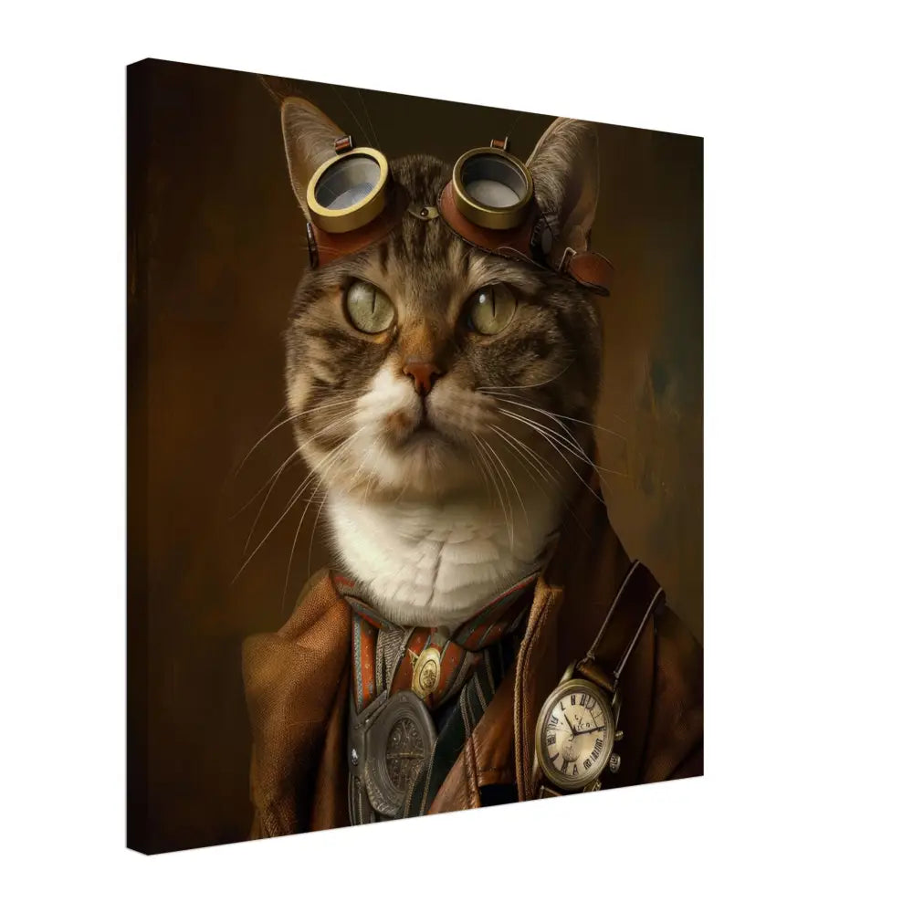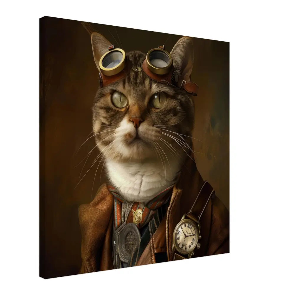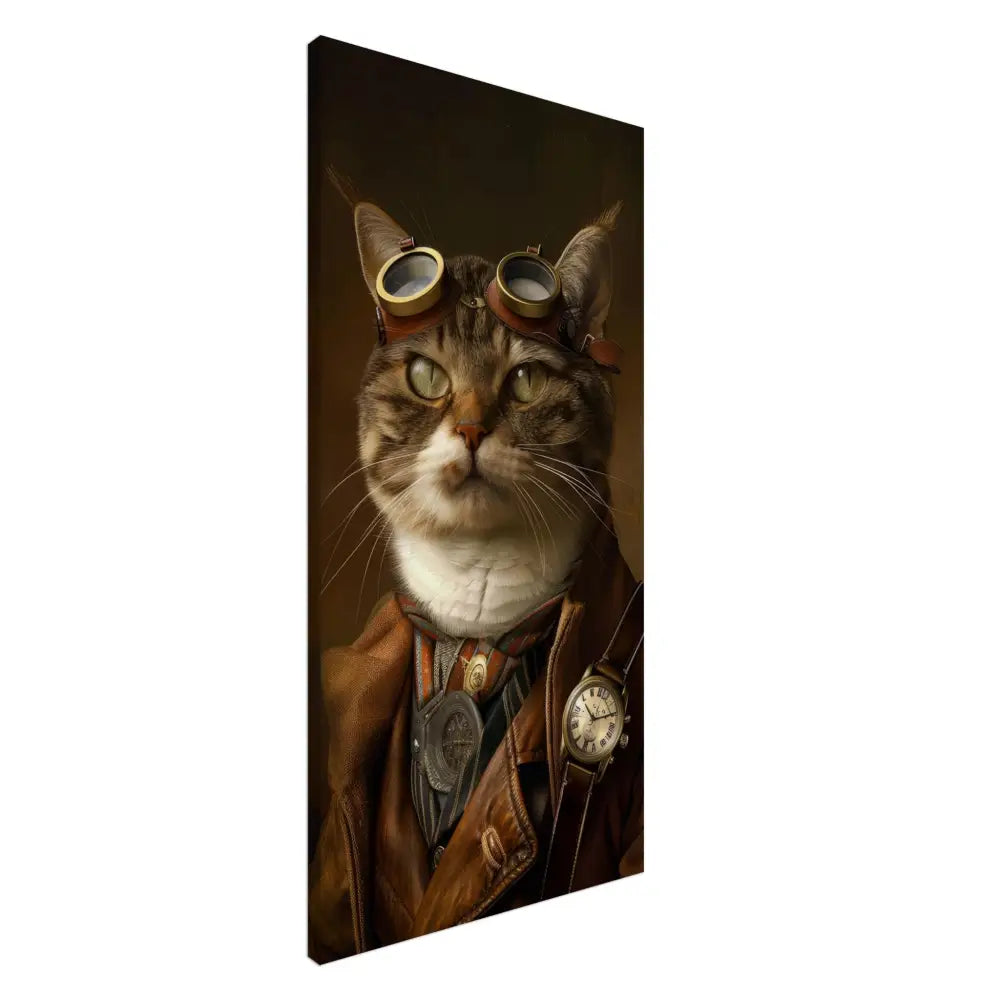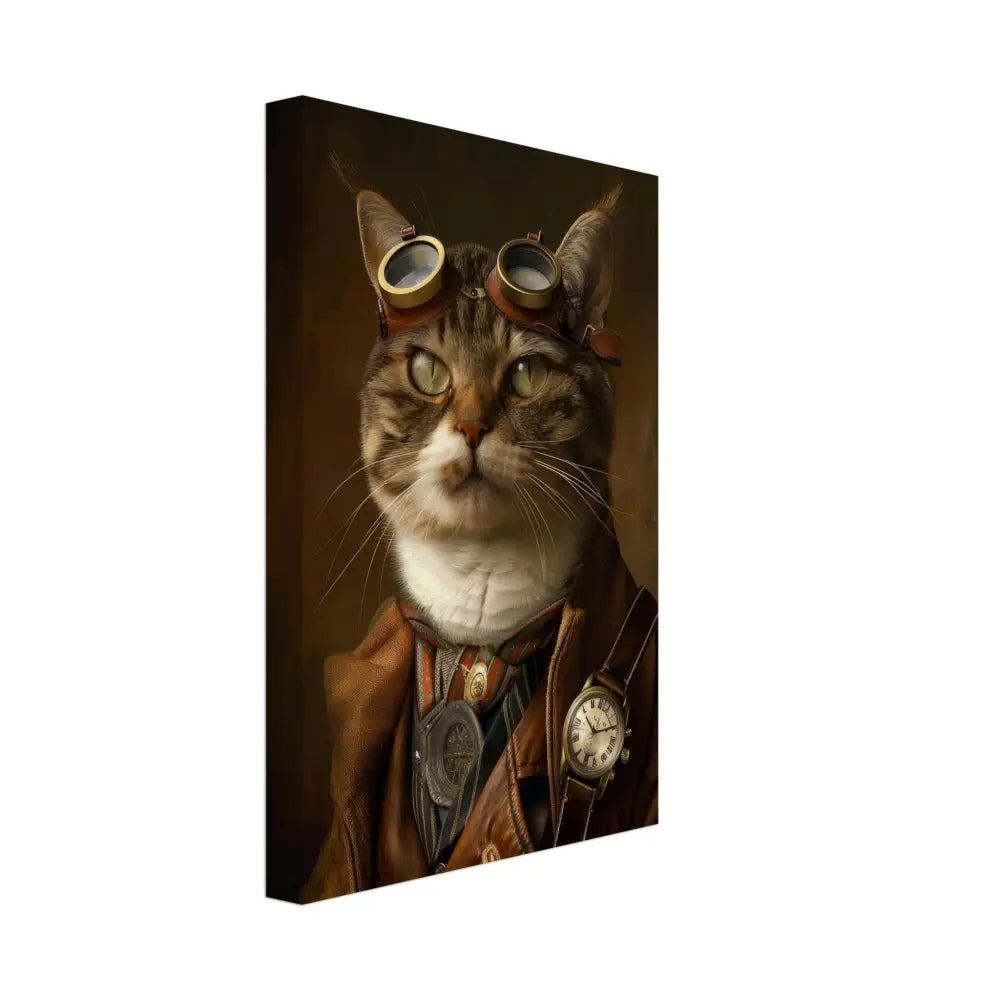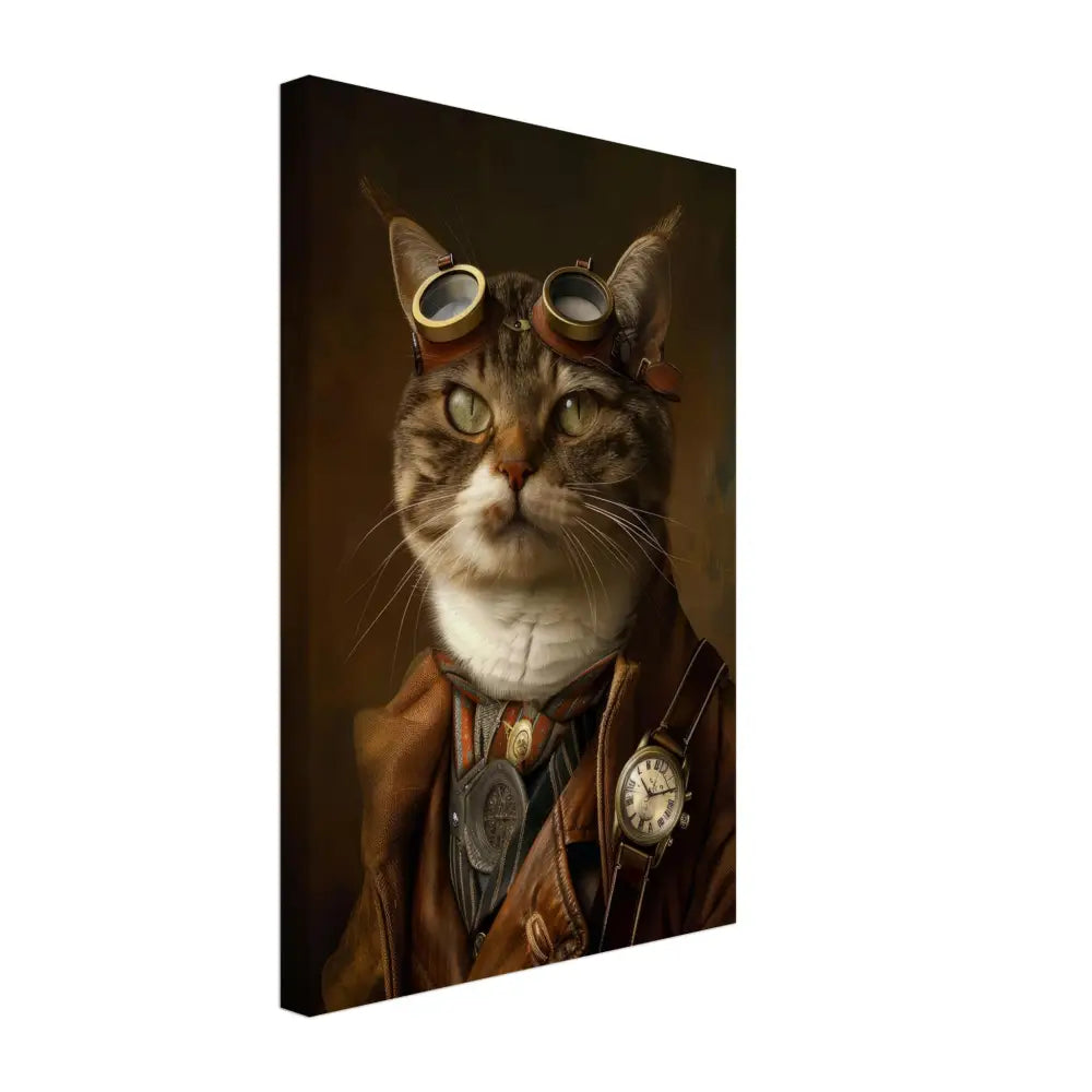 Dit schilderij toont een kat, gekleed in een prachtige steampunk outfit. Hij draagt een verfijnde, bruinleren jas met subtiele koperkleurige patronen en metalen accenten. Om zijn nek hangt een antieke zilveren klok, die zijn elegante uitstraling benadrukt. Zijn kop wordt gesierd door een paar imposante retro-futuristische brillen met bronzen metalen details, die hem een avontuurlijke uitstraling geven. Zijn pootjes zijn voorzien van stijlvolle bontachtige manchetjes en leren accenten, met contrasterende stiksels die het geheel compleet maken. De achtergrond bestaat uit een warme, aardetint die perfect aansluit op de vintage steampunk sfeer van het portret.