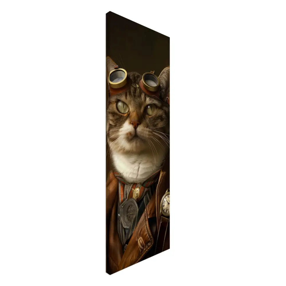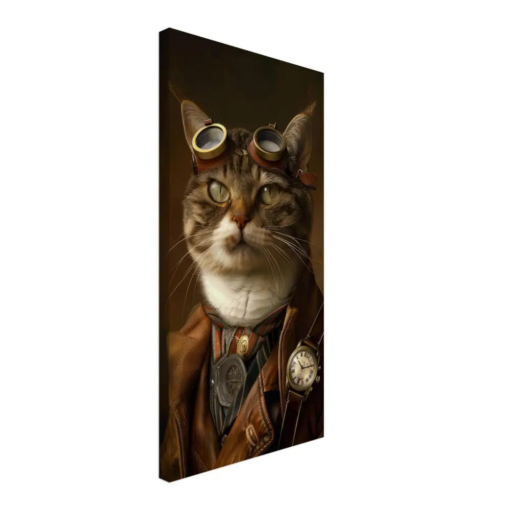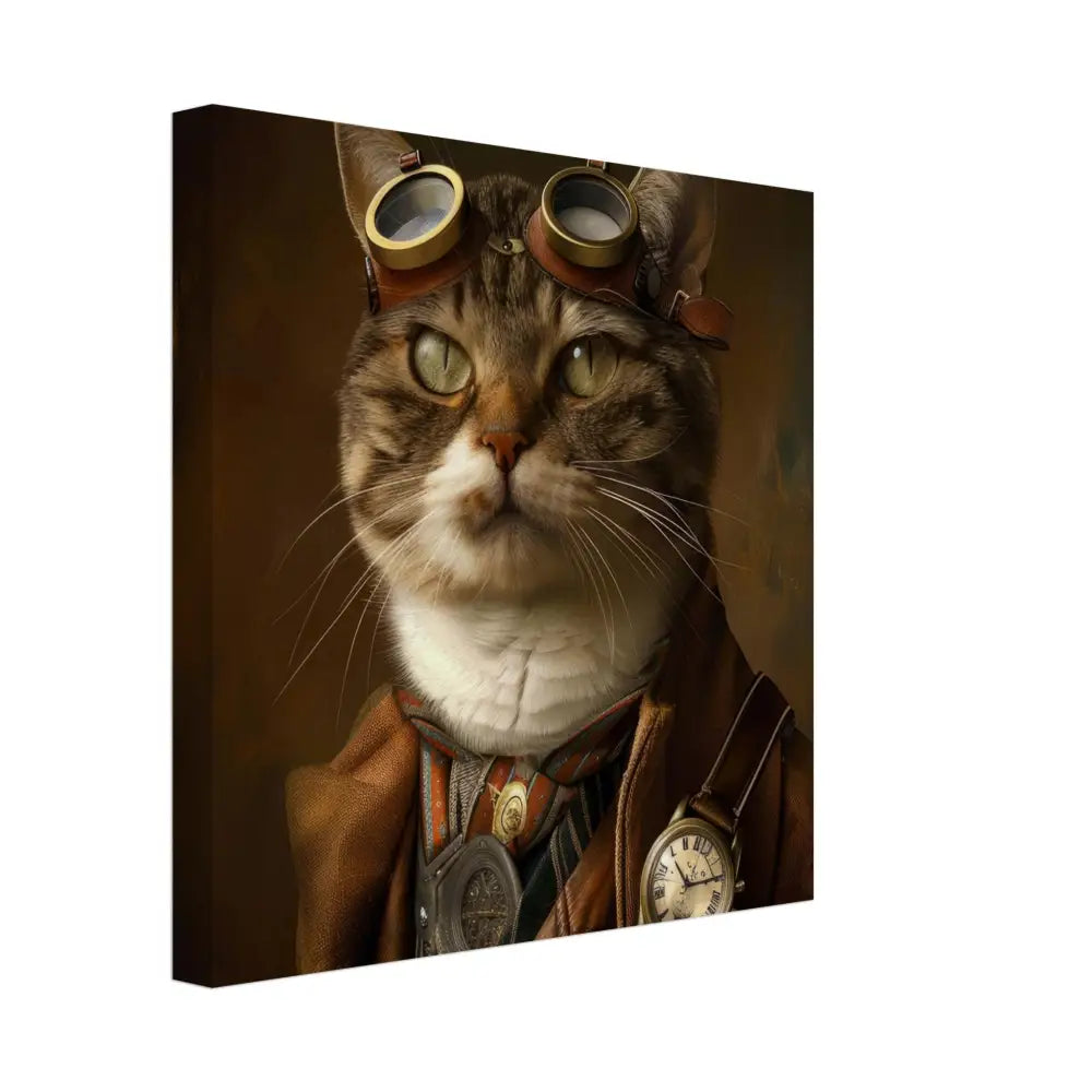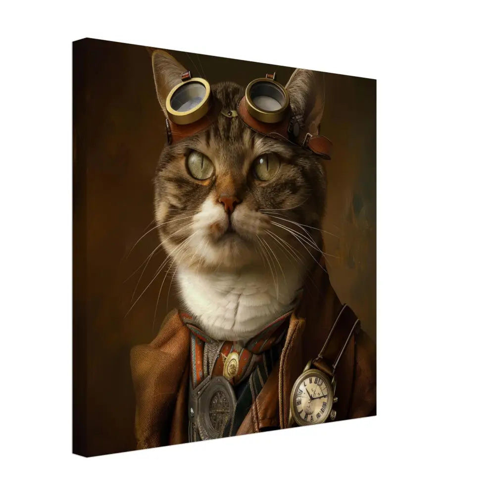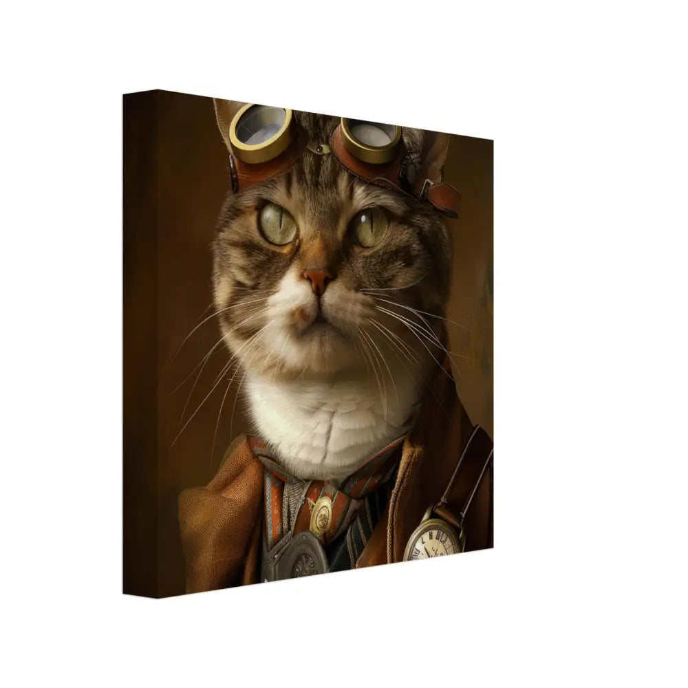 Dit schilderij toont een kat, gekleed in een prachtige steampunk outfit. Hij draagt een verfijnde, bruinleren jas met subtiele koperkleurige patronen en metalen accenten. Om zijn nek hangt een antieke zilveren klok, die zijn elegante uitstraling benadrukt. Zijn kop wordt gesierd door een paar imposante retro-futuristische brillen met bronzen metalen details, die hem een avontuurlijke uitstraling geven. Zijn pootjes zijn voorzien van stijlvolle bontachtige manchetjes en leren accenten, met contrasterende stiksels die het geheel compleet maken. De achtergrond bestaat uit een warme, aardetint die perfect aansluit op de vintage steampunk sfeer van het portret.