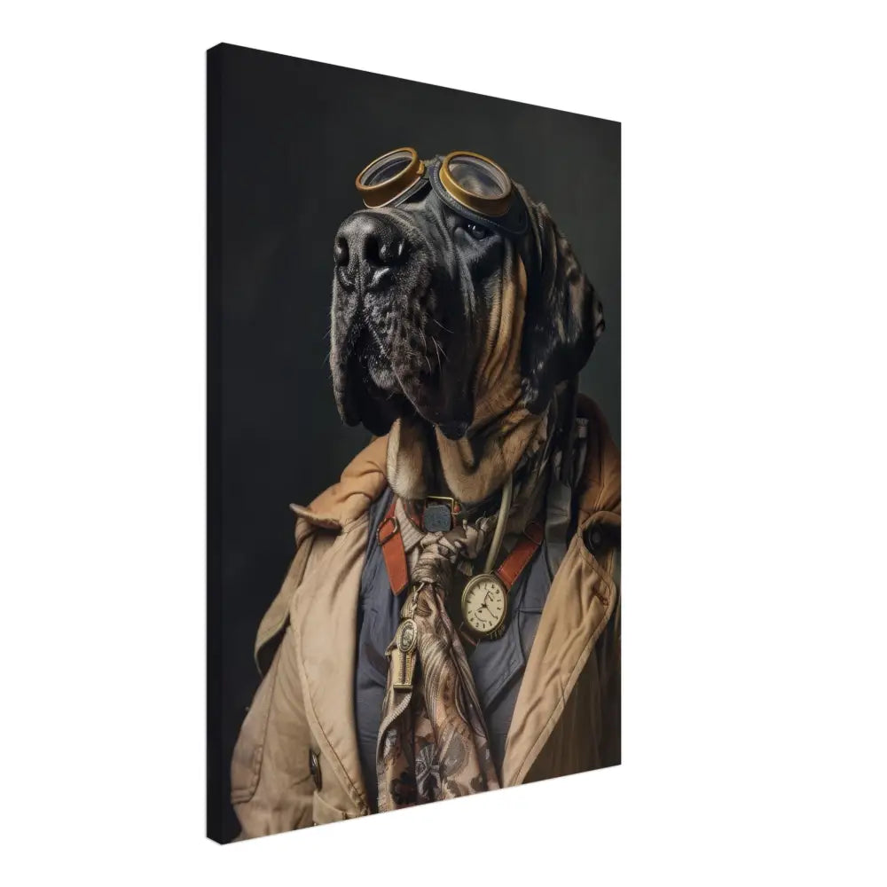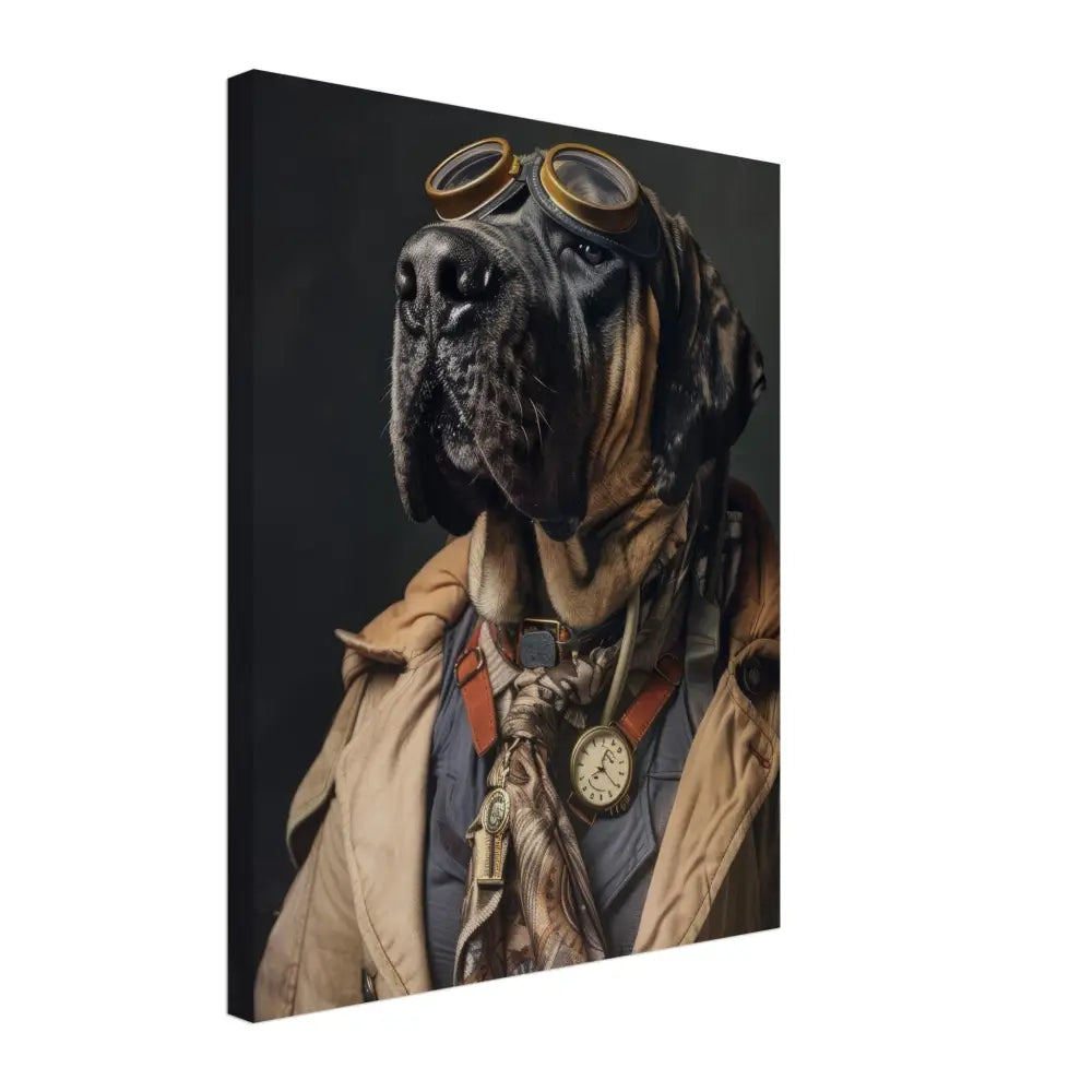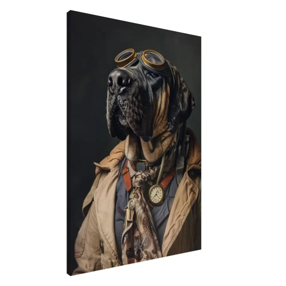 Deze afbeelding toont een dier, gekleed in een prachtige steampunk outfit. Het draagt een zandkleurige jas met subtiele stiksels en leren accenten op de schouders. Om de nek hangt een antiquarische klok in een bronzen kleur, die de tijdloze elegantie van de outfit benadrukt. Het hoofd is versierd met een paar grote, goudkleurige futuristische brillen met gedetailleerde metalen accenten, die een avontuurlijke uitstraling geven. De afbeelding wordt extra verfijnd met een sierlijke sjaal bedekt met ingewikkelde patronen en een verfijnde broche. De achtergrond is een donkere, neutrale tint, waardoor alle aandacht naar het majestueuze dier gaat.