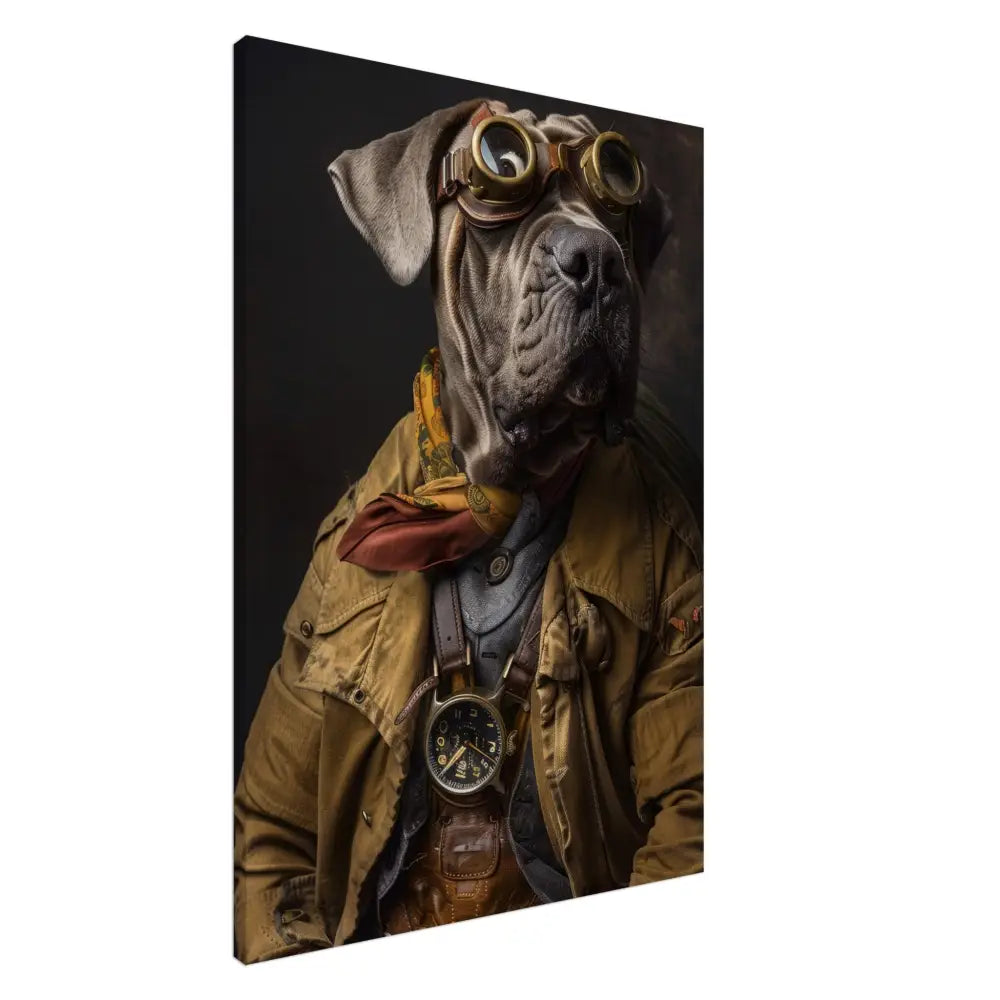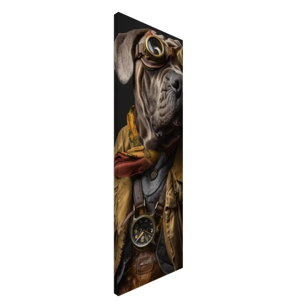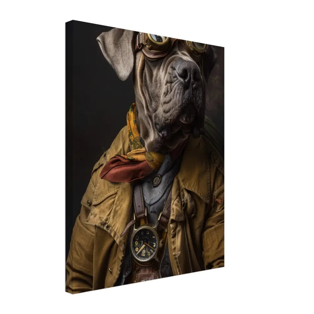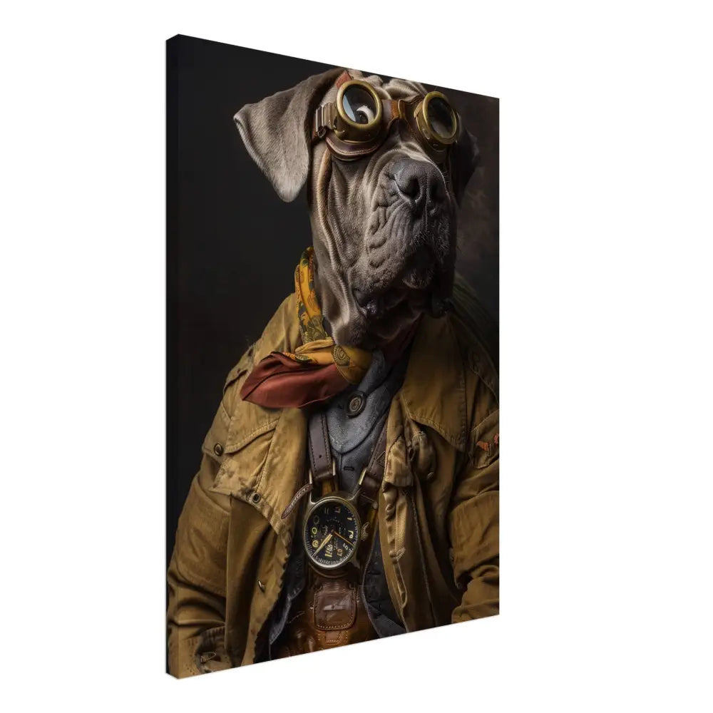 Deze afbeelding toont een dier, gekleed in een prachtige vintage steampunk outfit. Het draagt een verfijnde, mosterdkleurige jas met subtiele ruitpatronen en robuuste leren accenten. Om de nek hangt een antieke, goudkleurige klok, die de tijdloosheid van het ensemble benadrukt. Op het hoofd prijkt een indrukwekkende bril met massieve, koperkleurige metalen details, die een avontuurlijke indruk wekt. Extra accessoires zoals bruine leren manchetten en contrasterende stiknaden geven een rijke diepte aan de kledingstijl. De achtergrond is donker en mysterieus, waardoor het steampunk-thema volledig tot zijn recht komt in dit unieke kunstwerk.