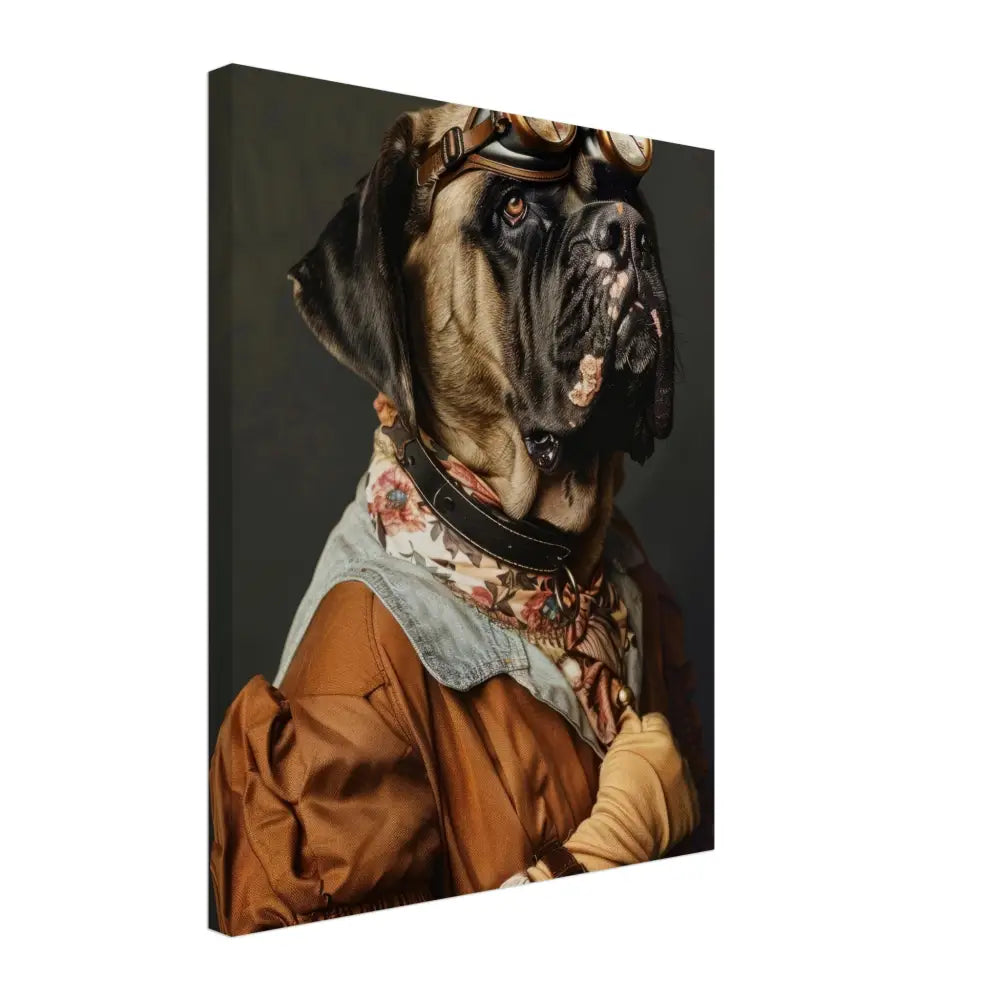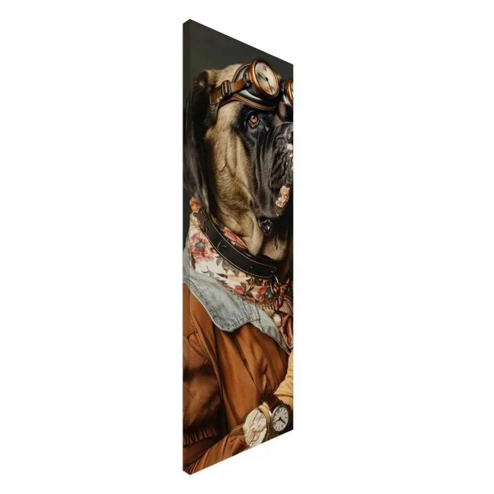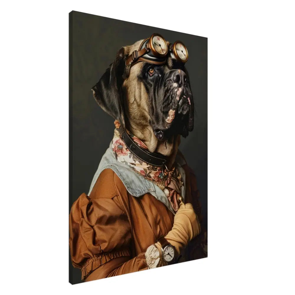 Deze afbeelding toont een dier, gekleed in een prachtige vintage steampunk outfit. Het draagt een sierlijke, koperbruine jas met volumineuze mouwen en subtiele plooien bij de schouders. Om de nek hangt een antieke bronzen klok die de elegante uitstraling versterkt. De kop is versierd met een paar grote, retro-futuristische brillen met metalen details in koperkleur, waardoor het dier eruitziet als een avontuurlijke tijdreiziger. De pootjes zijn voorzien van crèmekleurige, bontachtige manchetjes die het geheel afmaken. Op de achtergrond is een donkere, ingetogen setting te zien, die de focus volledig op het gedetailleerde gezicht van het dier legt.
