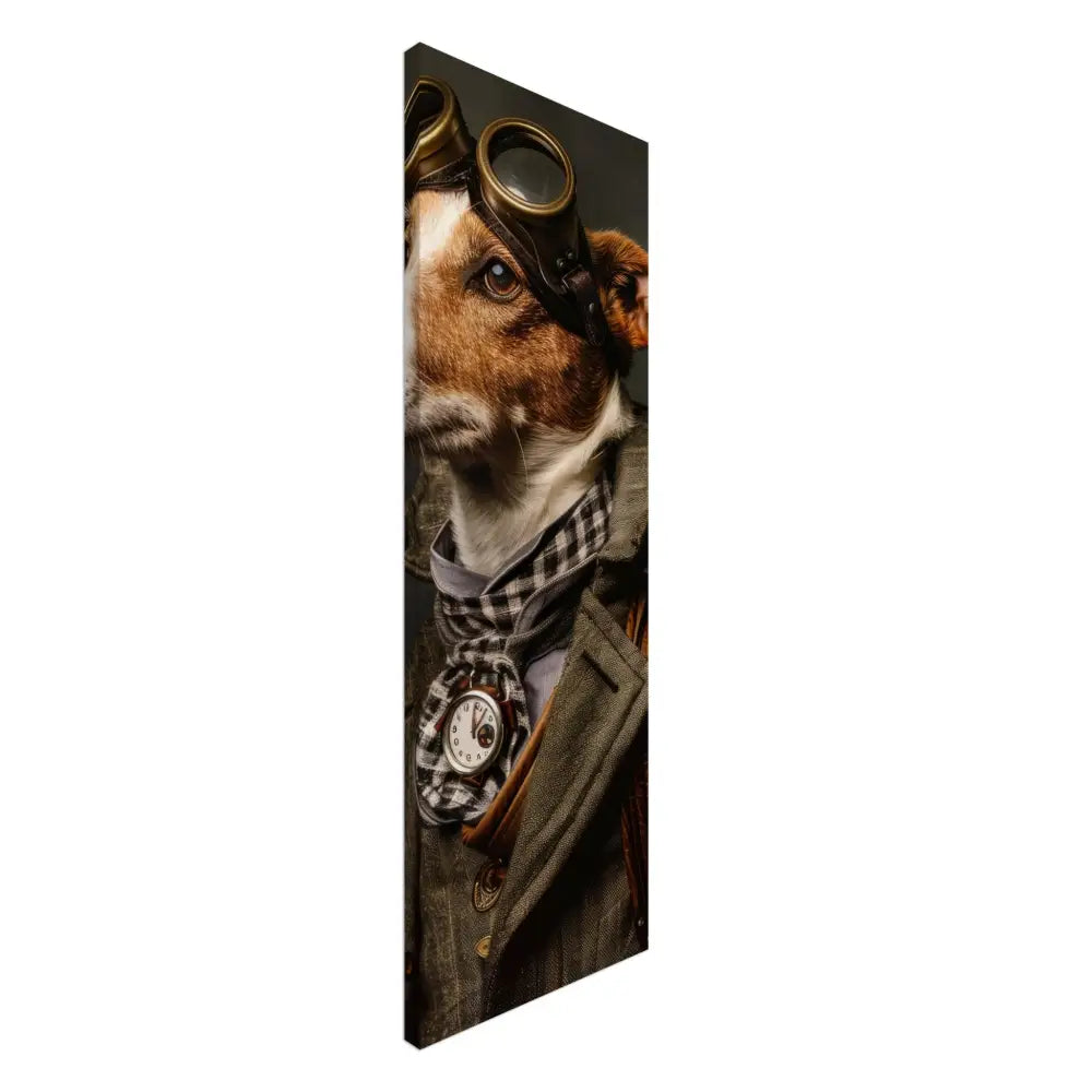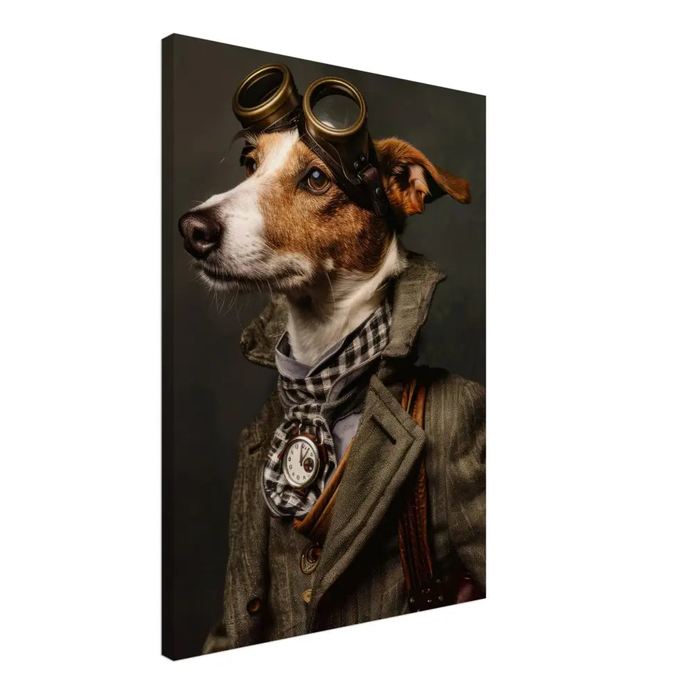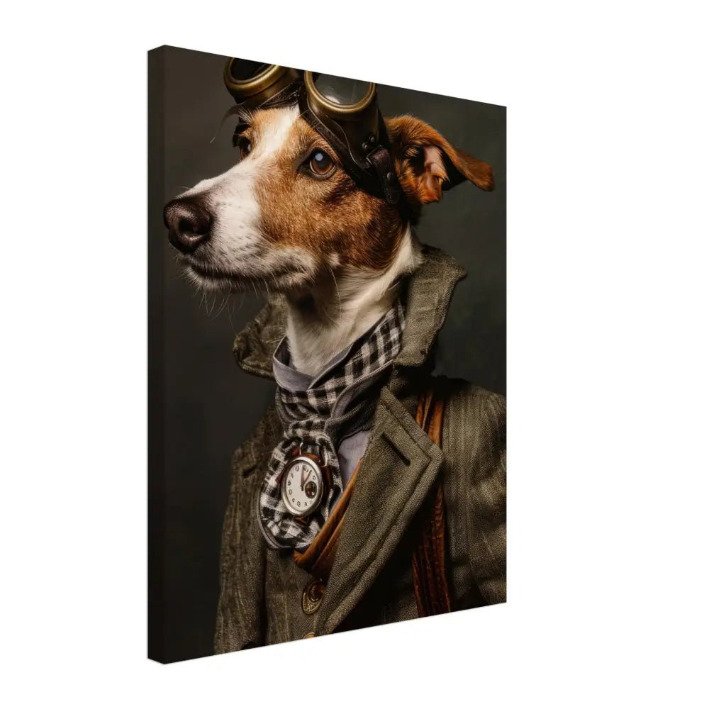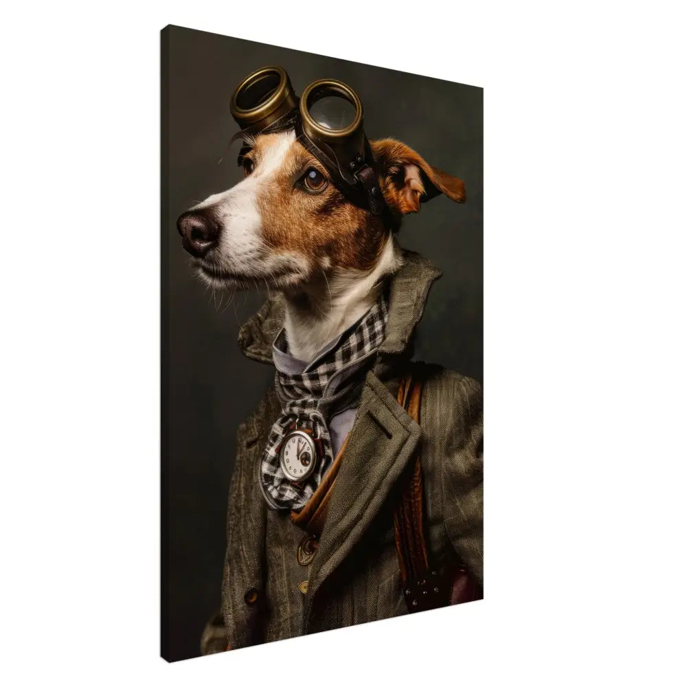 Deze afbeelding toont een dier, gekleed in een prachtige vintage steampunk outfit. Het draagt een elegante, olijfgroene jas met subtiele streepjes en messing accenten, die perfect passen bij de steampunk-esthetiek. Om de hals van de hond hangt een antieke klok met een zilverkleurige wijzerplaat en een bronzen rand, wat een extra vleugje authenticiteit toevoegt. Op zijn hoofd prijkt een retro-futuristische bril met bronskleurige metalen details. Zijn outfit wordt verder gecompleteerd met een geruite sjaal, leren riemen en contrasterende stiksels. De achtergrond heeft een neutrale, grijsgroene tint die de hond en zijn opvallende outfit extra laat opvallen.