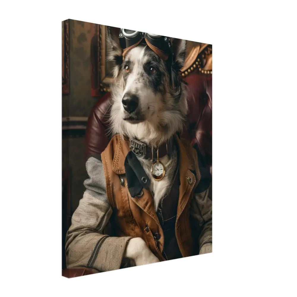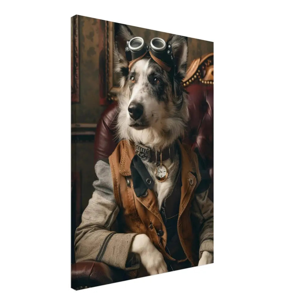 Deze afbeelding toont een dier, gekleed in een prachtige vintage steampunk outfit. Het draagt een stijlvolle, bruine leren jas met subtiele stoffen accenten in grijs, en opvallende stiksels die de structuur benadrukken. Om de nek hangt een antieke gouden klok, die elegant schittert tegen de chique outfit. Op het hoofd van het dier rust een paar verfijnde, zilveren goggles met robuuste metalen details, wat zorgt voor een gedistingeerde uitstraling. De pootjes worden gesierd door luxe, satijnen manchetjes die het geheel compleet maken. De achtergrond is rijkelijk versierd met klassiek, donkergroen behang dat perfect aansluit bij de aristocratische sfeer van het portret.