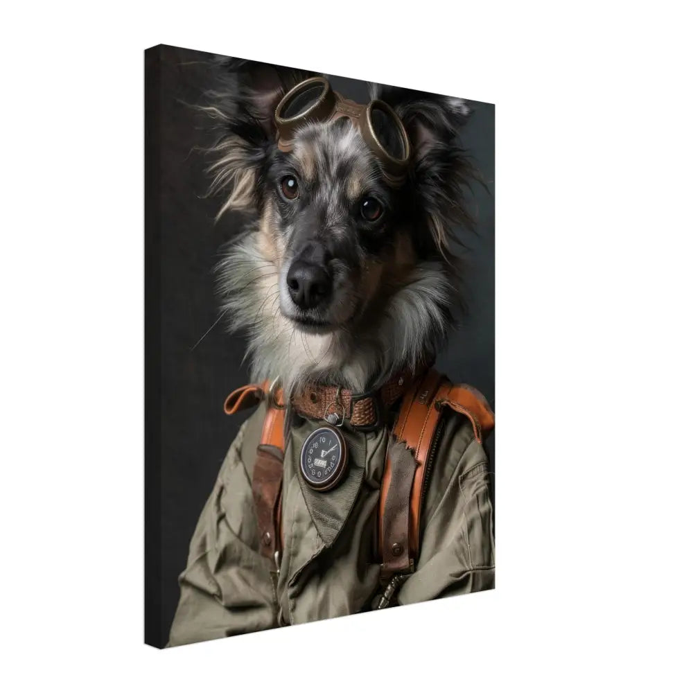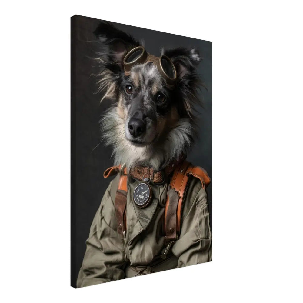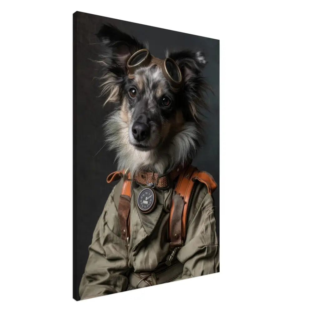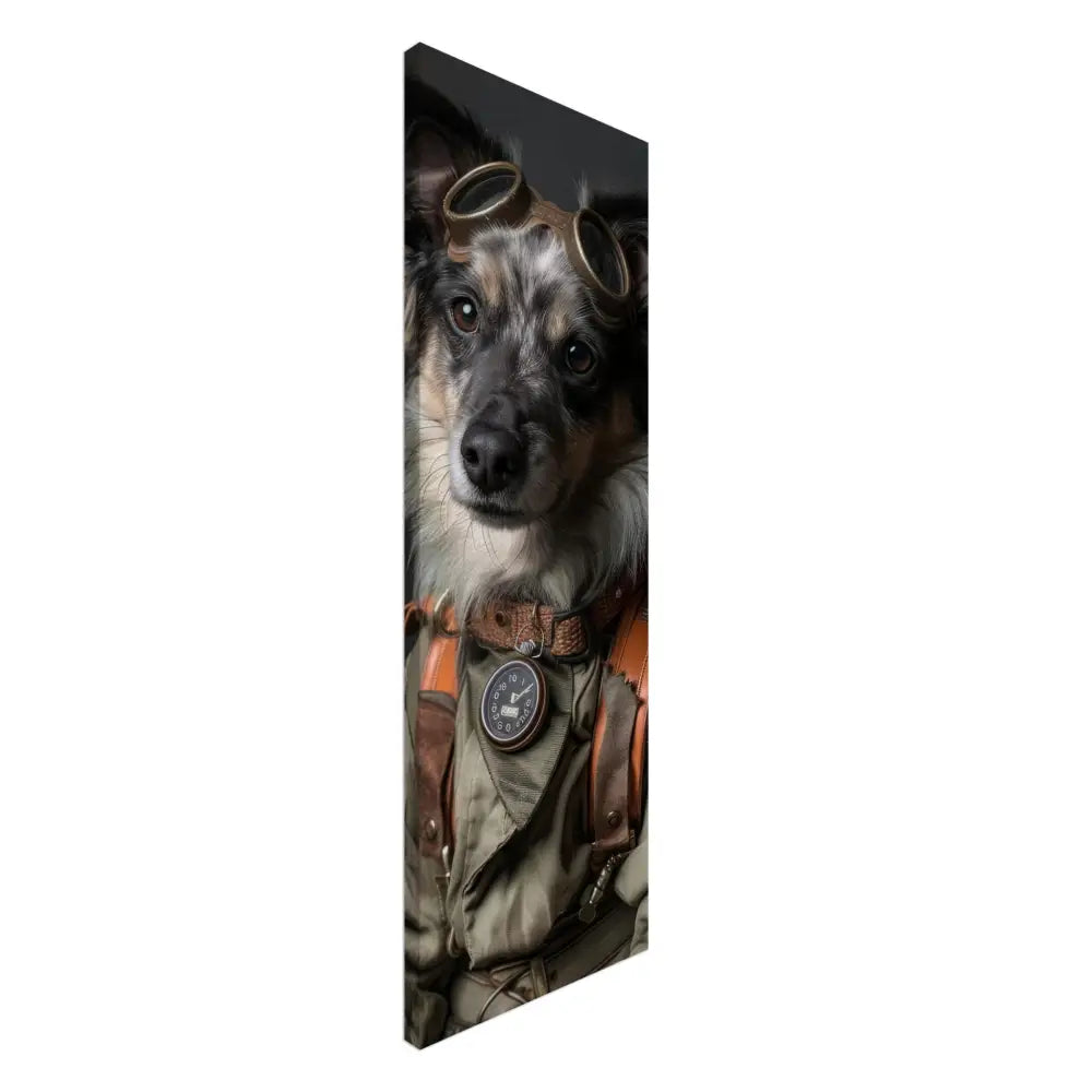 Deze afbeelding toont een dier, gekleed in een prachtige vintage steampunk outfit. Het draagt een elegant groene jas met subtiele, ingewerkte ritsen en leren accenten. Om de nek hangt een antieke bronzen klok, die de stoere uitstraling versterkt. De kop wordt gesierd door een paar grote, retro-futuristische brillen met metalen details in messingkleur, waardoor deze eruitziet als een avontuurlijke tijdreiziger. De pootjes zijn versierd met bruin lederen riempjes en contrasterende stiksels, die het geheel afmaken. De achtergrond is donker en mysterieus, met een industriële flair dat de steampunk esthetiek benadrukt.