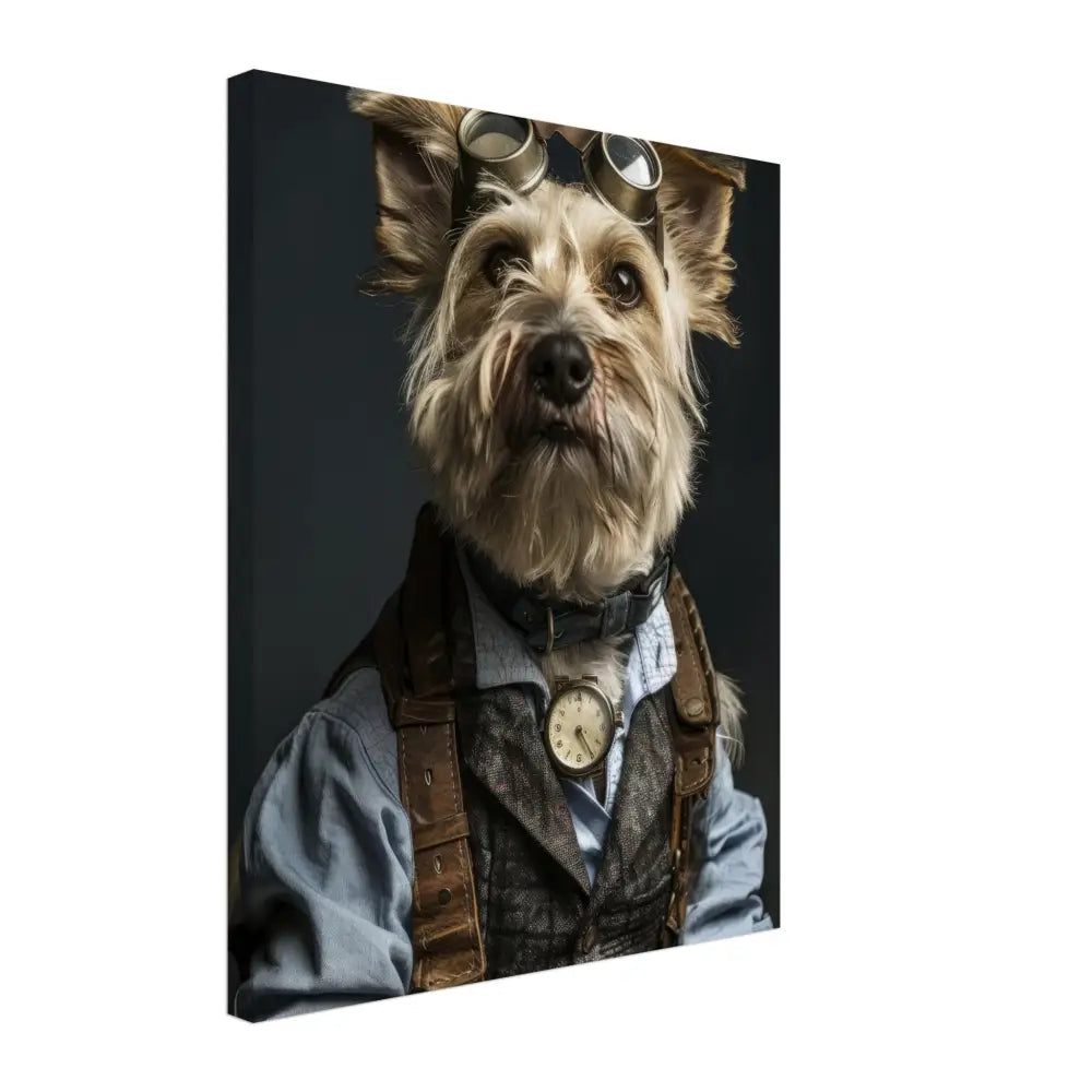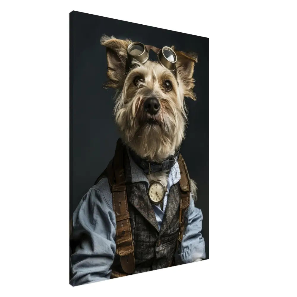 Deze afbeelding toont een hond, gekleed in een prachtige vintage steampunk outfit. Het draagt een elegante, grijskleurige jas met subtiele ruitpatronen en leren accenten die de klassieke stijl benadrukken. Om de nek hangt een antieke gouden klok, die zijn verfijnde uitstraling versterkt. Op zijn hoofd prijkt een paar robuuste, retro-futuristische brillen met bronzen metalen details, wat hem de uitstraling geeft van een gedurfde ontdekkingsreiziger. De pootjes zijn versierd met stijlvolle, leren accessoires die perfect contrasteren met de kostbare stoffen van zijn outfit. De achtergrond is donker en minimalistisch, waardoor de aandacht volledig op de uitbundige steampunk-outfit gevestigd blijft.