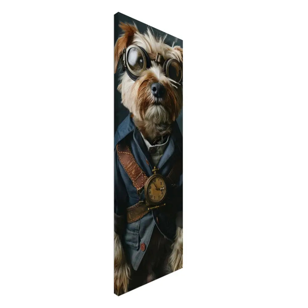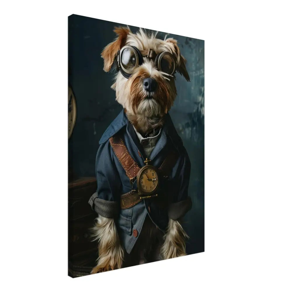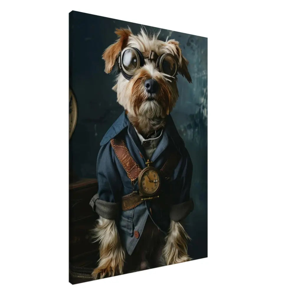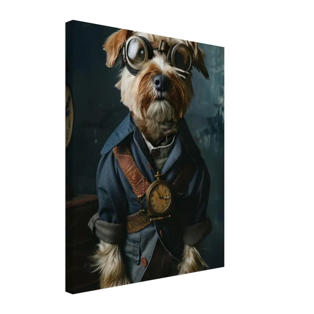 Deze afbeelding toont een dier, gekleed in een prachtige vintage steampunk outfit. Het draagt een stijlvolle, donkerblauwe jas met subtiele leren accenten en contrasterende stiksels. Om de nek van het dier hangt een antieke, bronzen klok die een vleugje elegantie toevoegt. Op het hoofd prijkt een paar grote, retro-futuristische brillen met metalen details in roestkleur, die het een avontuurlijke uitstraling geven. De pootjes zijn versierd met dikke, grijze bontachtige manchetjes, wat het geheel een rijke textuur en warmte verleent. De achtergrond bestaat uit een vervaagde industriële setting, die de steampunk sfeer perfect complementeert.