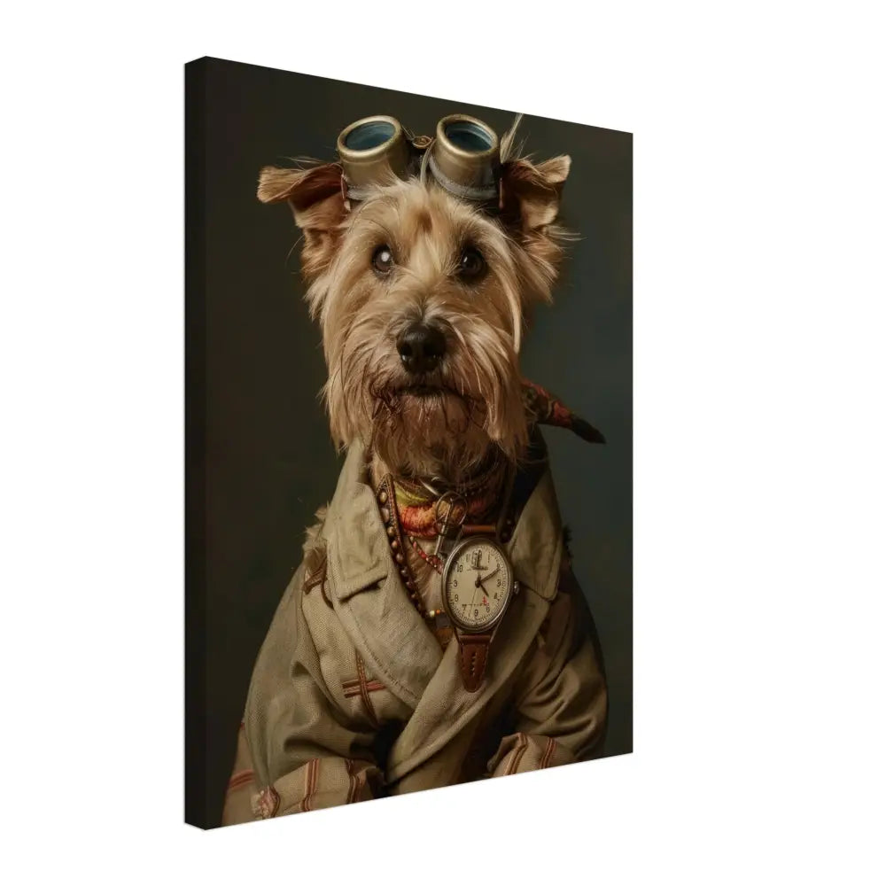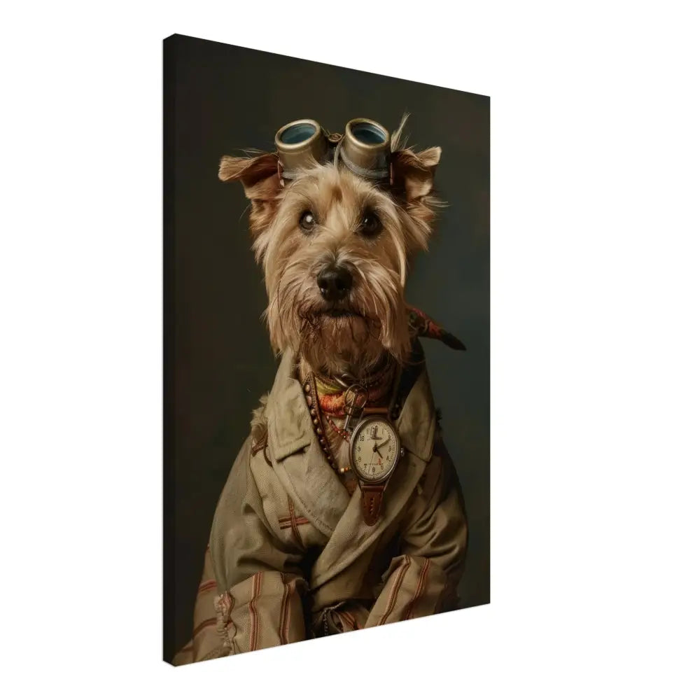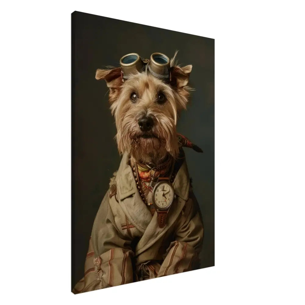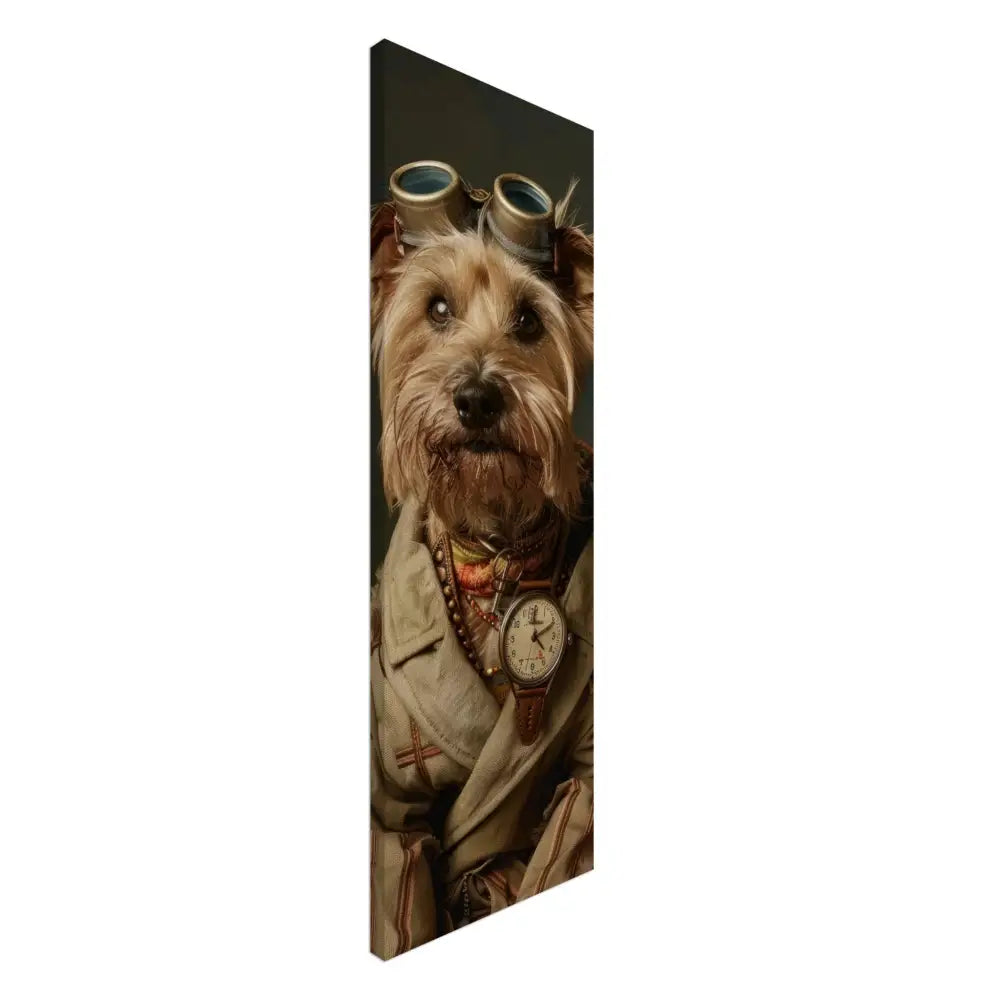 Deze afbeelding toont een dier, gekleed in een prachtige vintage steampunk outfit. Het draagt een stijlvolle, beige jas met subtiele strepen en verfijnde stiksels. Om de nek hangt een antieke, ronde klok met een zilveren wijzerplaat, die een vleugje elegantie toevoegt. De kop is voorzien van een paar stoere, bronzen brillen met robuuste metalen details, waardoor het dier een gedistingeerde uitstraling krijgt. De pootjes zijn versierd met opvallende manchetjes van zacht bont, in combinatie met leren accenten voor een extra dimensie. De achtergrond is compleet met een gedempte, industriële tint die de steampunk sfeer versterkt.