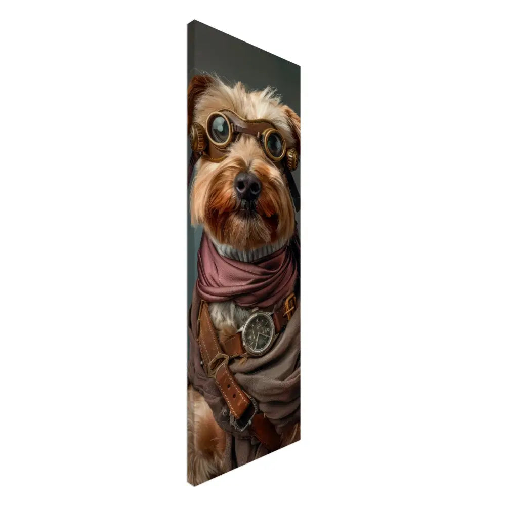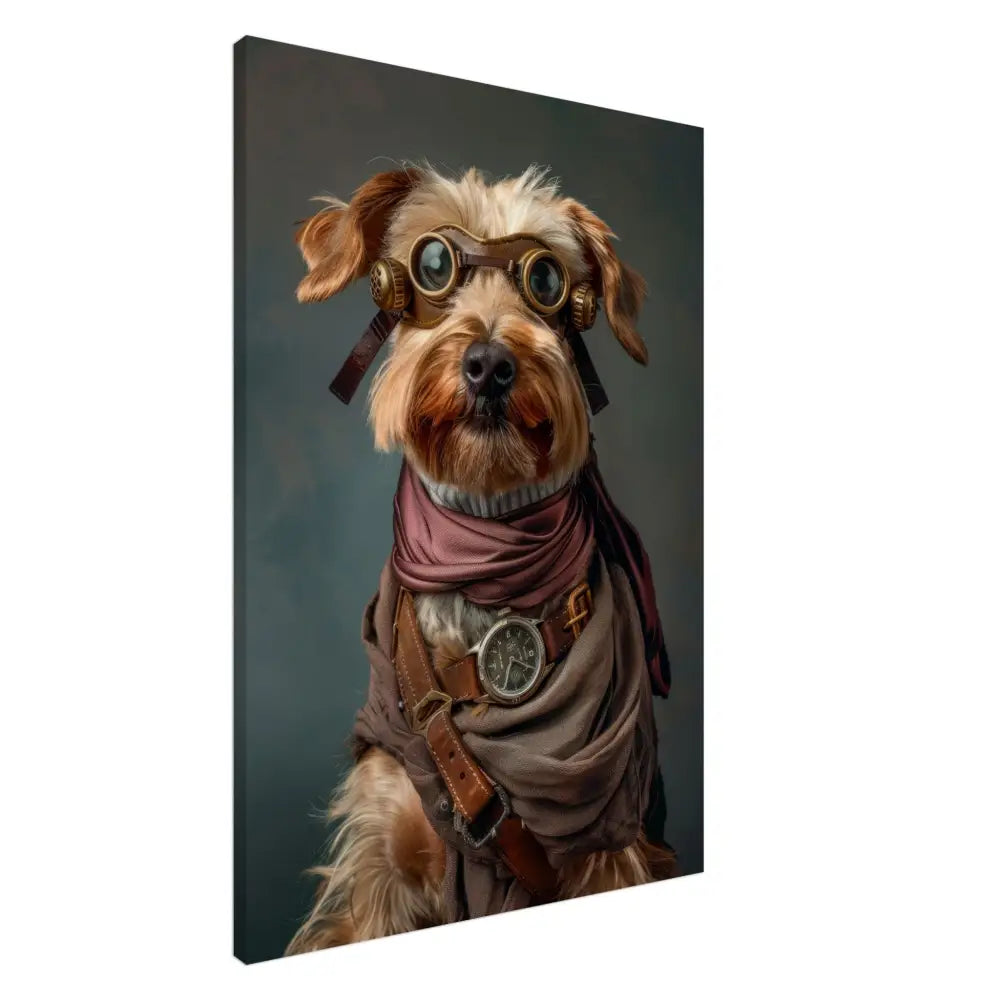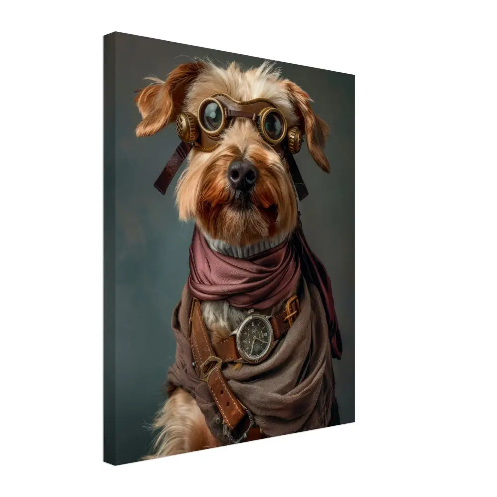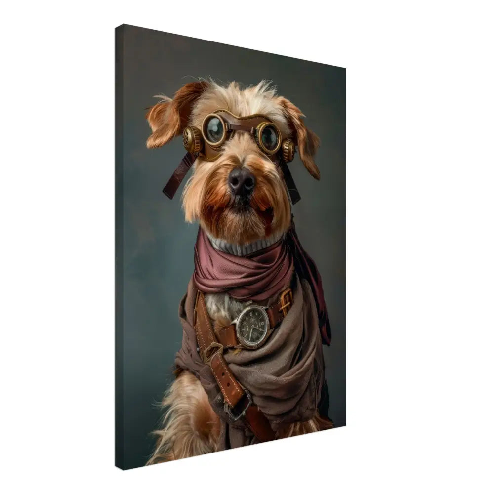 Deze afbeelding toont een dier, gekleed in een prachtige steampunk outfit. Het draagt een gedetailleerde, bruine jas die wordt versterkt door leren accenten en bronzen gespen. Om de nek hangt een antieke zilveren klok, die de avontuurlijke uitstraling benadrukt. De kop is versierd met een paar retro-futuristische brillen met metalen details in een robuuste bronzen kleur, waardoor het dier eruitziet als een tijdreiziger. De pootjes zijn voorzien van chique manchetjes in een warme, grijze tint die de algehele look verfijnen. De achtergrond voegt een mystieke sfeer toe met zijn zachte, gedempte kleuren.