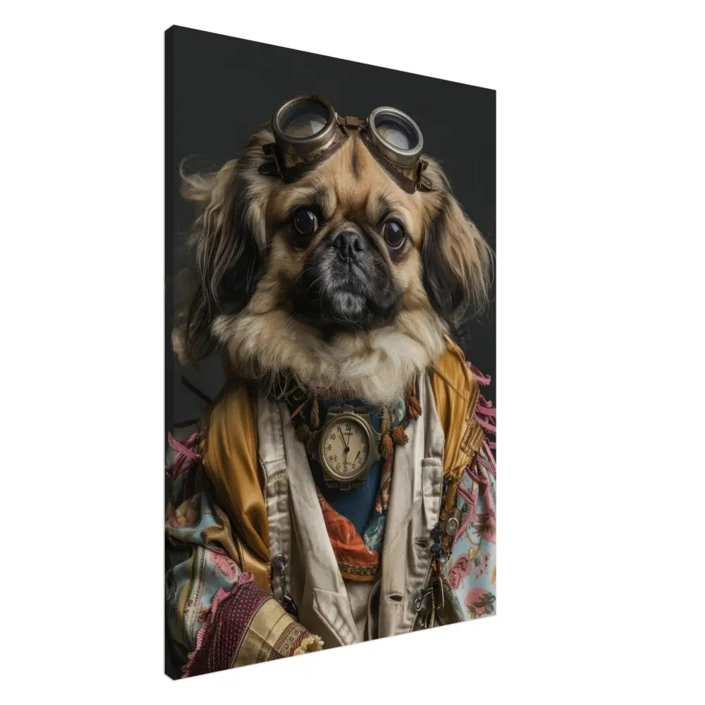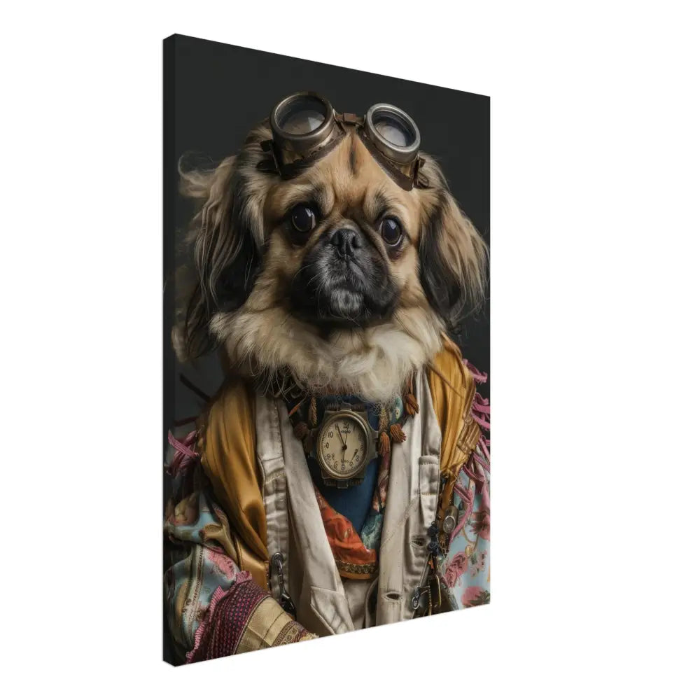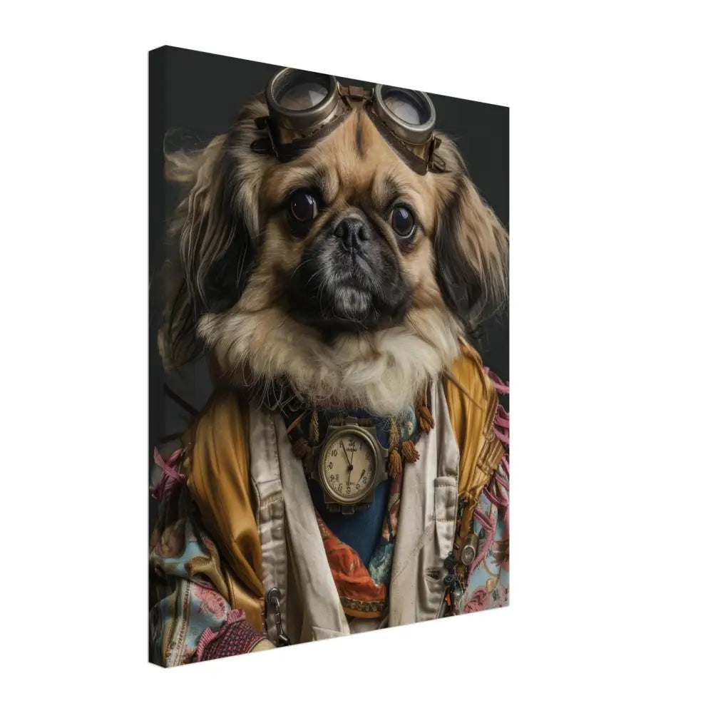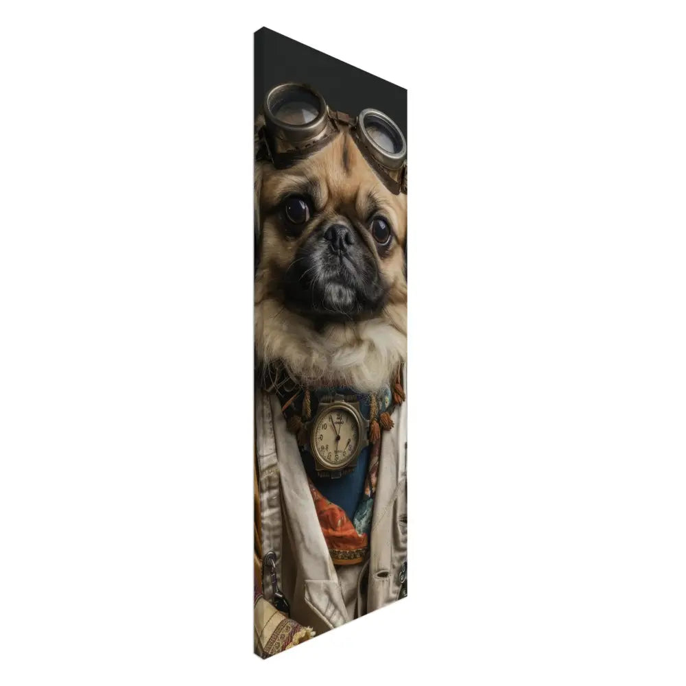 Deze afbeelding toont een dier, gekleed in een prachtige vintage steampunk outfit. Het draagt een opvallende gouden jas met kleurrijke, bloemrijke patronen en zijdeachtige accenten. Om de nek hangt een antieke, zilveren klok, die de aristocratische uitstraling versterkt. De kop wordt gesierd door een paar grote, retro-futuristische brillen met metalen details in bronskleur, die het een avontuurlijke tijdreiziger doen lijken. De pootjes zijn voorzien van elegante, bontachtige manchetjes in warme tinten. De achtergrond is donker en benadrukt het gedetailleerde kostuum, wat het geheel een mysterieuze en betoverende uitstraling geeft.