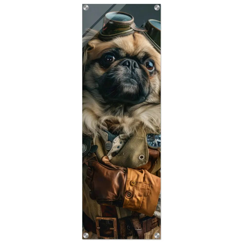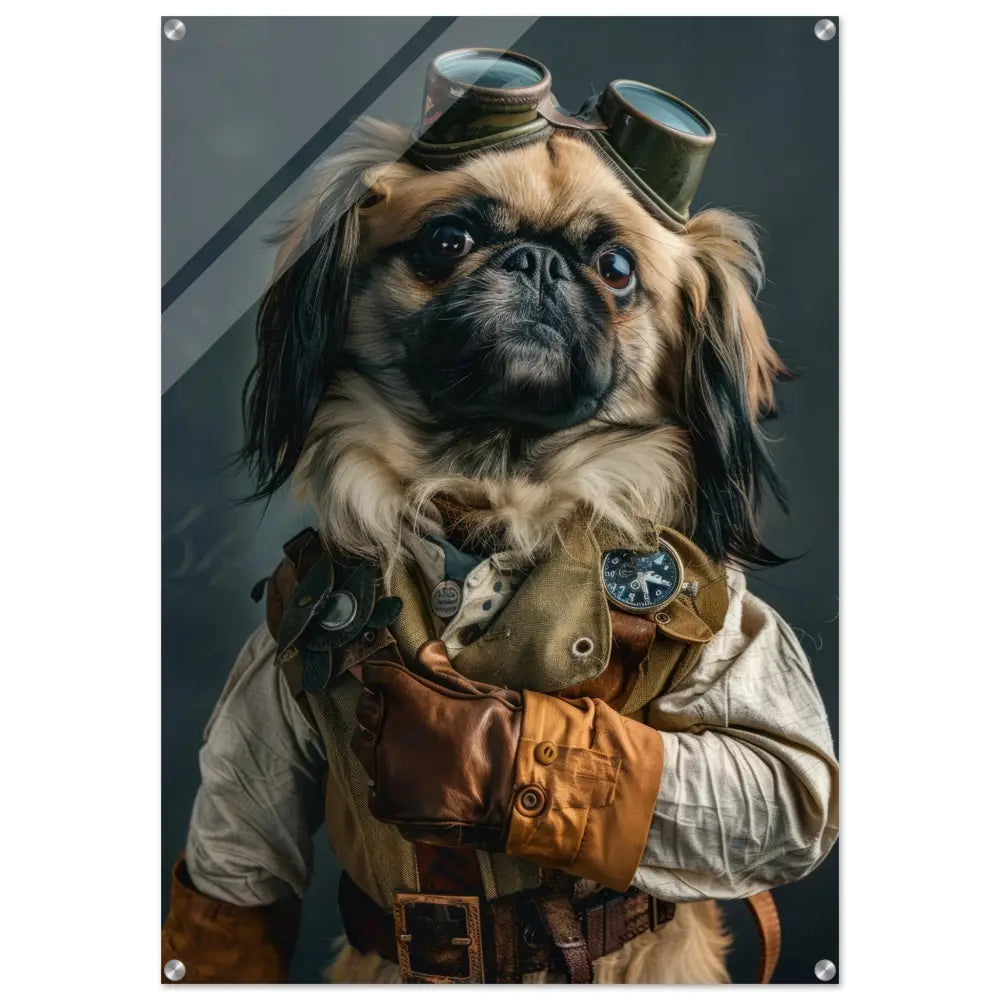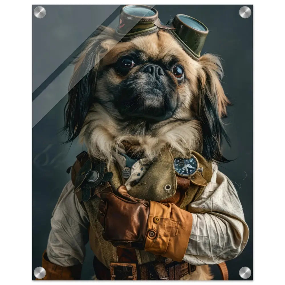 Deze afbeelding toont een dier, gekleed in een prachtige vintage steampunk outfit. Het draagt een elegante, olijfgroene jas met gedetailleerde knoopjes en lederen accenten. Om de nek hangt een antieke, zilveren klok, die een vleugje nostalgie toevoegt aan het geheel. De kop wordt gesierd door een paar stoere, bronzen brillen met glazen details, die de avontuurlijke geest weerspiegelen. De poten zijn voorzien van stijlvolle, bruine leren handschoenen met contrasterende stiksels, die het completeer. De achtergrond is donker en mysterieus, wat het steampunk-thema perfect aanvult.
