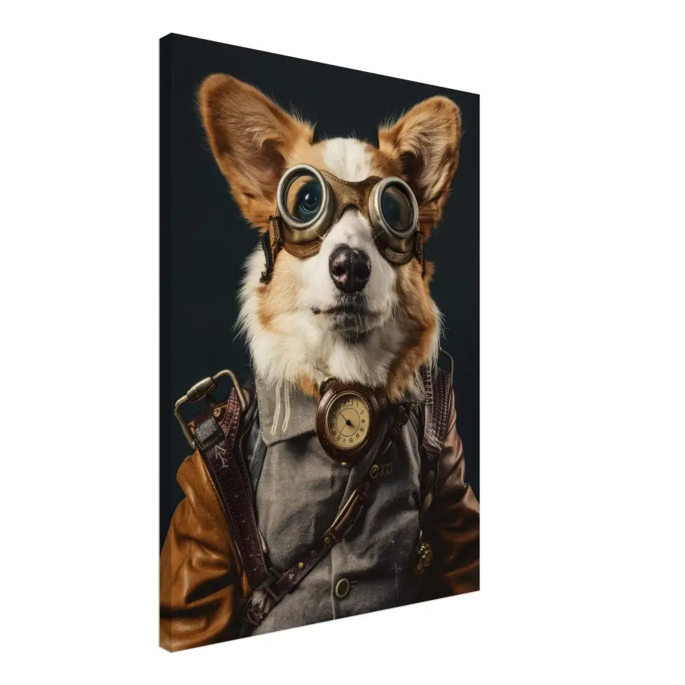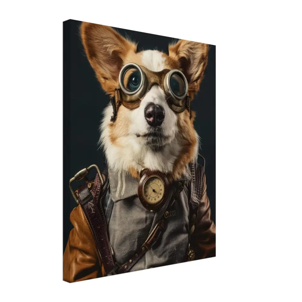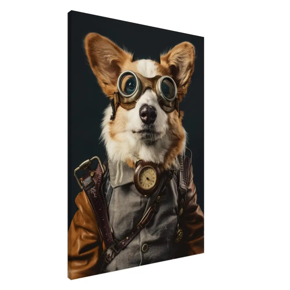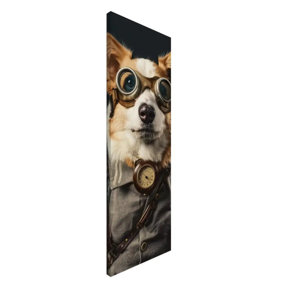 Deze afbeelding toont een dier, gekleed in een prachtige vintage steampunk outfit. De hond draagt een stijlvolle, grijze jas met knopen en leren accenten aan de schouders en borst. Om de nek hangt een antieke bronzen klok, die een vleugje elegantie toevoegt. Op het hoofd prijkt een imposante, retro-futuristische bril met zilverkleurige metalen details, wat het karakter van een tijdreiziger benadrukt. De poten zijn voorzien van subtiele, lederen riemen die de avontuurlijke uitstraling afronden. De achtergrond is donker en ingetogen, waardoor de expressieve outfit nog meer opvalt. Deze afbeelding straalt zowel elegantie als avontuur uit in een perfecte steampunk-stijl.