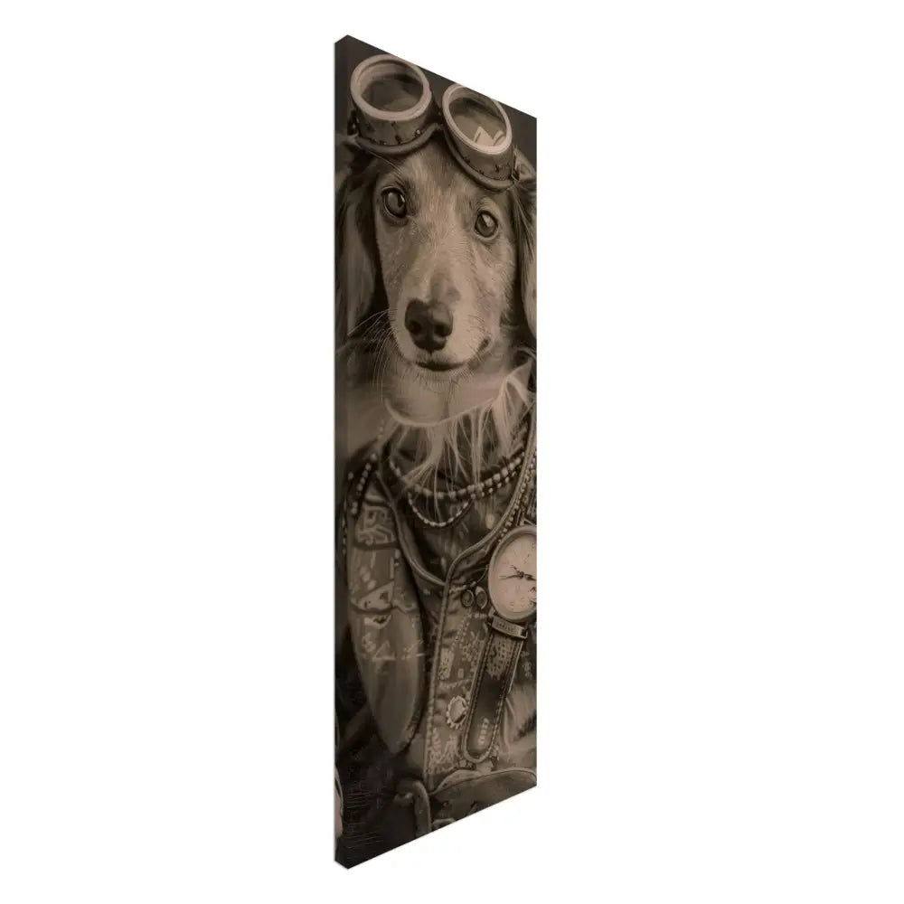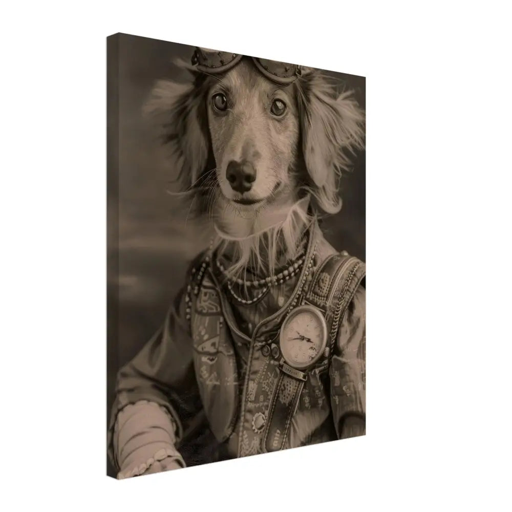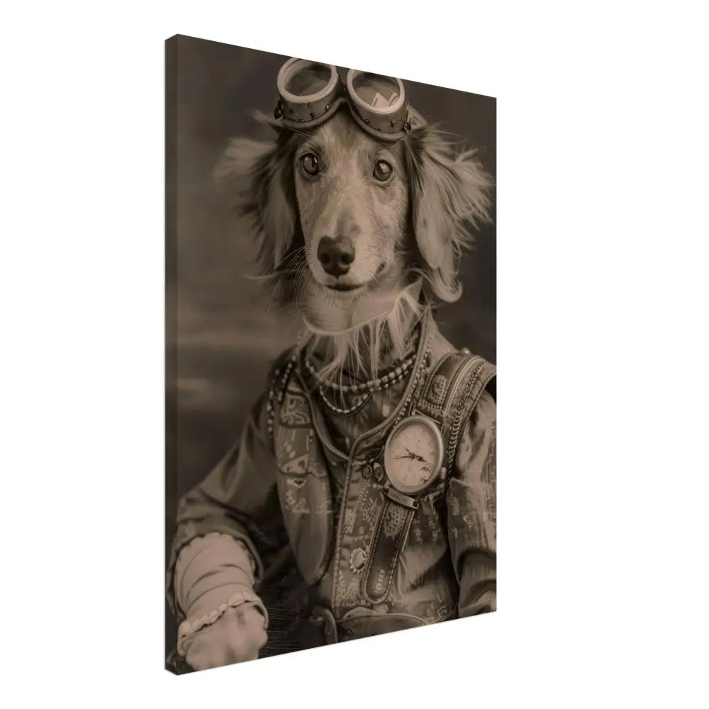 Deze afbeelding toont een dier, gekleed in een prachtige vintage steampunk outfit. Het draagt een sierlijke, beige jas met ingewikkelde patronen en metalen accenten. Om de nek hangt een antieke gouden klok, die de aristocratische uitstraling versterkt. Het hoofd wordt gesierd door een paar grote, retro-futuristische brillen met metalen details in roestkleur, waardoor deze eruitziet als een avontuurlijke tijdreiziger. De pootjes zijn voorzien van elegante, witte bontachtige manchetjes die het geheel afmaken. De achtergrond is mystiek, met wazige wolken en een zachte, gefilterde lichtval.