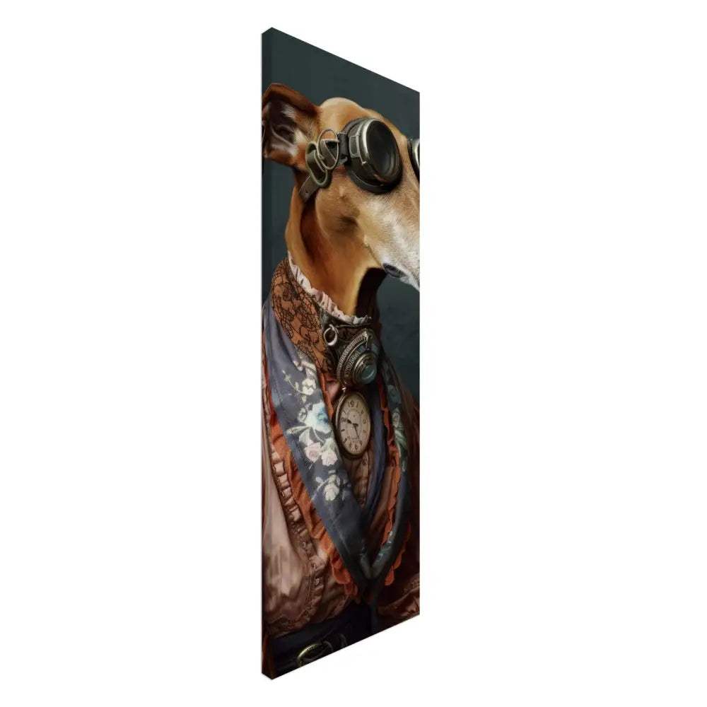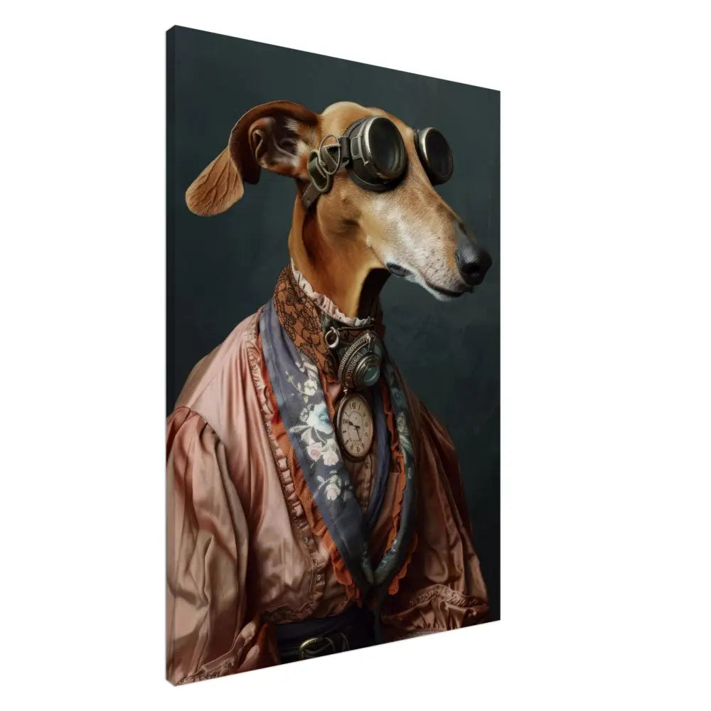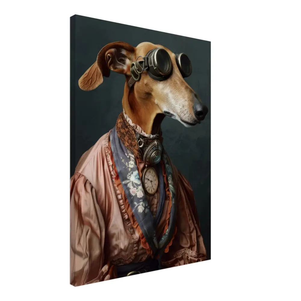 Deze afbeelding toont een dier, gekleed in een prachtige vintage steampunk outfit. Het draagt een elegante, perzikkleurige jas met sierlijke plooien en delicate kanten accenten. Om de nek hangt een antieke zilveren klok, die subtiel tegen de jas afsteekt. De kop wordt gesierd door een paar grote, retro-futuristische brillen met metalen details in een donkere bronstint, wat het geheel een avontuurlijke uitstraling geeft. De pootjes zijn voorzien van contrasterende, lichtblauwe sjaals met bloemenpatronen die de outfit aanvullen. De achtergrond toont een industriële, donkergrijze textuur, wat de steampunk sfeer compleet maakt.
