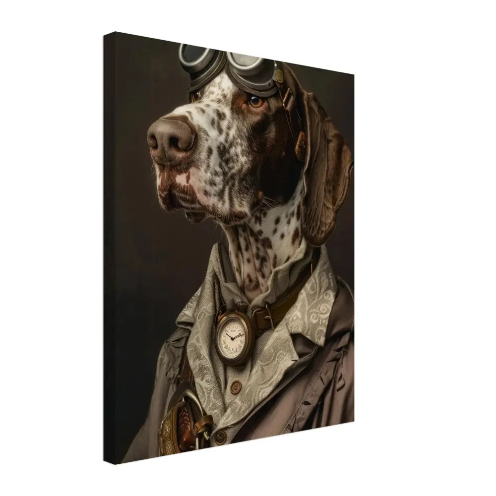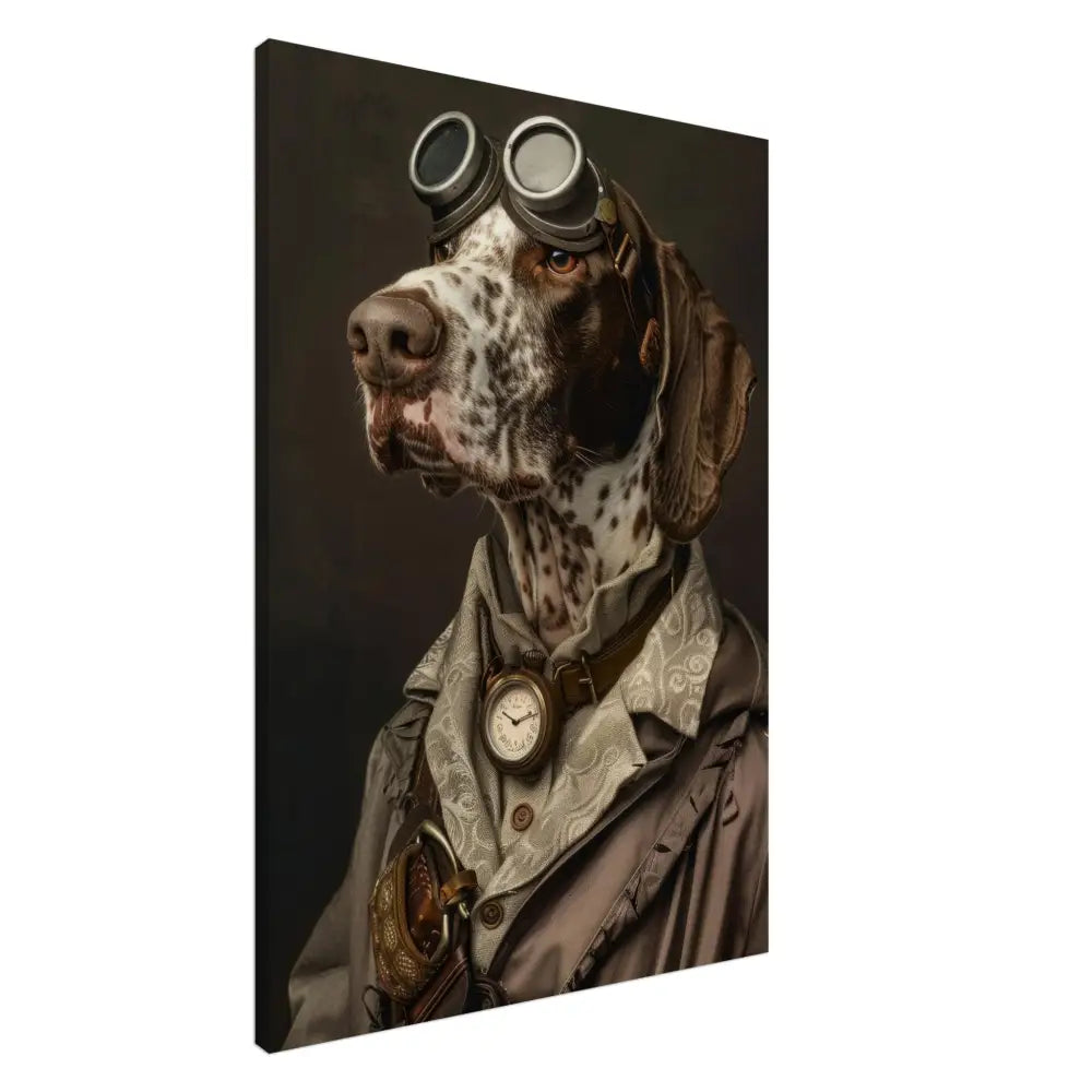 Deze afbeelding toont een dier, gekleed in een prachtige vintage steampunk outfit. Het draagt een elegante, grijsbruine jas met verfijnde patronen en knopen waar subtiele gouden accenten in zijn verwerkt. Om de nek hangt een antieke bronzen klok, die het geheel een koninklijke uitstraling geeft. Op het hoofd staat een retro-futuristische bril met robuuste metalen details in een zilveren tint, wat een avontuurlijke sfeer creëert. De pootjes zijn voorzien van leren accenten en de zoom van de jas heeft contrasterende stiksels. De achtergrond is donker en mysterieus, wat het fantastische steampunk-thema versterkt.