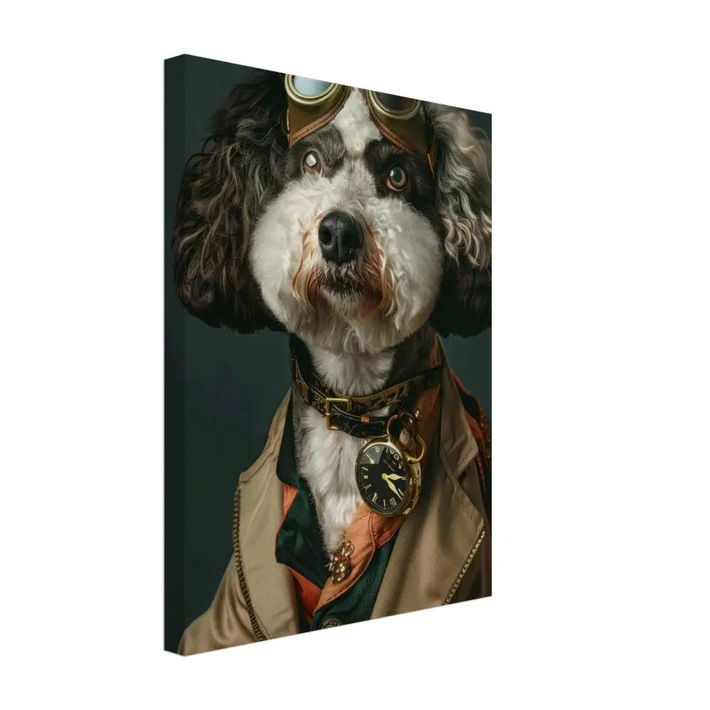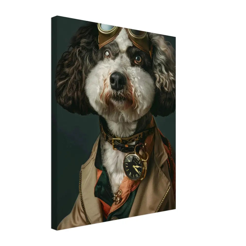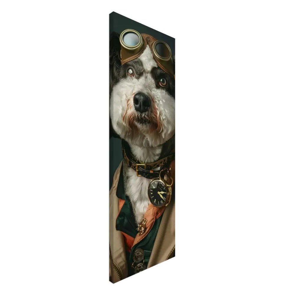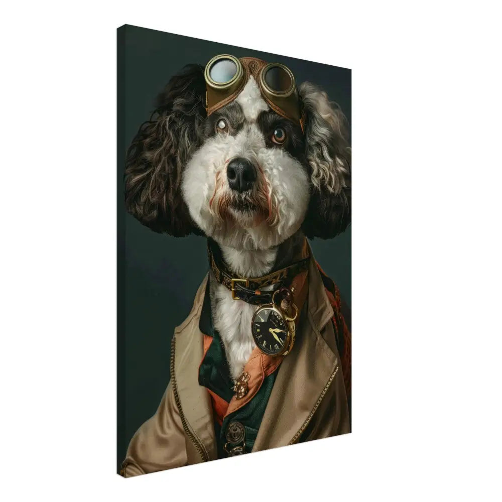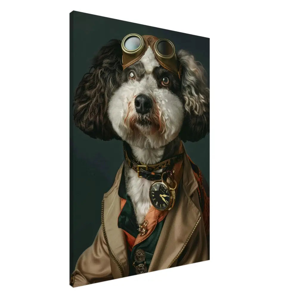 Deze afbeelding toont een dier, gekleed in een prachtige vintage steampunk outfit. De hond draagt een elegante, beige jas met subtiele stiksels en bronzen accenten, die perfect past bij zijn avontuurlijke uitstraling. Om zijn nek hangt een antieke gouden klok, wat een verfijnd klassiek detail toevoegt. Zijn kop is versierd met een paar grote, retro-futuristische brillen met bronzen metalen details, wat een zekere charme en mysterie toevoegt. De pootjes zijn voorzien van stijlvolle, bruin-lederen accenten die het geheel afmaken. De achtergrond is eenvoudig en onopvallend, waardoor alle aandacht naar deze steampunk-held gaat.