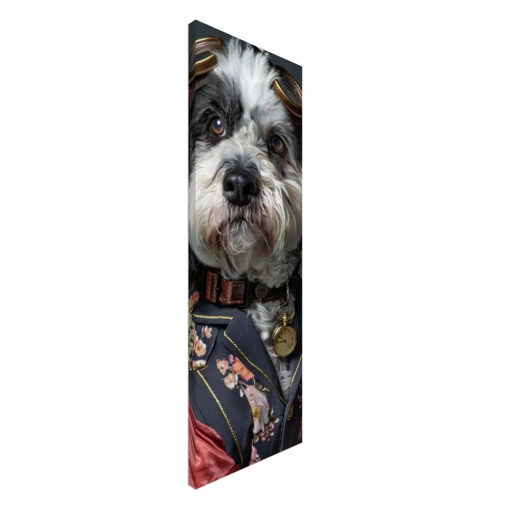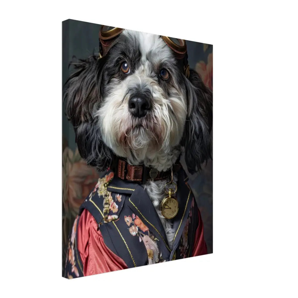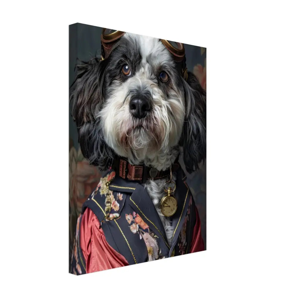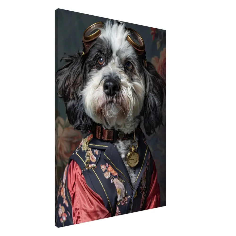 Deze afbeelding toont een dier, gekleed in een prachtige vintage steampunk outfit. Het draagt een elegante, zwart met bloemenversierde jas met gouden patronen en zijden rode accenten. Om de nek hangt een antieke gouden klok, die de aristocratische uitstraling versterkt. De kop wordt gesierd door een paar grote, retro-futuristische brillen met metalen details in bronskleur, waardoor deze eruitziet als een avontuurlijke tijdreiziger. De pootjes zijn voorzien van subtiele, leren accenten met contrasterende stiksels die het geheel afmaken. De achtergrond is versierd met romantische bloemenpatronen, die de afbeelding extra charme geven.