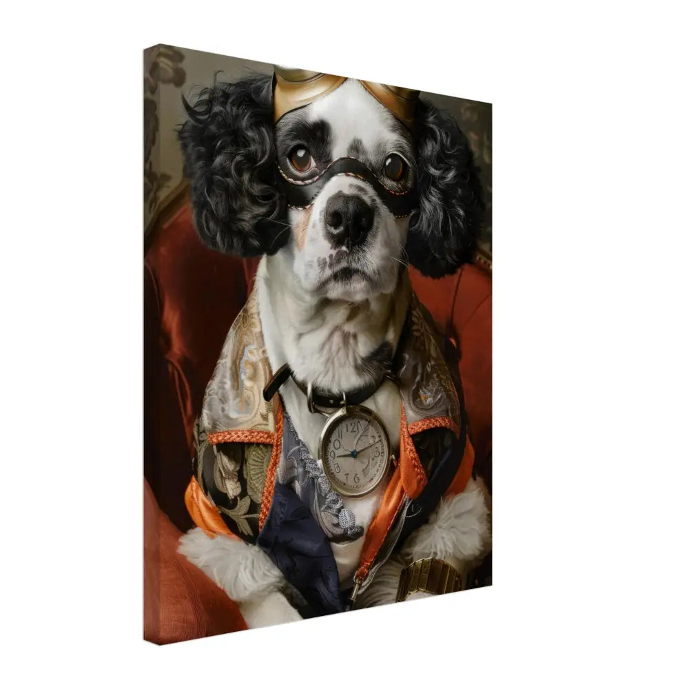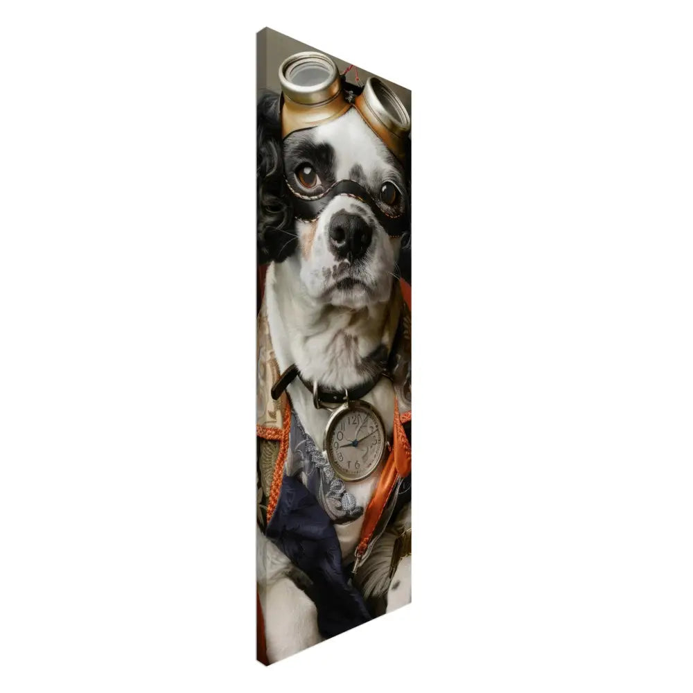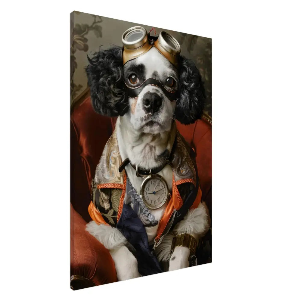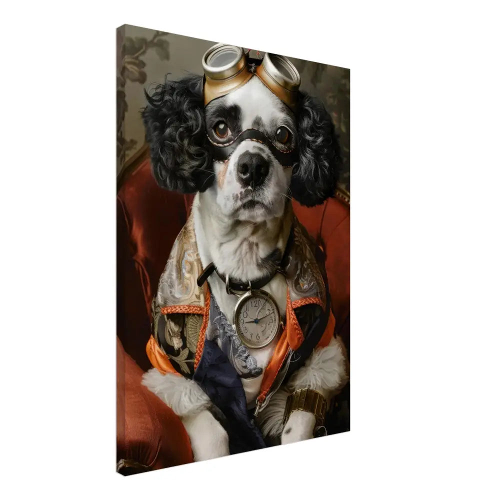 Deze afbeelding toont een dier, gekleed in een prachtige vintage steampunk outfit. Het draagt een sierlijke, rijkelijk versierde jas in koninklijk blauw met gouden borduursels en koperkleurige accenten. Om de nek hangt een antieke, zilveren klok, die de aristocratische uitstraling versterkt. De kop wordt gesierd door een paar grote, retro-futuristische brillen met bronzen metalen details, waardoor deze eruitziet als een avontuurlijke tijdreiziger. De pootjes zijn voorzien van elegante, witte bontachtige manchetjes en leren accenten die het geheel afmaken. De achtergrond wordt gesierd door romantisch bloemenbehang dat de vintage sfeer benadrukt.