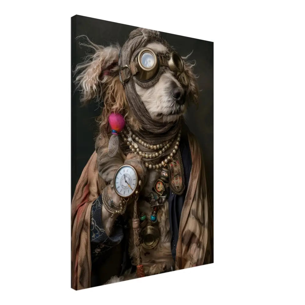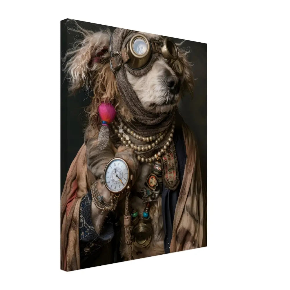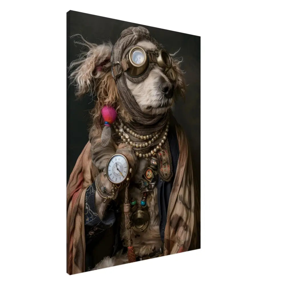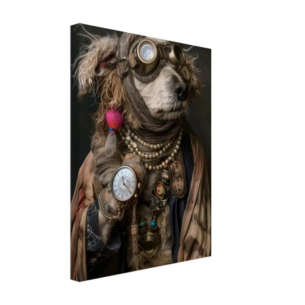 Deze afbeelding toont een dier, gekleed in een prachtige vintage steampunk outfit. Het dier draagt een elegante, veelkleurige jas met subtiele patronen en rijke, fluwelen accenten. Om de nek hangt een antieke, goudkleurige klok, die de verfijnde uitstraling benadrukt. Het hoofd is gesierd met een paar grote, bronzen retro-futuristische brillen met gedetailleerde metalen afwerkingen, wat een avontuurlijke en mysterieuze look geeft. De manchetjes zijn voorzien van zachte, bonte details die samen met leren accenten en contrasterende stiksels het geheel compleet maken. De achtergrond is donker en elegant, met subtiele art-deco patronen die de vintage stijl versterken.