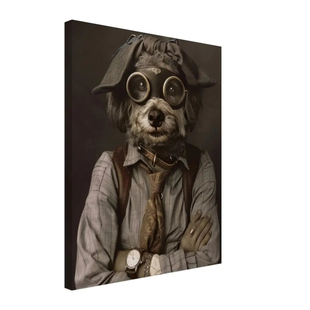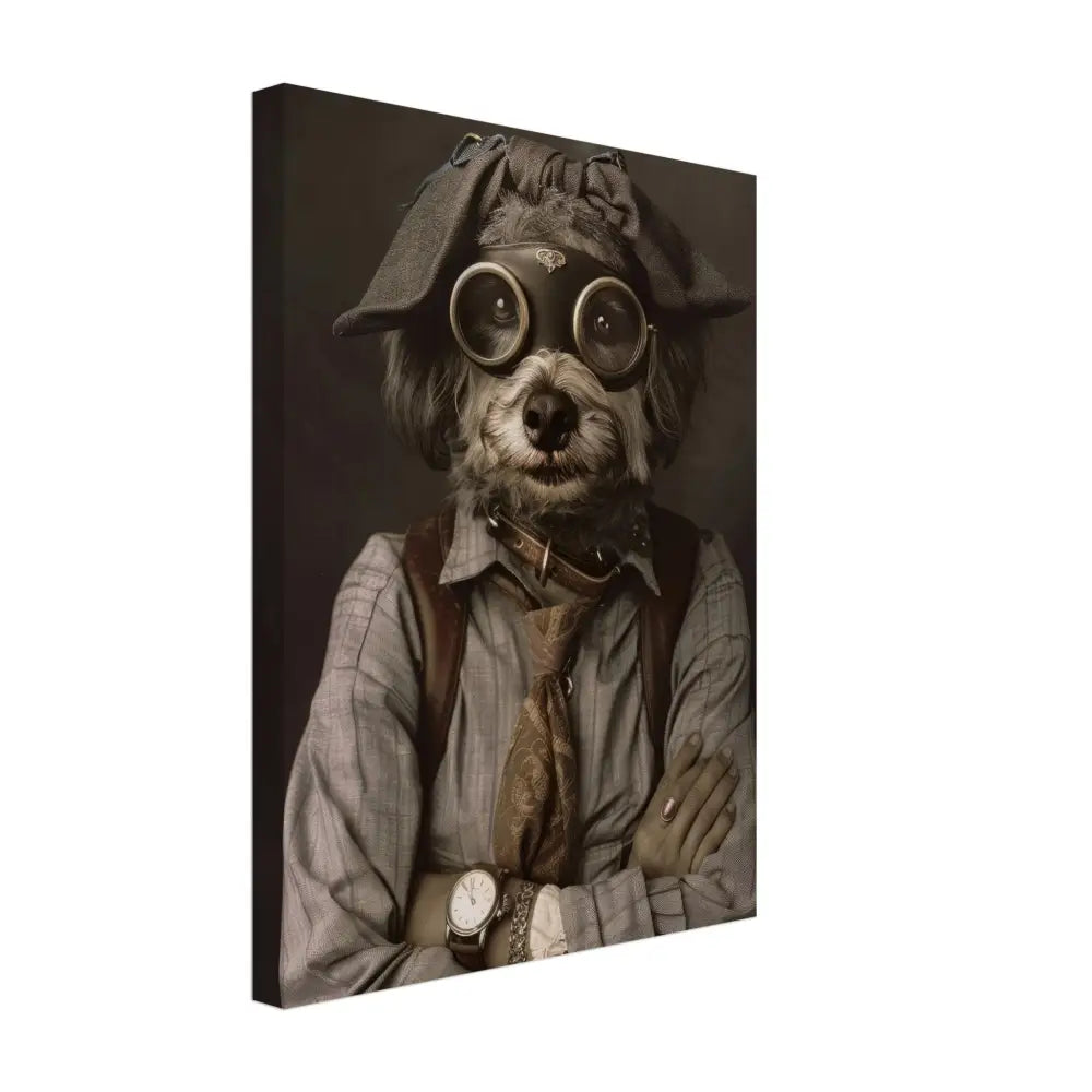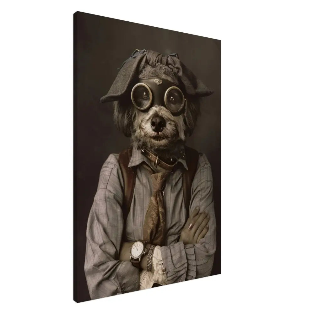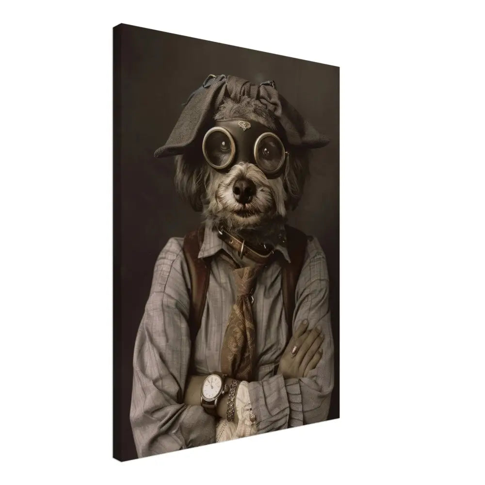 Deze afbeelding toont een hond, gekleed in een prachtige vintage steampunk outfit. Het dier draagt een elegante, grijze jas met subtiele lijnen en klassieke accenten. Om de nek hangt een antieke goudkleurige klok, die voor een tijdloze allure zorgt. De kop wordt gesierd door een paar grote, metalen brillen met zilveren rand, waardoor een eigenwijze, maar charmante uitstraling ontstaat. De pootjes zijn voorzien van verfijnde, crème-kleurige bontachtige manchetjes en rustieke leren accenten met gedetailleerde stiksels. De achtergrond is donker en mysterieus, wat de nadruk legt op de dromerige en avontuurlijke sfeer van de afbeelding.