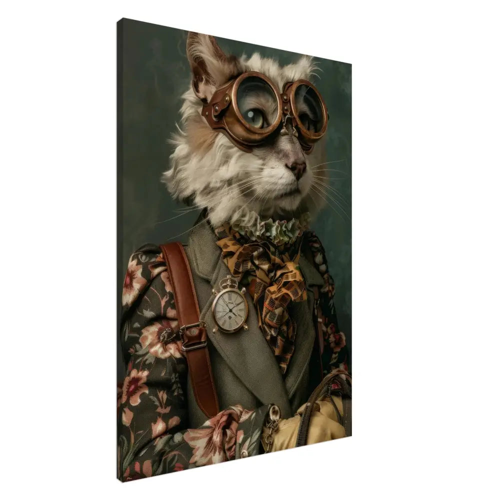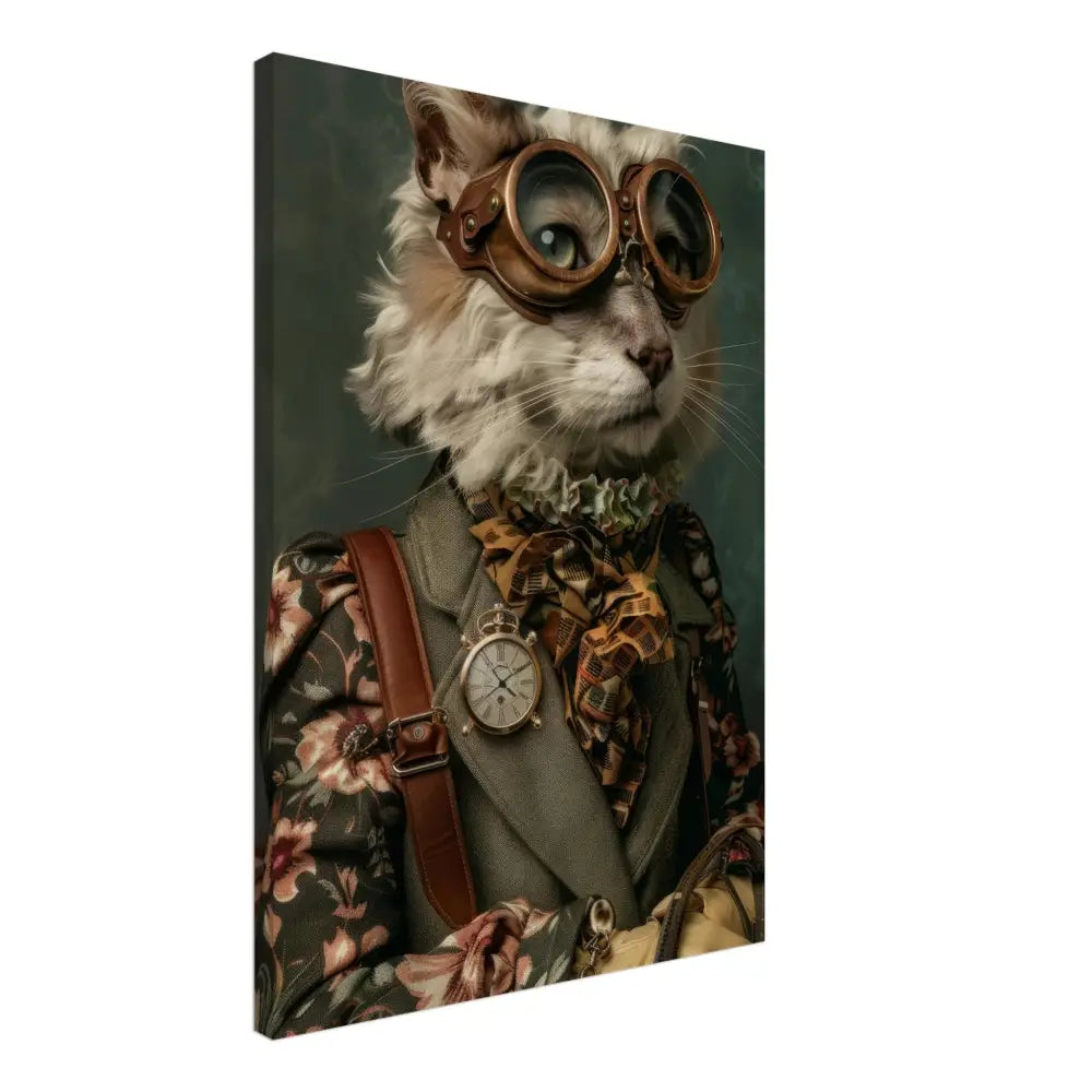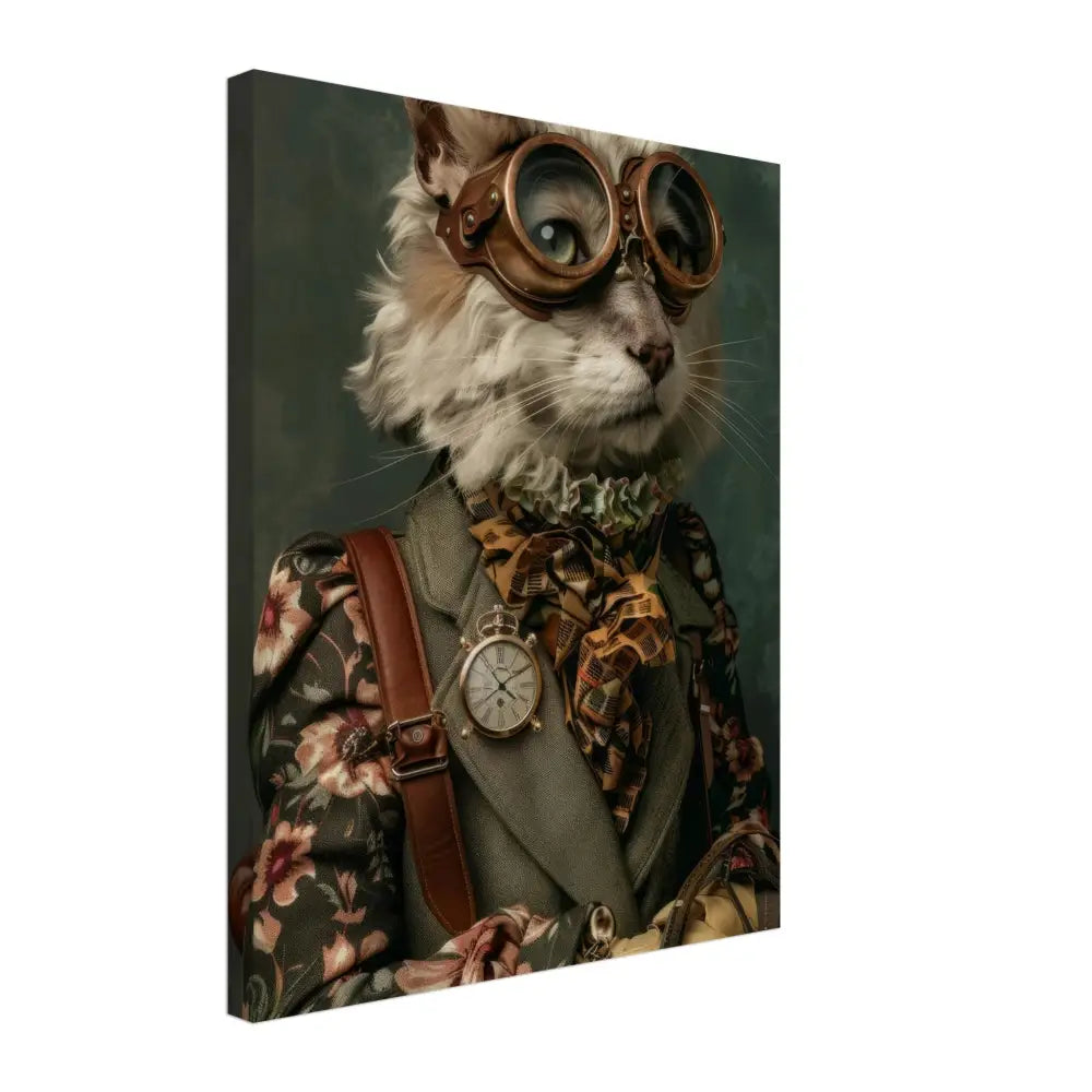 Deze afbeelding toont een kat, gekleed in een prachtige vintage steampunk outfit. Het draagt een chique, bloemenmotief jas met levendige kleuren en verfijnde accenten. Om de nek hangt een antieke gouden klok, wat de elegante uitstraling versterkt. De kop wordt gesierd door een grote, retro-futuristische bril met bronzen metalen details, waardoor de kat eruitziet als een avontuurlijke tijdreiziger. De pootjes zijn voorzien van delicate, crèmekleurige bontachtige manchetjes die het geheel afmaken. De achtergrond is versierd met een prachtig, gedetailleerd patroon in zachte groentinten, wat het romantische karakter van de afbeelding accentueert.