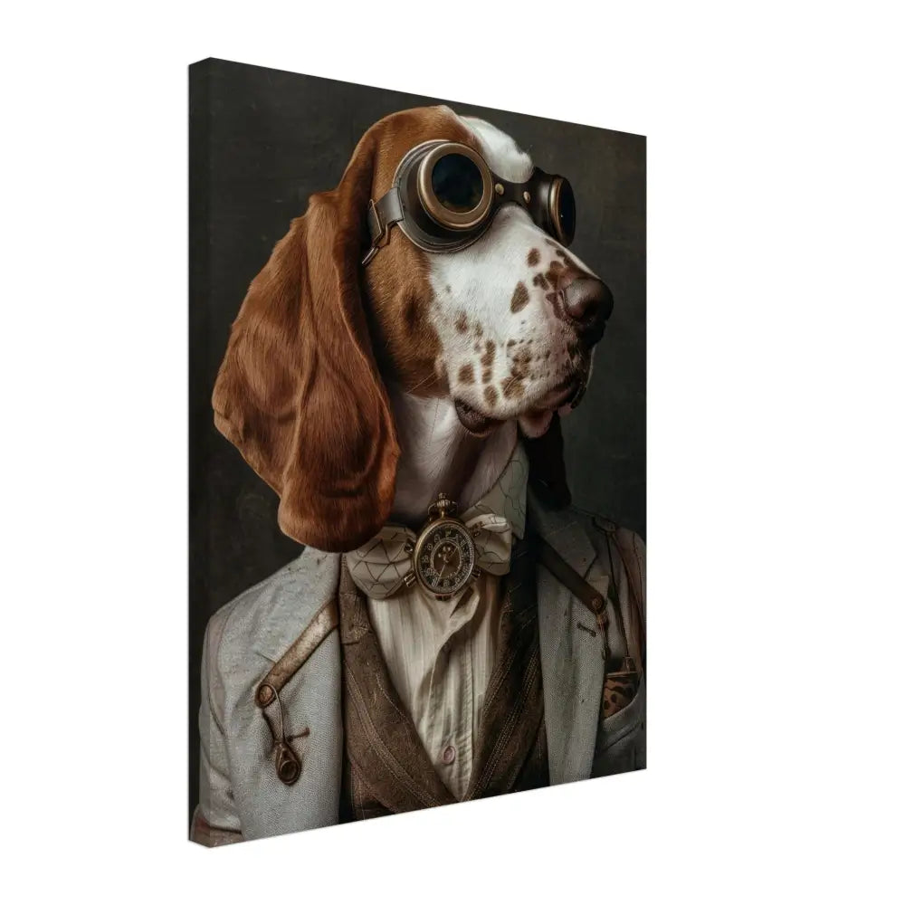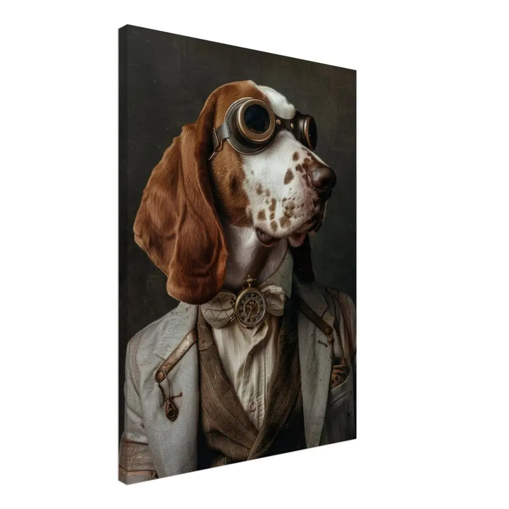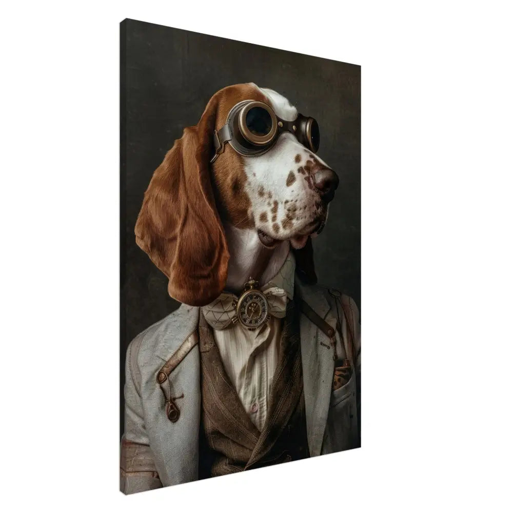Deze afbeelding toont een hond, gekleed in een prachtige vintage steampunk outfit. De hond draagt een gedistingeerde, grijze jas met subtiele stiksels en leren accenten op de schouders. Om de nek hangt een antieke, gouden klok met een sierlijke wijzerplaat, die de elegante uitstraling van de hond benadrukt. Op het hoofd prijkt een retro-futuristische bril met bronzen metalen details, perfect passend bij de steampunk-stijl. Bontachtige manchetjes sieren de voorpoten van de hond en voegen een vleugje verfijning toe. De achtergrond is ingetogen en donker, wat de focus op het met zorg samengestelde kostuum versterkt.