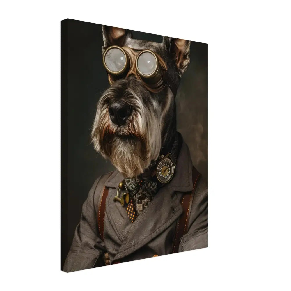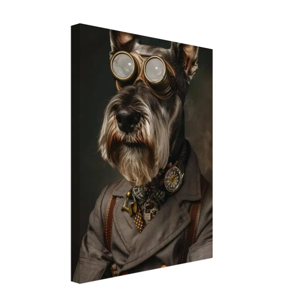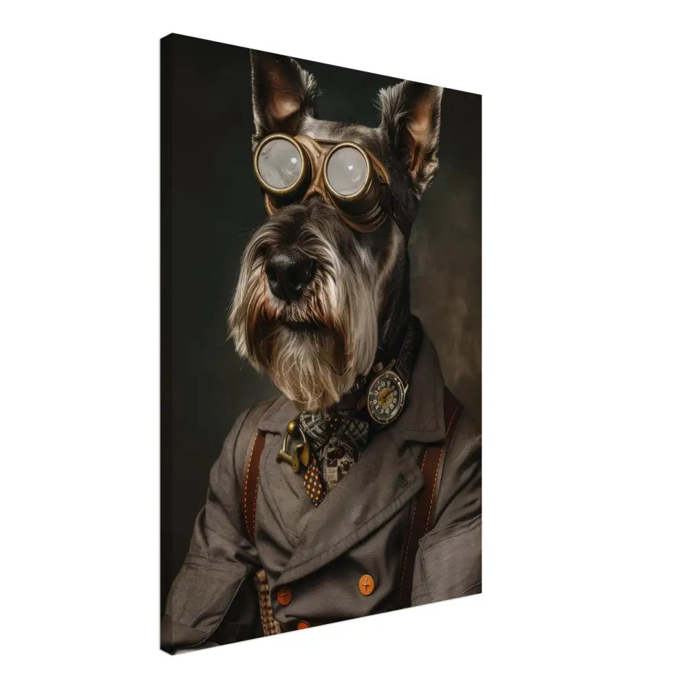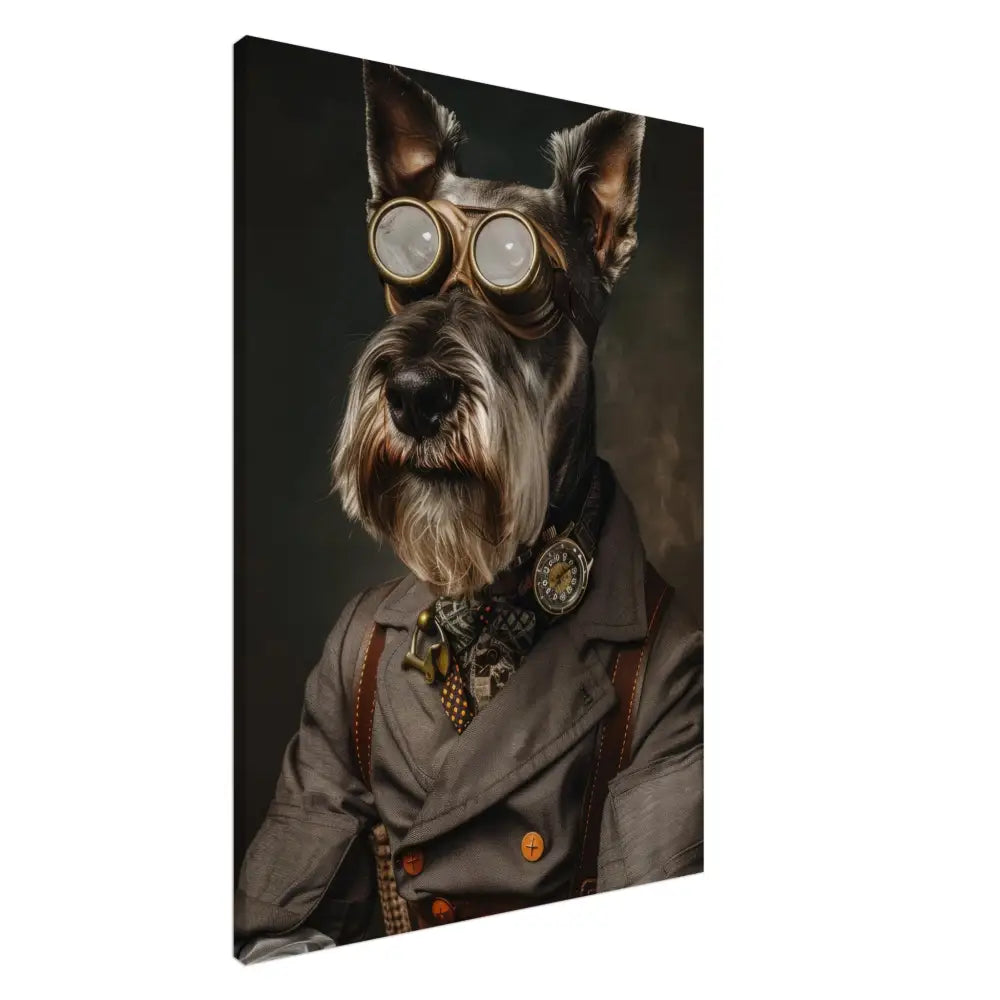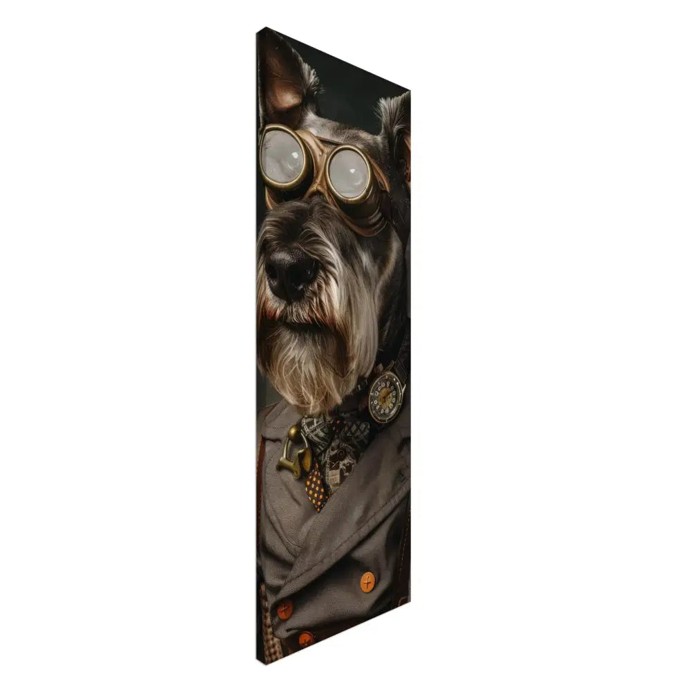 Deze afbeelding toont een dier, gekleed in een prachtige vintage steampunk outfit. Het draagt een elegante, grijze jas met subtiele ruitjespatronen en koperen accenten. Om de nek hangt een antieke bronzen klok, die subtiel glinstert. De kop wordt geaccentueerd door een paar grote, opvallende metalen brillen met gouden details, waardoor deze eruitziet als een avontuurlijke ontdekkingsreiziger. De pootjes zijn voorzien van stijlvolle, leren manchetjes en contrasterende stiksels, die de verfijnde look compleet maken. De achtergrond is donker en mysterieus, met een subtiele rookachtig effect, wat de steampunk-sfeer verder versterkt.