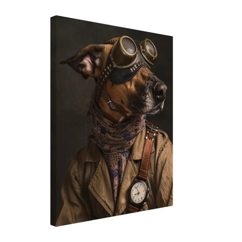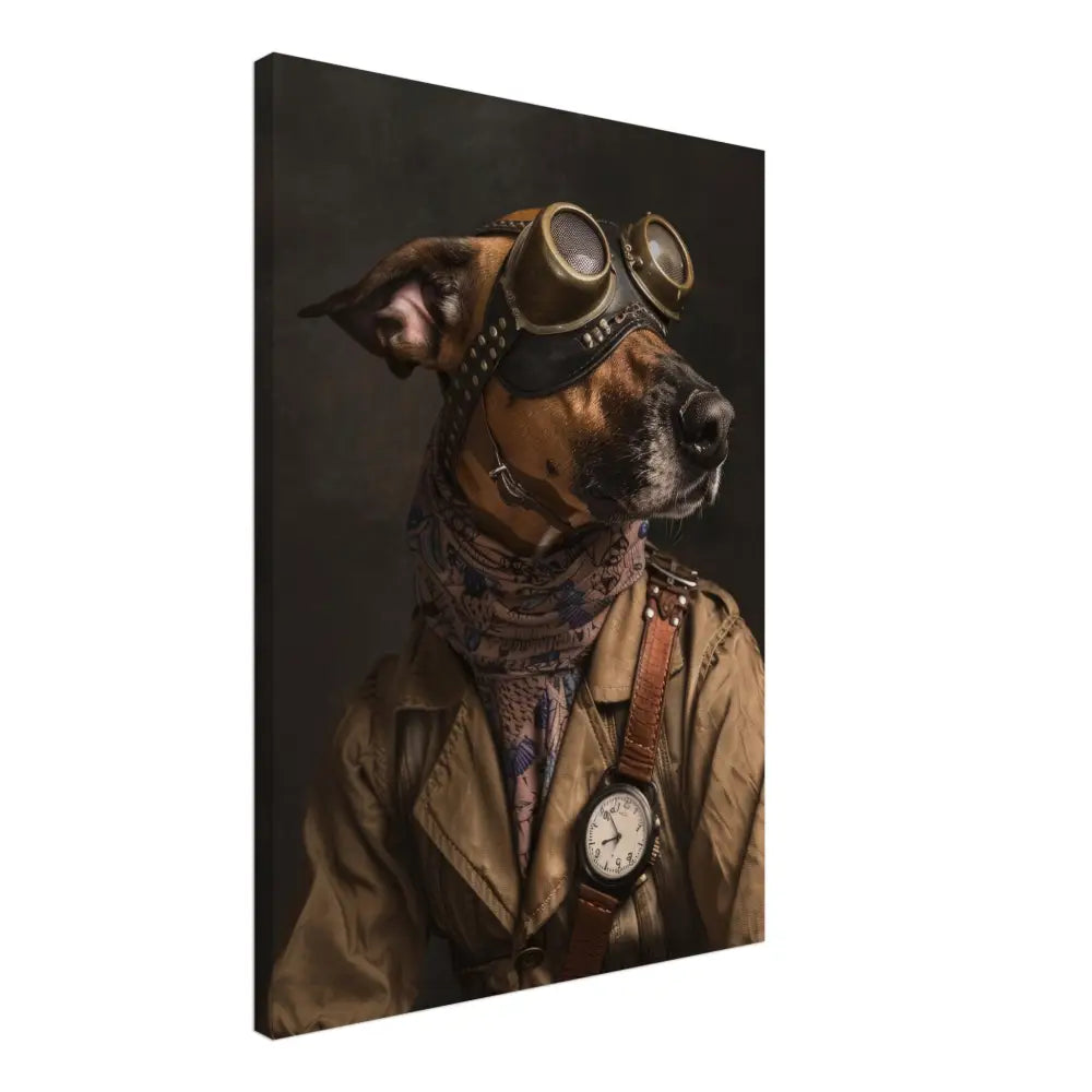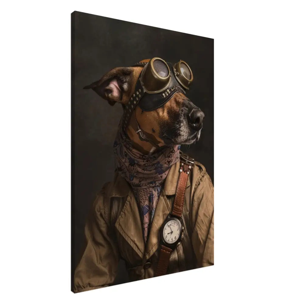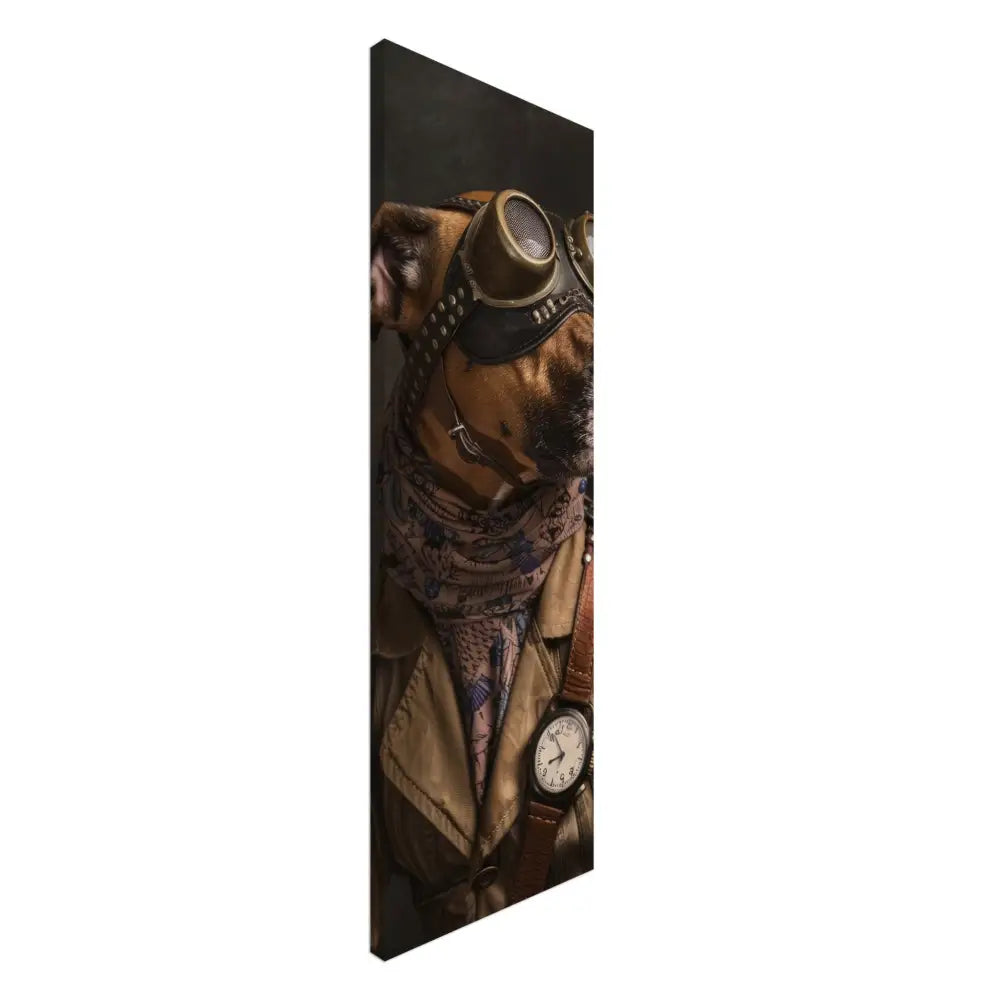 Deze afbeelding toont een dier, gekleed in een prachtige vintage steampunk outfit. Het draagt een stijlvolle, bruin-beige jas met subtiele strepen en leren details op de schouders. Om de nek hangt een antieke klok met een wit wijzerplaat en een zwarte ring, die de steampunk sfeer versterkt. De kop wordt gesierd door een paar grote, bronzen retro-futuristische brillen met sierlijke metalen accenten, die het een avontuurlijke uitstraling geven. Extra accessoires zoals manchetjes van krijtpatronen stof en een leren schouderriem met contrasterende stiksels voegen een stoere maar elegante touch toe. De donkerbruine achtergrond draagt bij aan de mysterieuze en historische ambiance.
