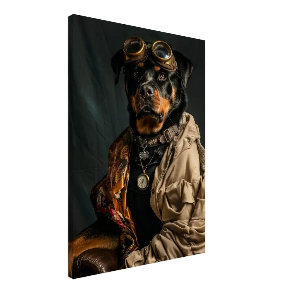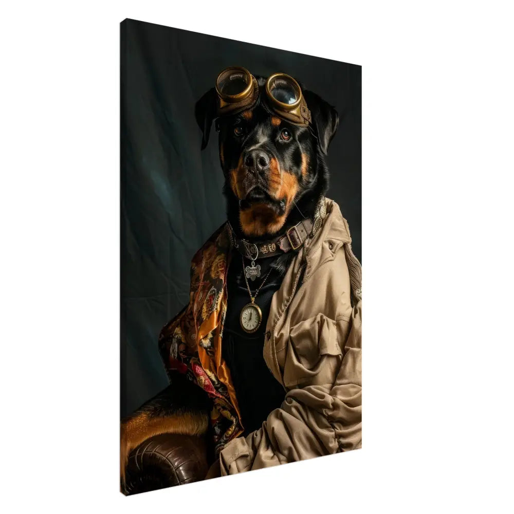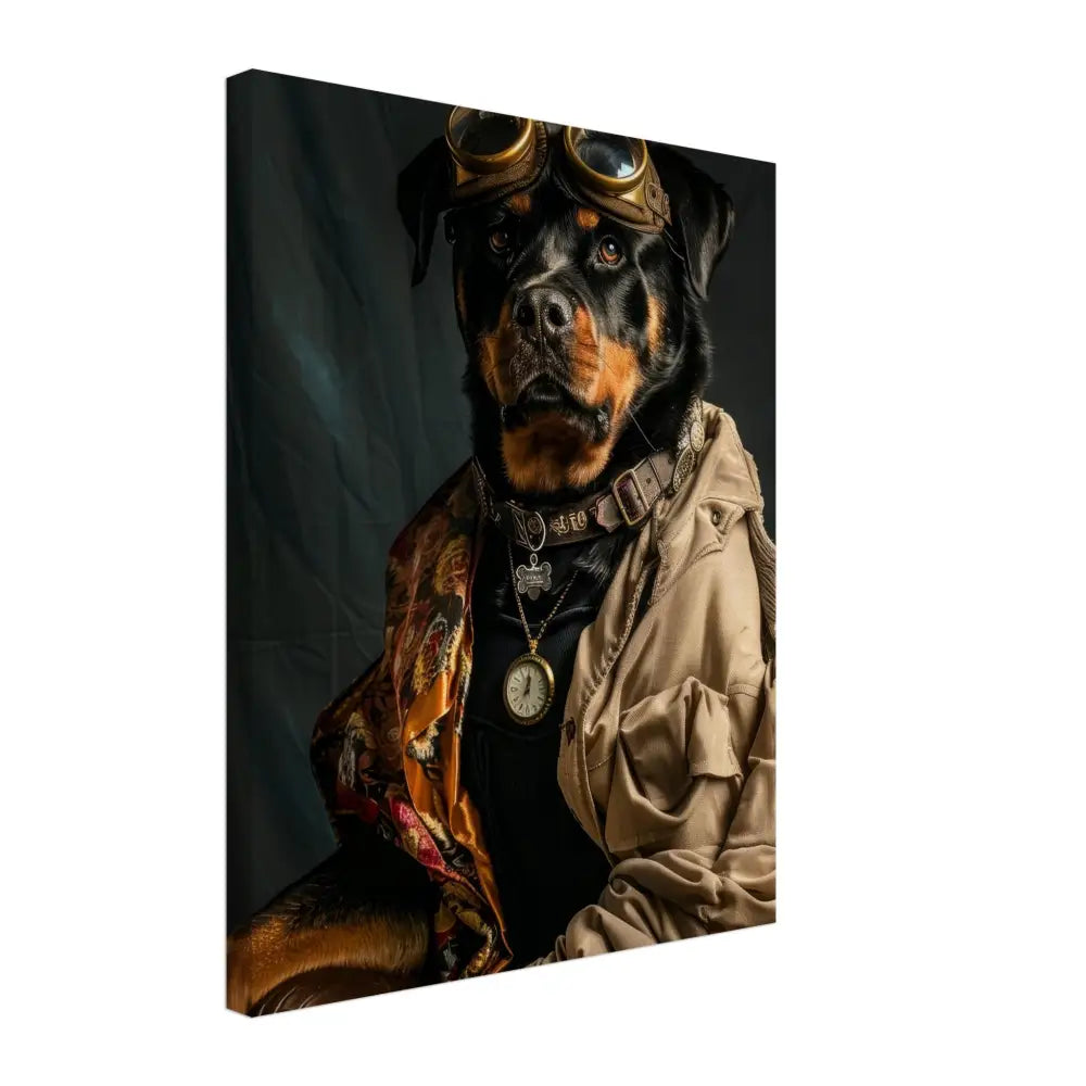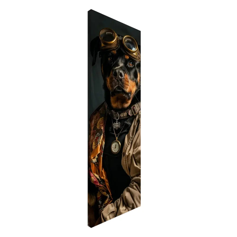 Deze afbeelding toont een dier, gekleed in een prachtige vintage steampunk outfit. Het draagt een stijlvolle beige jas met subtiele patronen en leren accenten die een klassieke uitstraling creëren. Om de nek hangt een antieke gouden klok, die nauwkeurig in het ontwerp is verwerkt en een vleugje elegantie toevoegt. De kop is voorzien van een paar robuuste, bronzen brillen met metalen details, waardoor deze een gedistingeerde en avontuurlijke look krijgt. De pootjes zijn afgezet met luxe, bruisend oranje bontachtige manchetjes en contrasterende stiksels. De achtergrond is ingetogen, met donkere, mysterieuze tinten, wat de focus volledig op het prachtig uitgedoste dier legt.