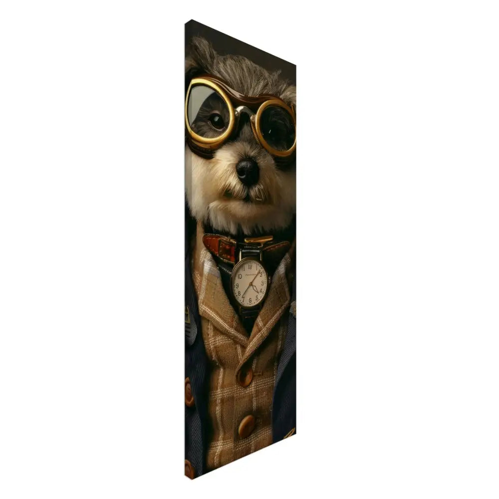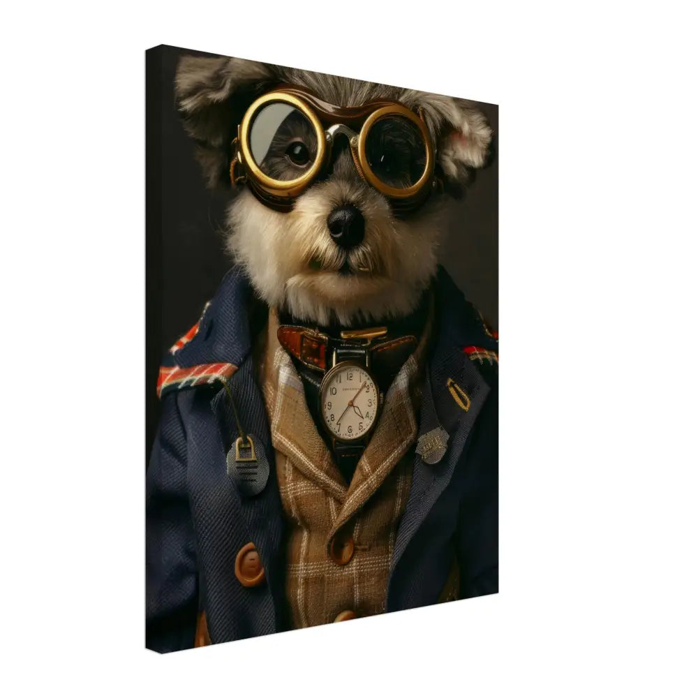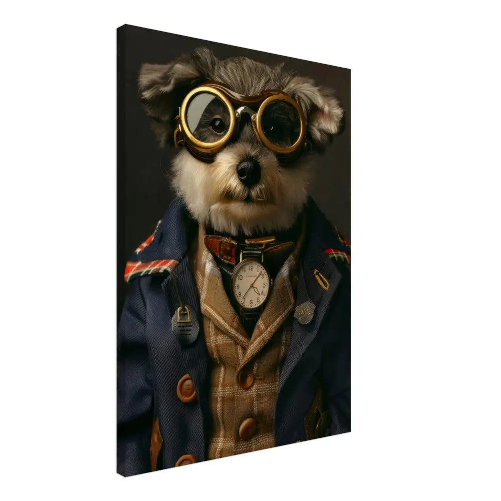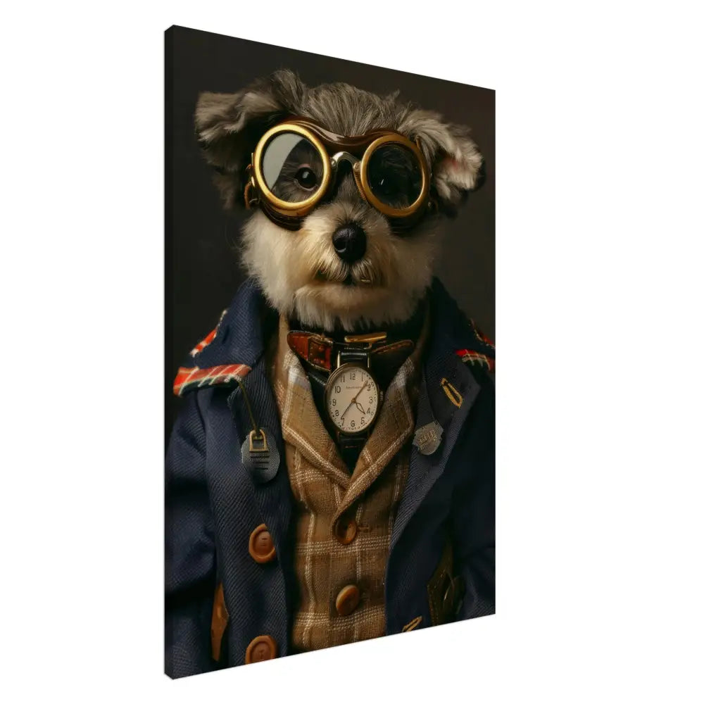 Deze afbeelding toont een dier, gekleed in een prachtige vintage steampunk outfit. Het draagt een stijlvolle, donkerblauwe jas met geruite details en goudgekleurde accenten. Om de nek hangt een klassieke, witte antieke klok, die de charme van weleer uitstraalt. Op het hoofd prijkt een grote bril met metalen details in koperkleur, die een lucht van avontuur en tijdreizen oproept. De pootjes zijn afgewerkt met leren accenten en contrasterende stiksels, terwijl het geheel wordt versterkt door de subtiele vintage achtergrond die de visuele pracht aanvult.