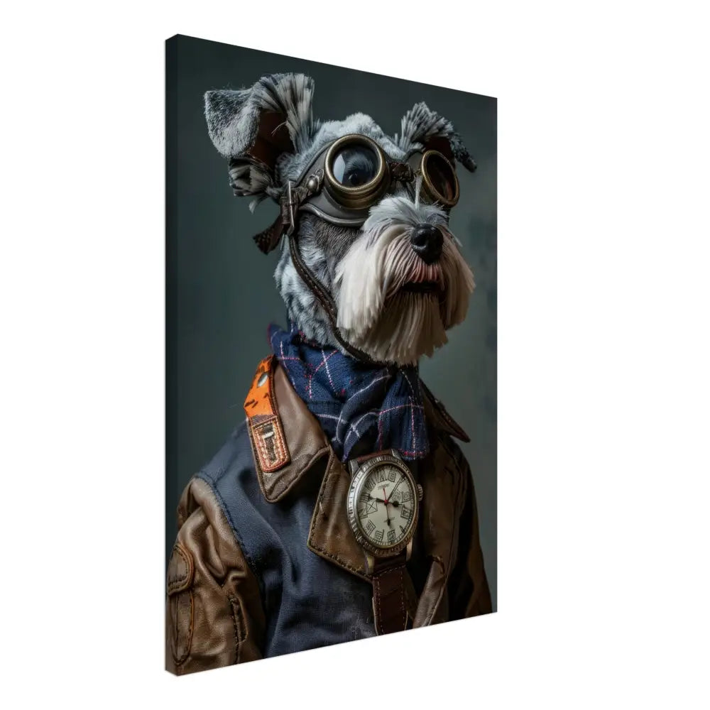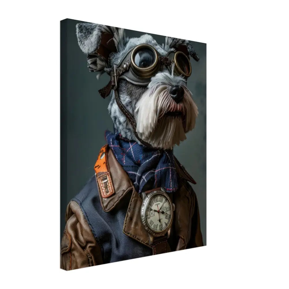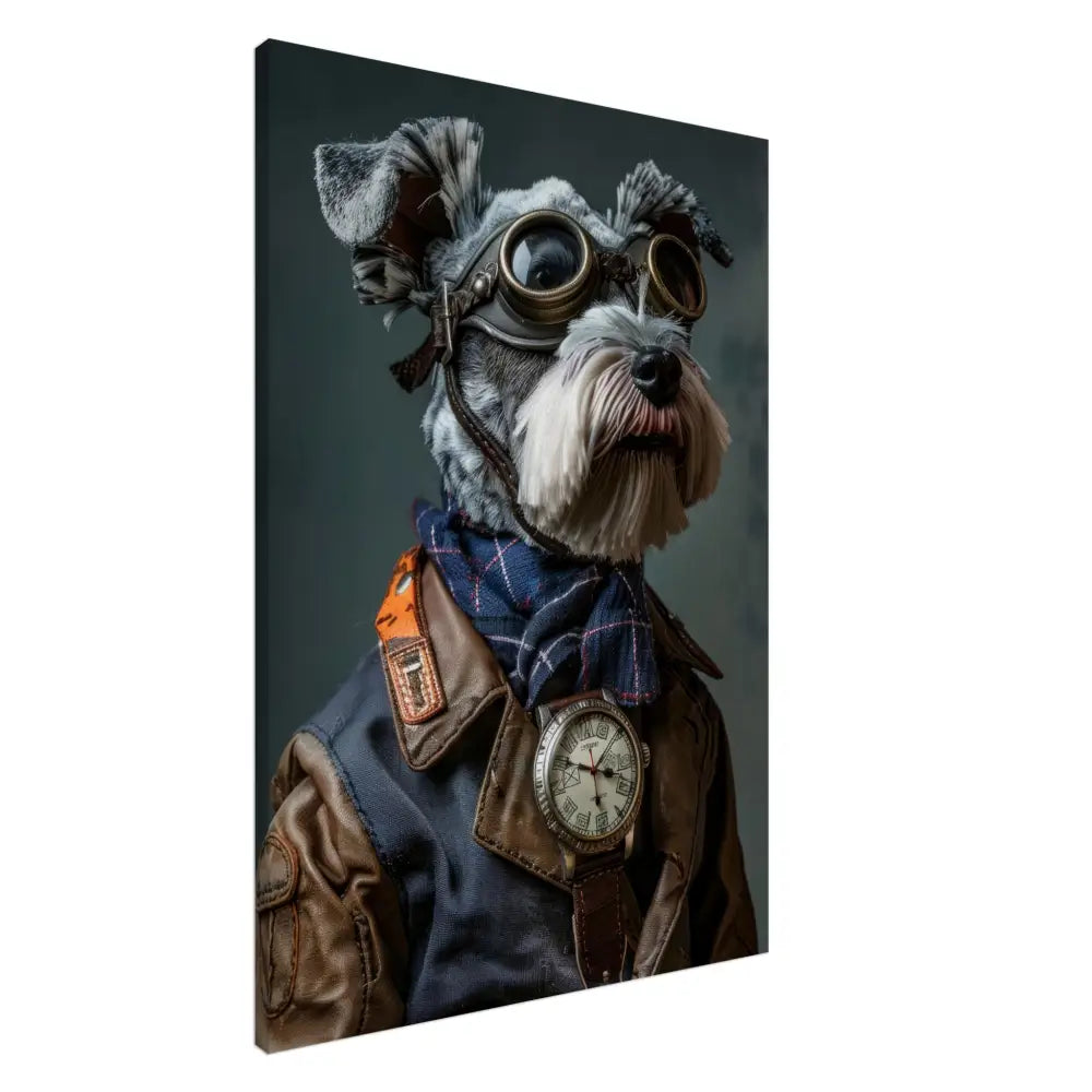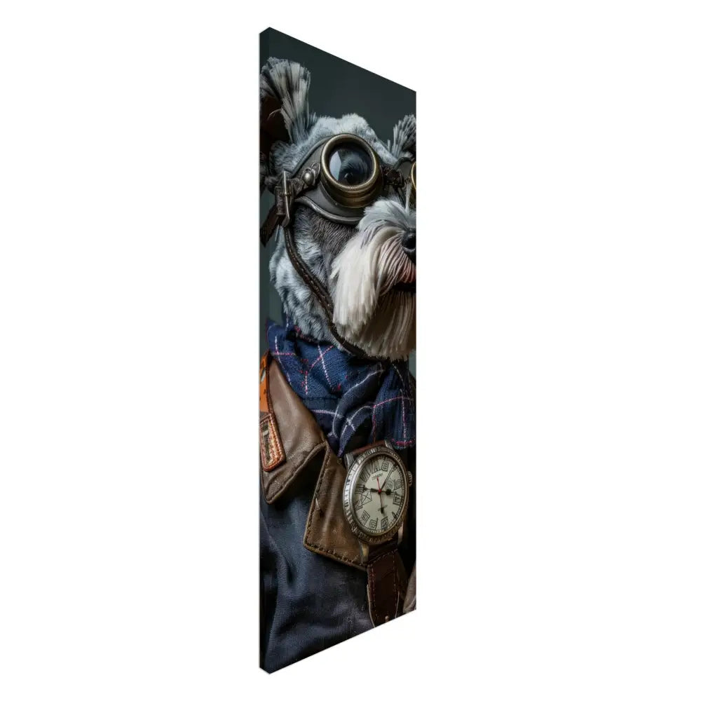 Deze afbeelding toont een dier, gekleed in een prachtige vintage steampunk outfit. Het draagt een stoere, bruin leren jas met contrasterende stiksels en koperen accenten, die een gevoel van avontuur oproepen. Om de nek hangt een antieke zilveren klok, die het klassieke steampunk-thema perfect aanvult. De kop wordt gesierd door een stel robuuste, bronzen retro-futuristische bril met metalen details, wat een avontuurlijke tijdreiziger uitstraling versterkt. De poten zijn voorzien van elegante, grijze bontachtige manchetjes die het geheel verfijnd afronden. De achtergrond is subtiel en donker, wat de aandacht volledig op het gedetailleerde en imposante portret van het dier legt.