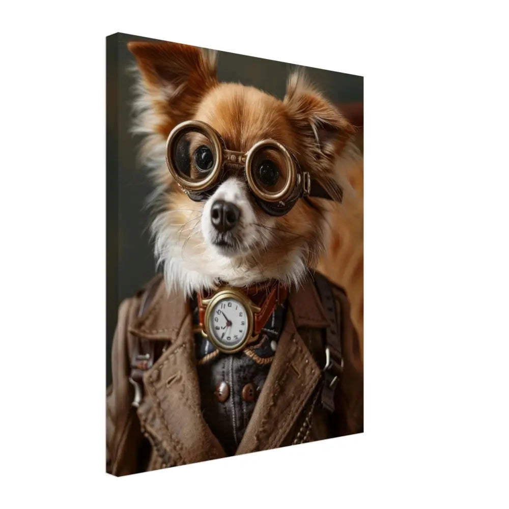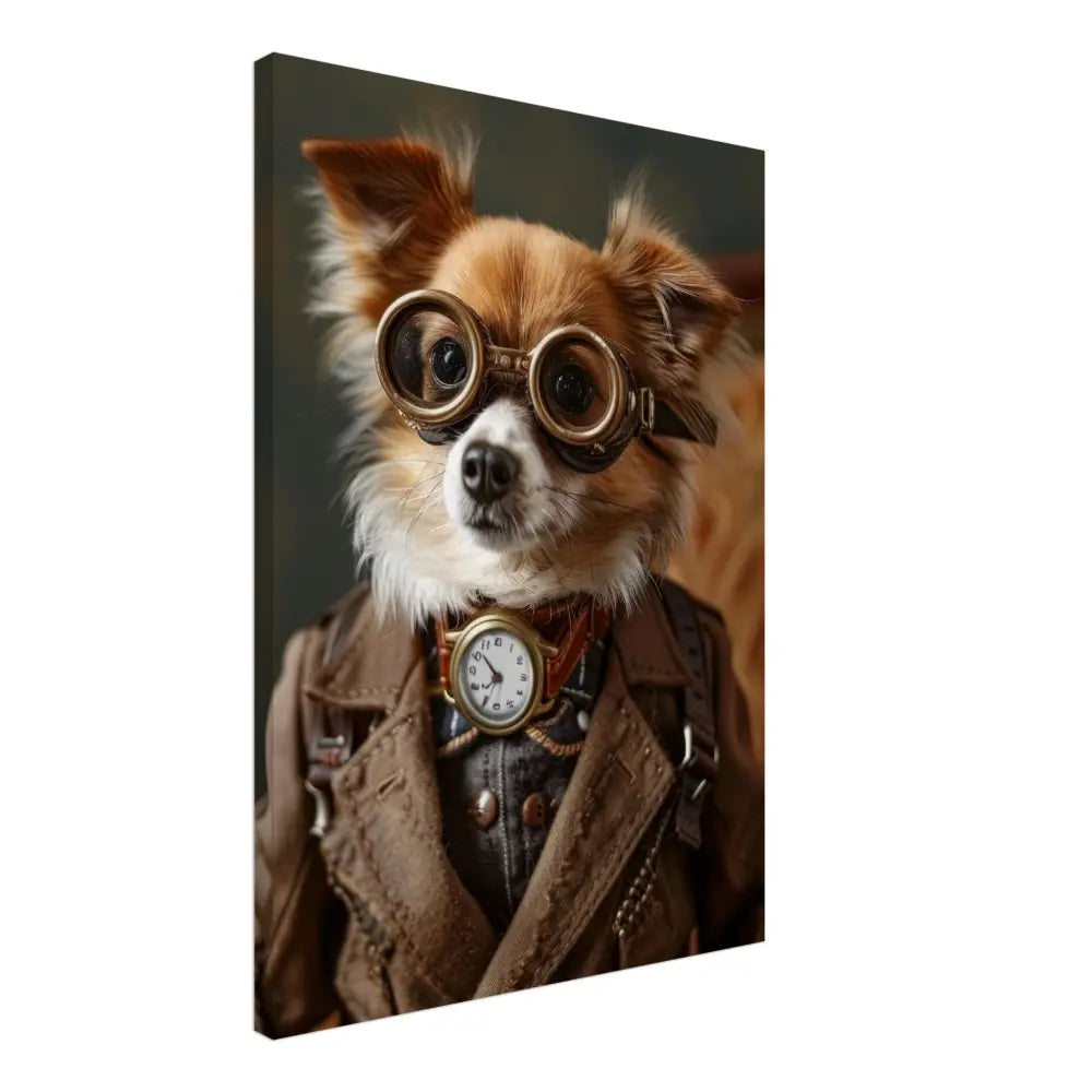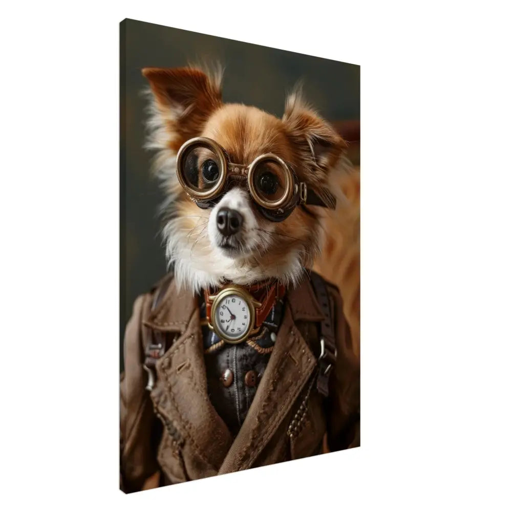 Deze afbeelding toont een dier, gekleed in een prachtige vintage steampunk outfit. Het draagt een elegante, bruin leren jas met verfijnde stiksels en koperen knopen. Om de nek hangt een antieke, gouden klok die een nostalgische sfeer oproept. De kop wordt gesierd door een paar grote, bronzen brillen met gedetailleerde metalen randen, wat het dier een intrigerende, intellectuele uitstraling geeft. De pootjes zijn versierd met subtiele, bruine lederen riempjes en contrasterende naden die de outfit compleet maken. Op de achtergrond zie je een subtiele, rustieke textuur die het historische gevoel van de schilderij versterkt.