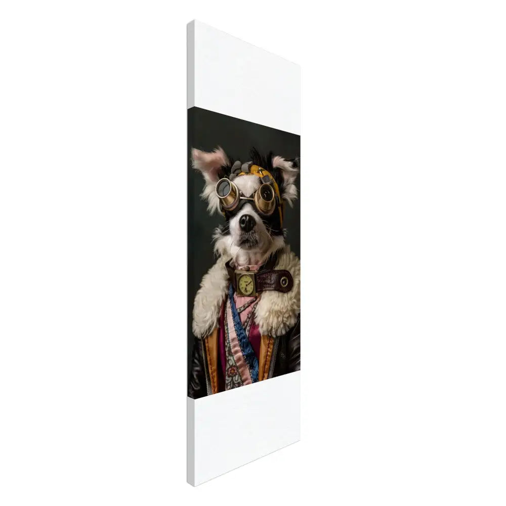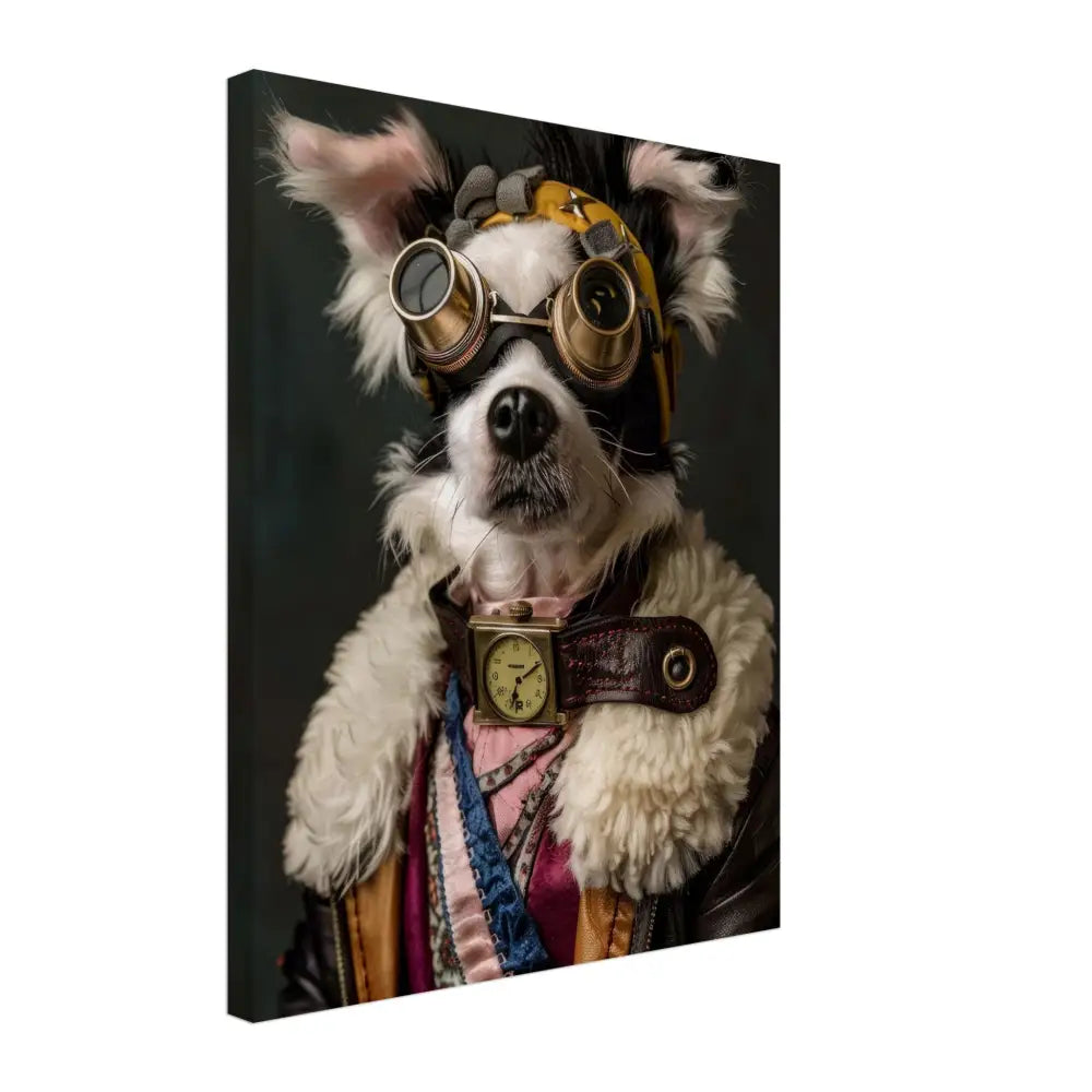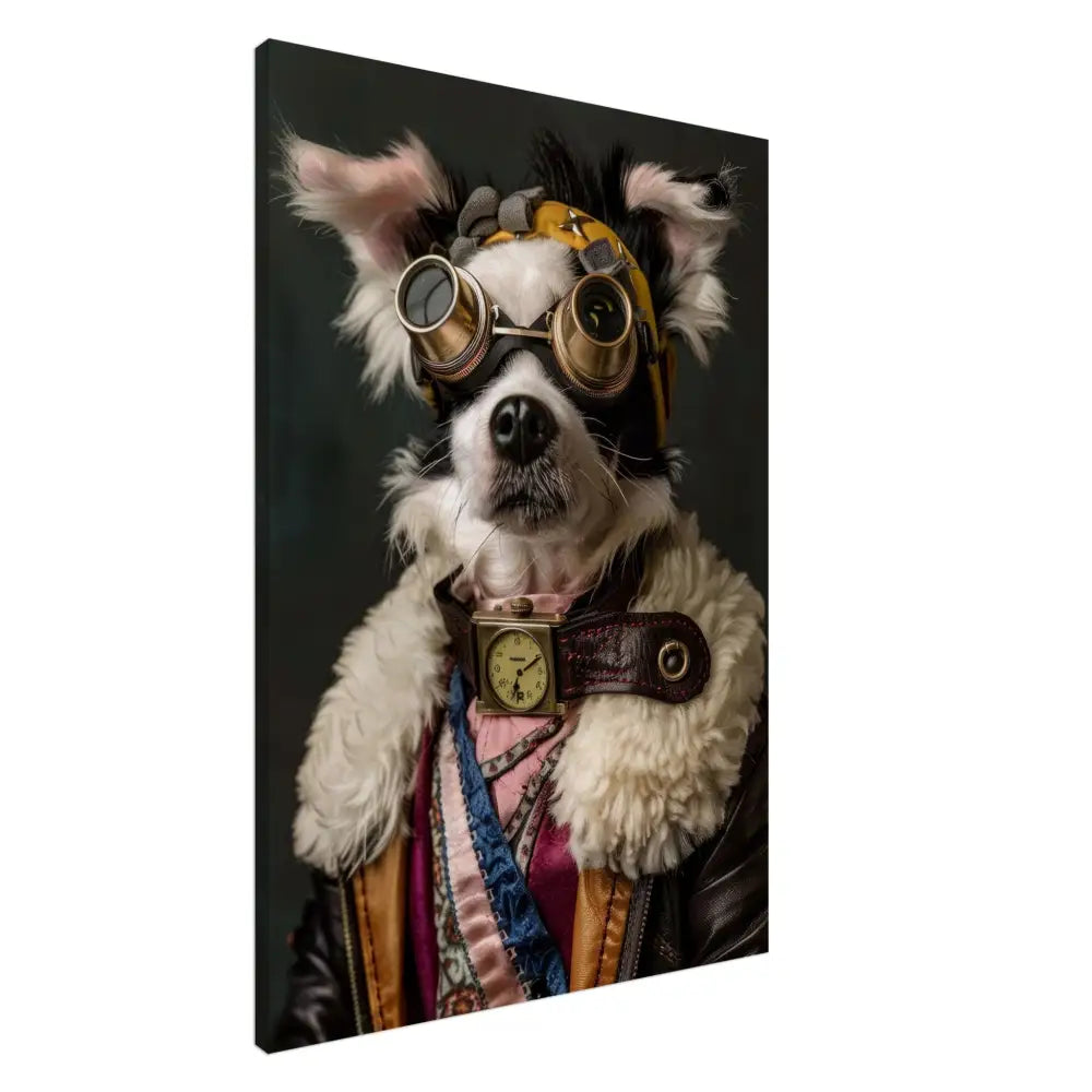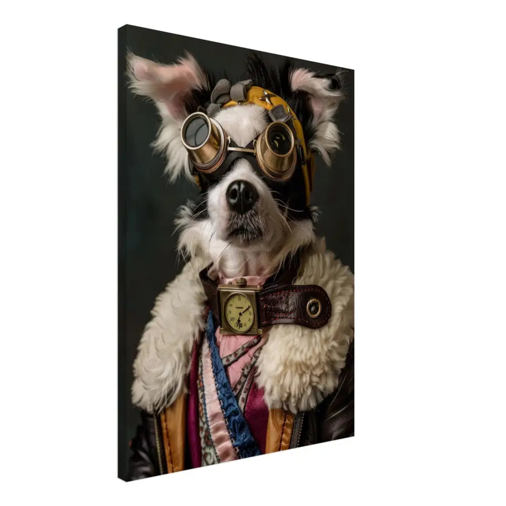 Deze afbeelding toont een dier, gekleed in een prachtige vintage steampunk outfit. Het draagt een rijk versierde, leren jas met donkere, diepe kleuren en contrasterende stiksels. Om de nek hangt een antieke gouden klok die de charmante oudheid benadrukt. Het hoofd is voorzien van een paar indrukwekkende retro-futuristische goggles met bronzen metalen details, die een avontuurlijke look geven. De voorpoten zijn versierd met luxueuze, witte bontachtige manchetjes die het geheel verfijnen. De achtergrond is neutraal en donker, waardoor de gedetailleerde outfit en accessoires van het dier prachtig naar voren komen.