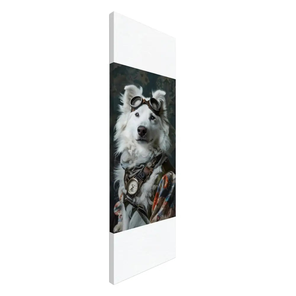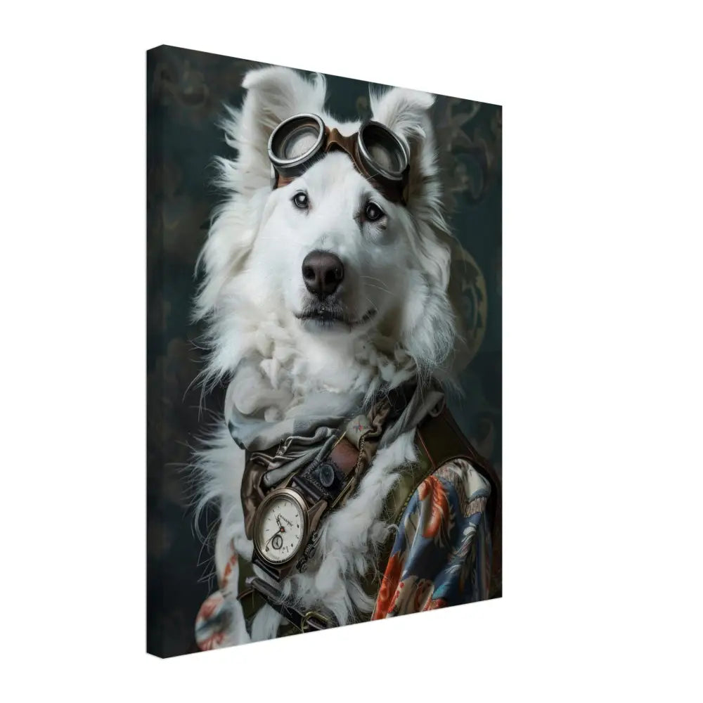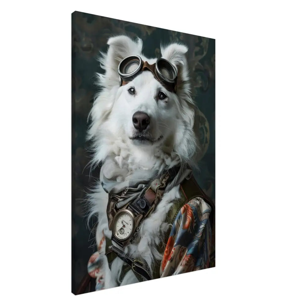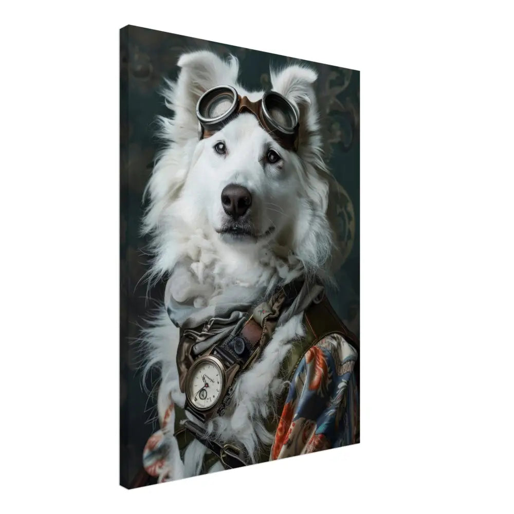Deze afbeelding toont een dier, gekleed in een prachtige vintage steampunk outfit. Het draagt een weelderige olijfgroene jas met opvallende bloemmotieven en sierlijke patronen in heldere kleuren. Om de nek van het dier hangt een antieke gouden klok, wat een vleugje elegantie toevoegt aan de ensemble. Op het hoofd prijken grote, retro-futuristische brillen met glanzende koperen metalen details, perfect passend bij de avontuurlijke uitstraling. De pootjes zijn gedecoreerd met elegante leren accenten en contrasterende stiksels, terwijl zachte, donzige manchetten het geheel compleet maken. De achtergrond heeft een charmante, vintage uitstraling met een gedetailleerd bloemenbeeld, wat bijdraagt aan de romant
