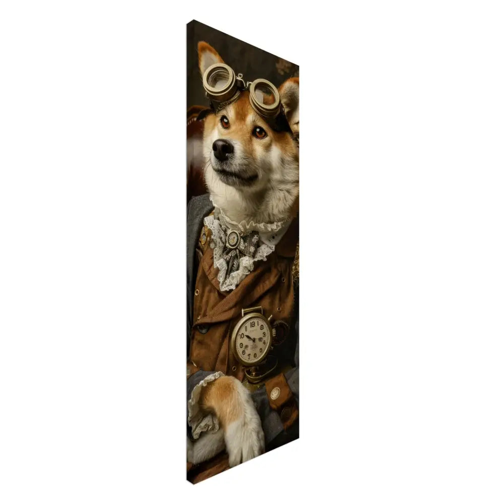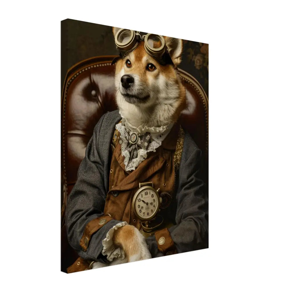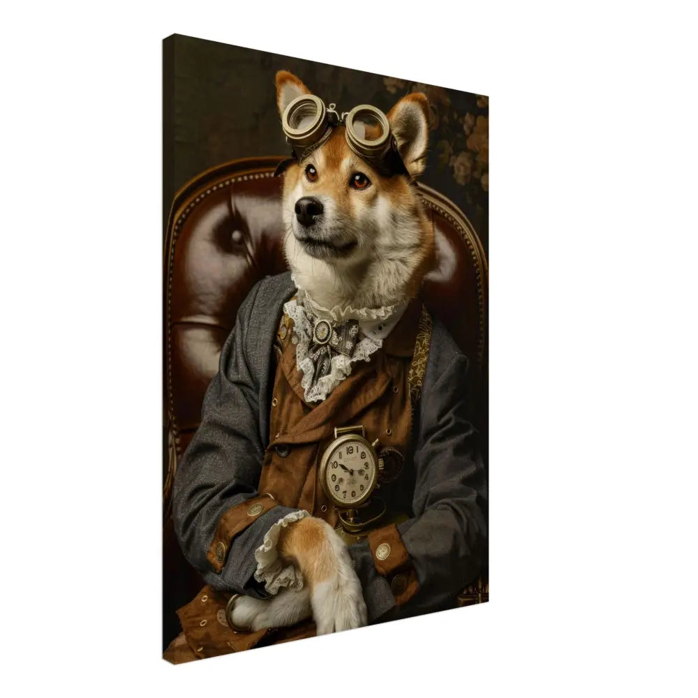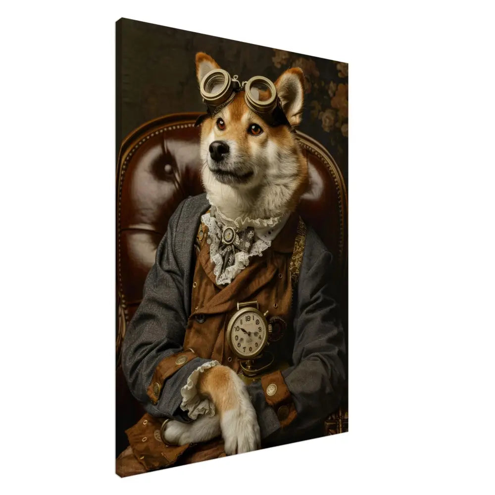 Deze afbeelding toont een hond, gekleed in een prachtige steampunk outfit. Het draagt een elegante, bruin-grijze jas met subtiele gouden accenten en knopen die perfect bij de vintage stijl passen. Om de nek hangt een antieke gouden klok, benadrukkend de aristocratische flair van het dier. De kop wordt gesierd door een paar indrukwekkende, retro-futuristische brillen met metalen details in een warme bronskleur, wat een vleugje avontuurlijkheid toevoegt. De pootjes zijn voorzien van zachte, witte bontachtige manchetjes en leren accenten die het geheel verfijnd afmaken. De achtergrond is een rijkelijk gedetailleerd bloemenmotief, wat een nostalgische sfeer oproept.