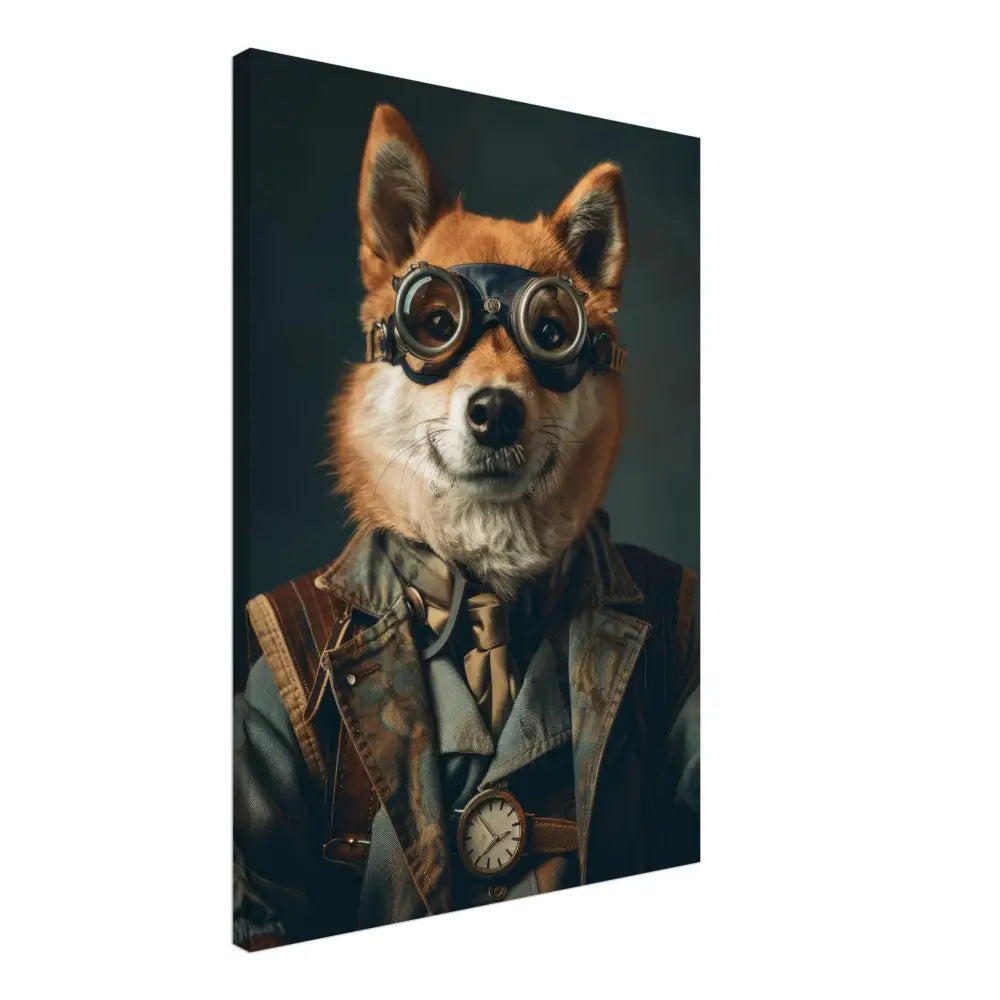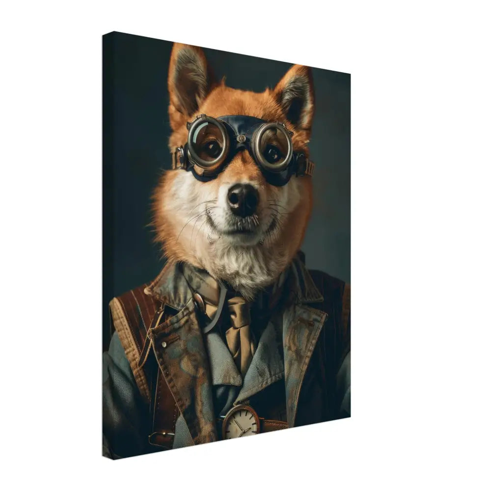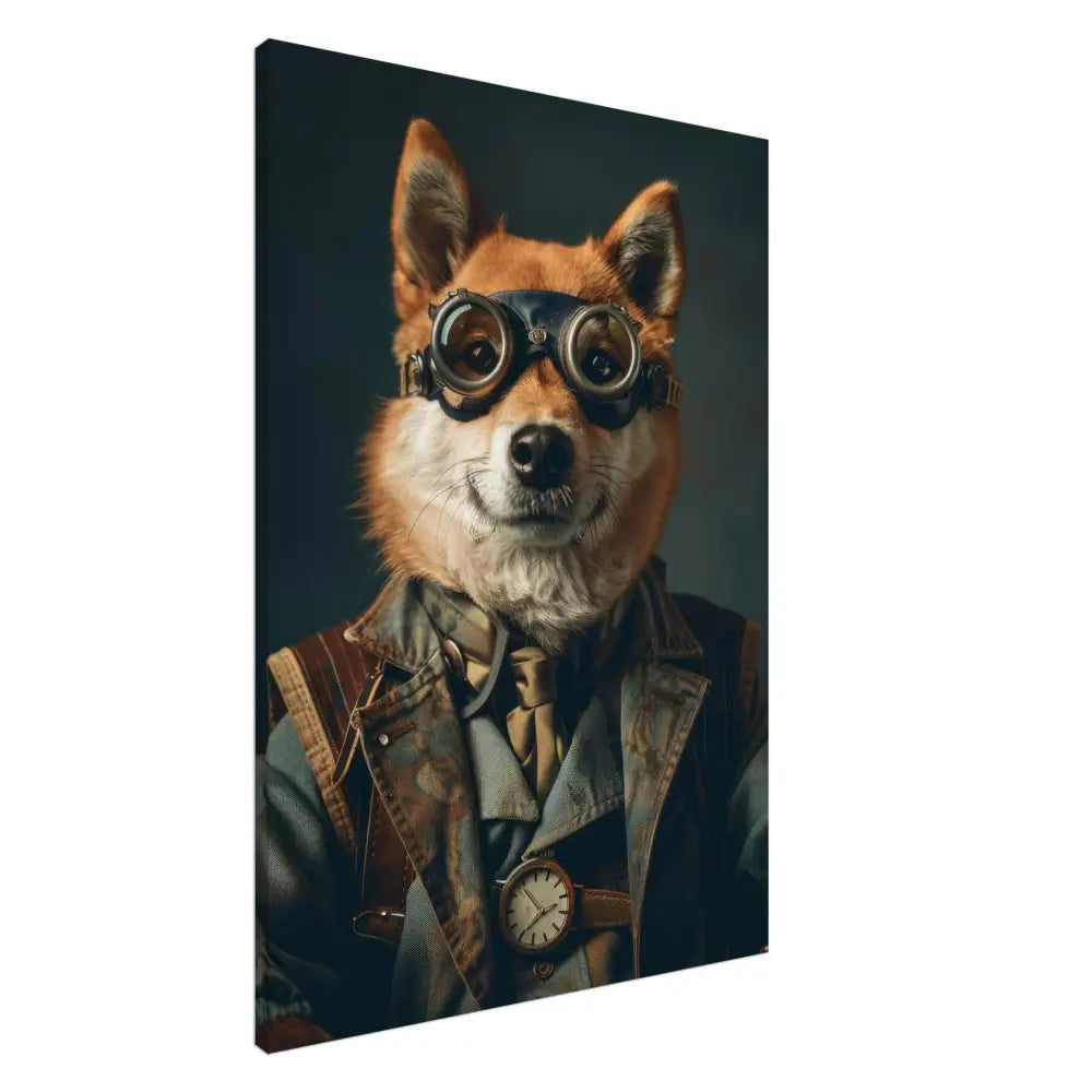 Deze afbeelding toont een dier, gekleed in een prachtige vintage steampunk outfit. Het draagt een stoere, grijsblauwe jas met verweerde patronen en leren accenten, die een avontuurlijke indruk wekken. Om de nek hangt een antieke gouden klok met een wit gezicht, die elegant contrasteert met de rest van de outfit. Op de kop bevindt zich een set robuuste, bronzen bril met ingewikkelde metalen details, wat de uitstraling van een ontdekkingsreiziger versterkt. De pootjes hebben verfijnde leren manchetbanden die het geheel stijlvol afmaken. De achtergrond is een sombere, industriële setting, passend bij het steampunk thema.