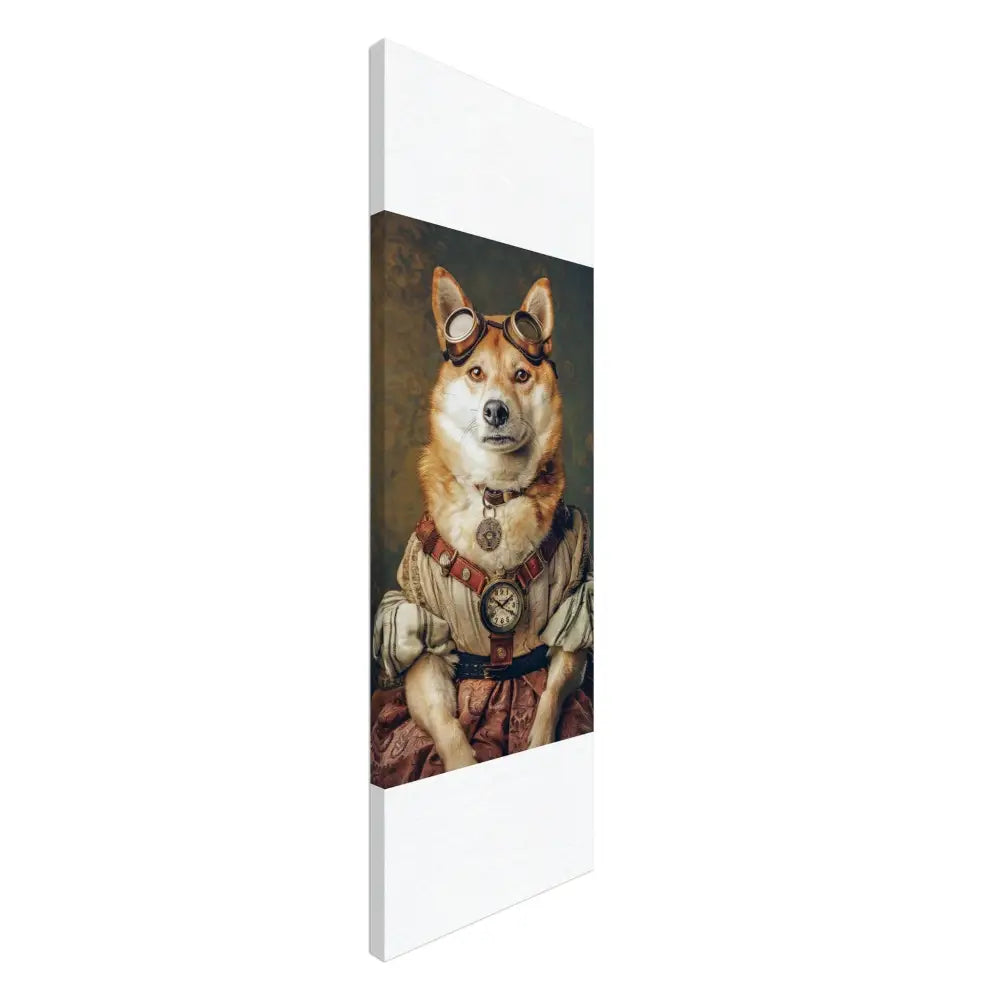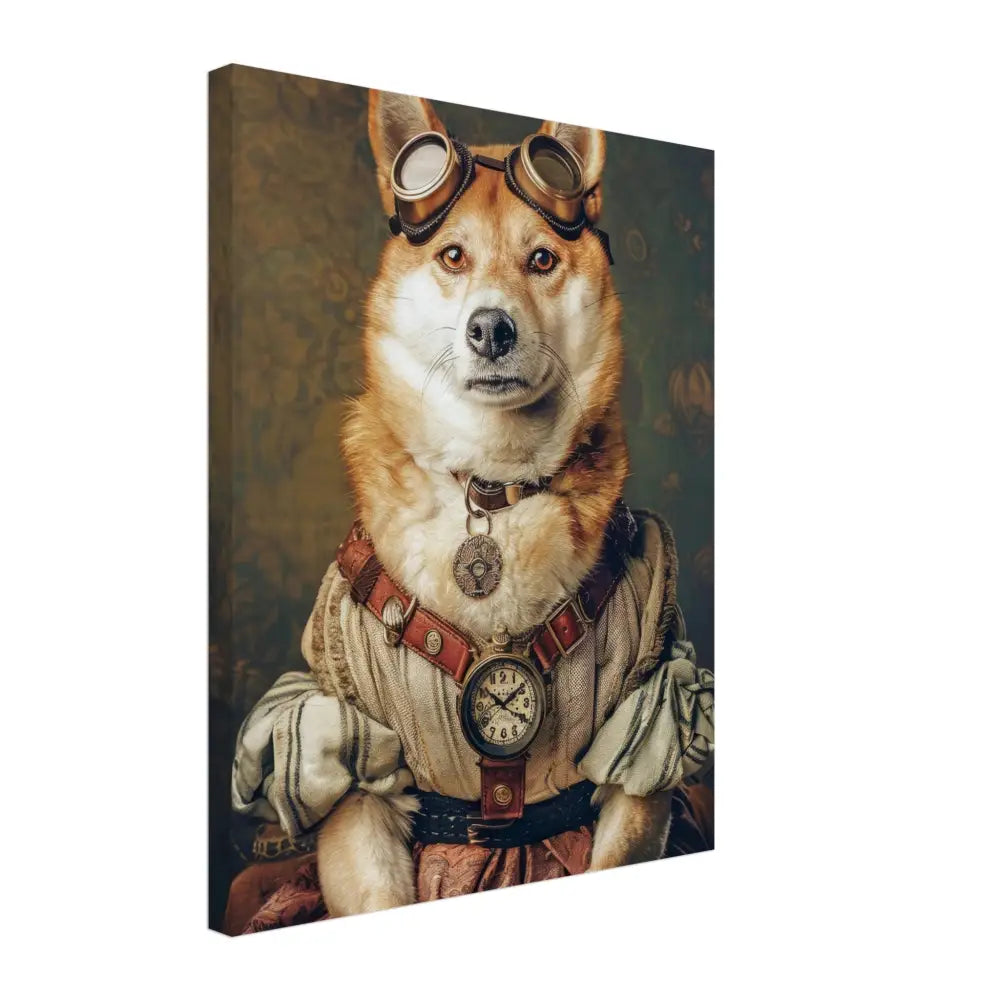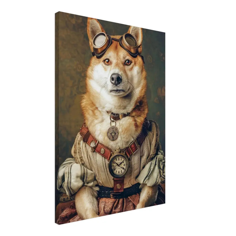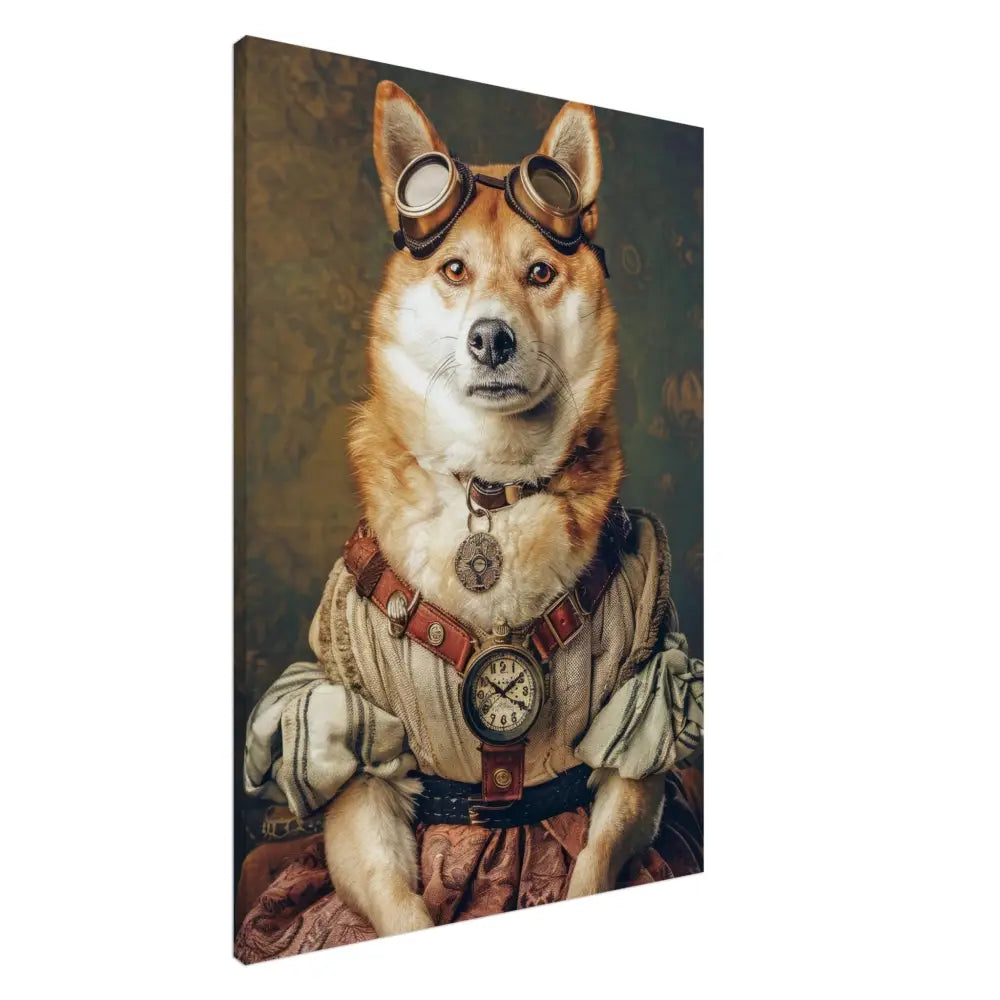 Deze afbeelding toont een dier, gekleed in een prachtige vintage steampunk outfit. Het draagt een indrukwekkende crème en beige jas met subtiele strepen en bordeauxrode leren accenten. Om de nek hangt een antieke bronzen klok, die perfect contrasteert met de vacht en de aristocratische uitstraling benadrukt. Op het hoofd prijkt een paar rondvormige, retro-futuristische brillen met koperkleurige metalen details, wat het ensemble een avontuurlijke look geeft. De poten zijn verfraaid met elegante groene manchetjes en donkere leren riemen, terwijl het geheel wordt gecompleteerd door de sierlijke stiksels. De achtergrond is gevuld met zachte, bloemenpatronen die een dromerige sfeer creëren.