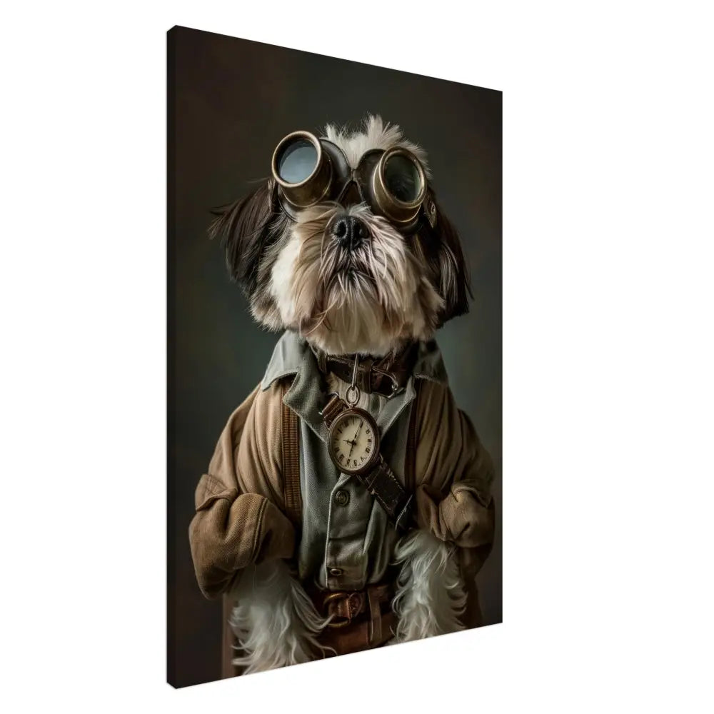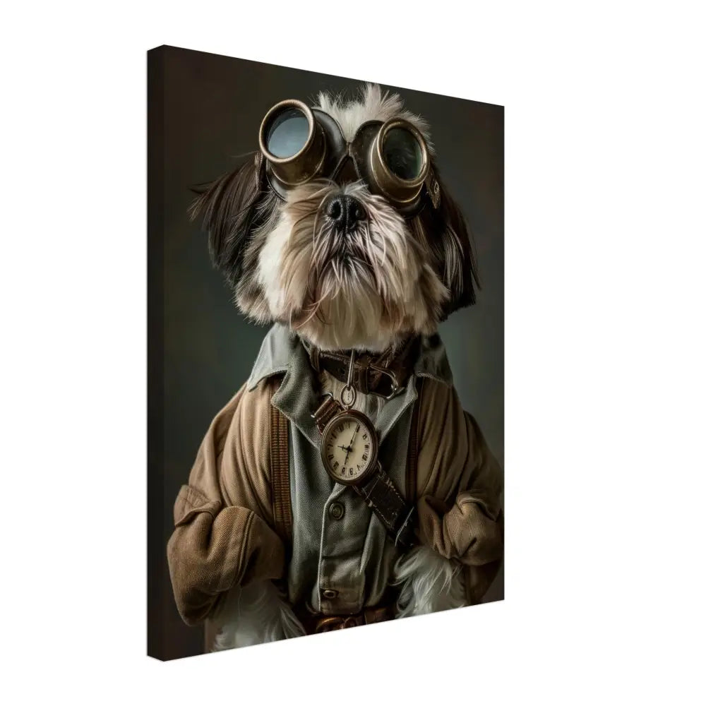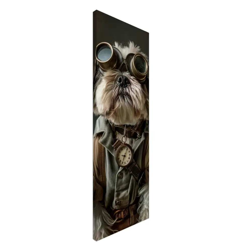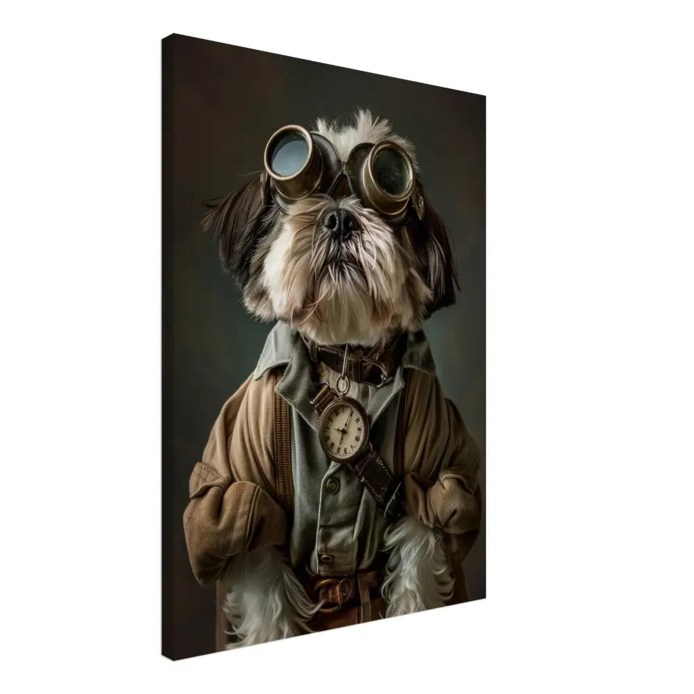 Deze afbeelding toont een dier, gekleed in een prachtige vintage steampunk outfit. Het draagt een stijlvolle, olijfkleurige jas met subtiele stiksels en leren accenten. Om de nek hangt een antieke bronzen klok, die elegant contrasteert met de rest van de kleding. De kop wordt geaccentueerd door een paar grote, retro-futuristische brillen met metalen details in antiek brons, wat het dier een reizigersuitstraling geeft. De pootjes zijn omwikkeld met crèmekleurige bontachtige manchetjes die luxe en warmte uitstralen. Op de achtergrond is een rustig, diffuus kleurenpalet te zien, waardoor het dier nog meer in het oog springt.