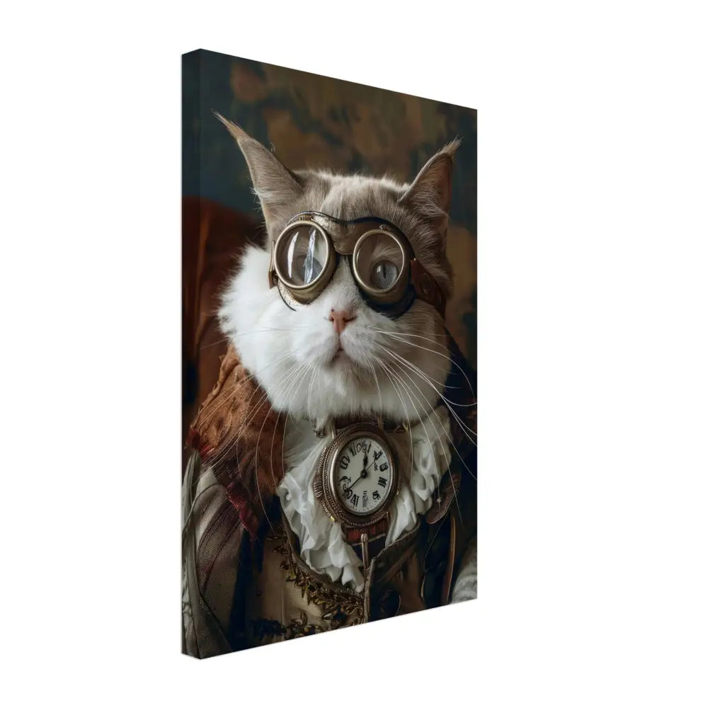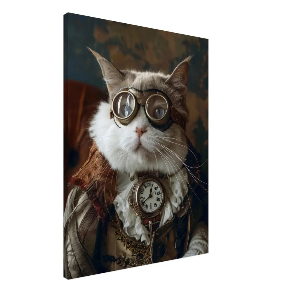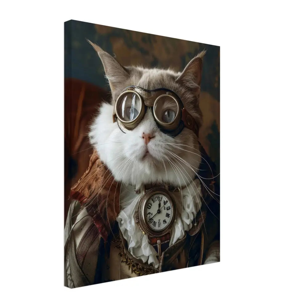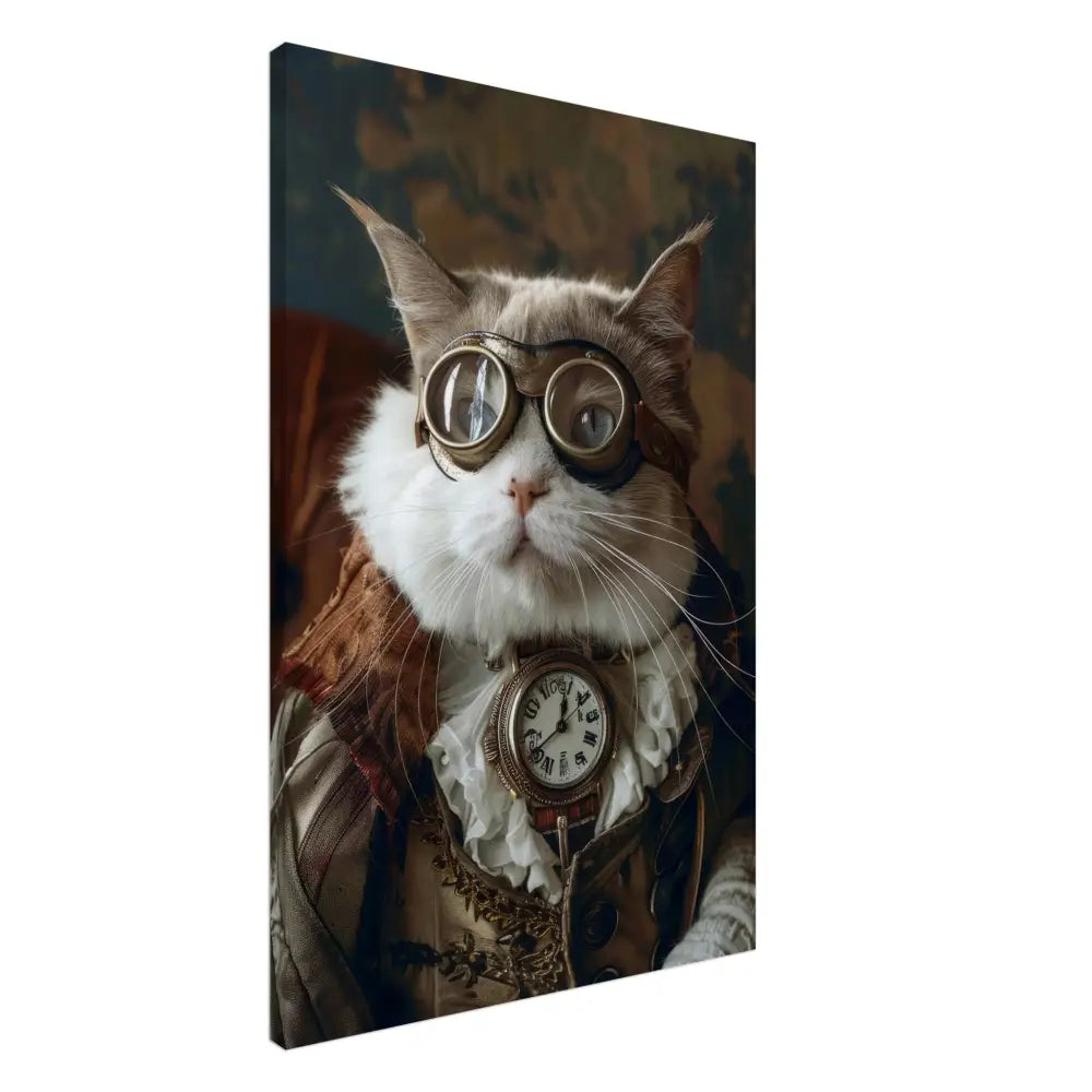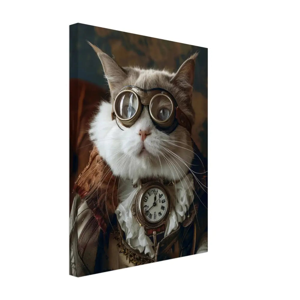 Dit schilderij toont een kat, gekleed in een prachtige vintage steampunk outfit. Hij draagt een elegante, gouden jas met ingewikkelde borduursels en metallic accenten. Om zijn nek hangt een antieke klok in brons, die zijn opvallende stijl benadrukt. Zijn kop is versierd met grote, retro-futuristische bril met koperen details, wat hem een mysterieuze uitstraling geeft. De manchetjes van zijn pootjes zijn bekleed met weelderig, wit bont, dat prachtig contrasteert met de leren en metalen details van zijn outfit. Op de achtergrond is een wereldkaart te zien, wat zijn avontuurlijke geest benadrukt.