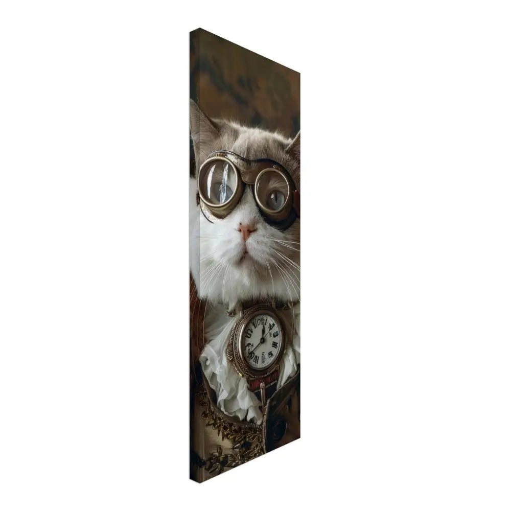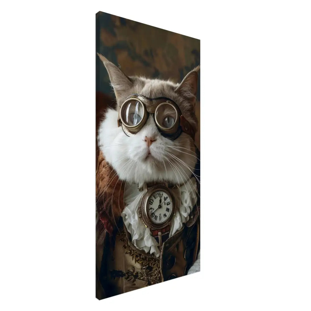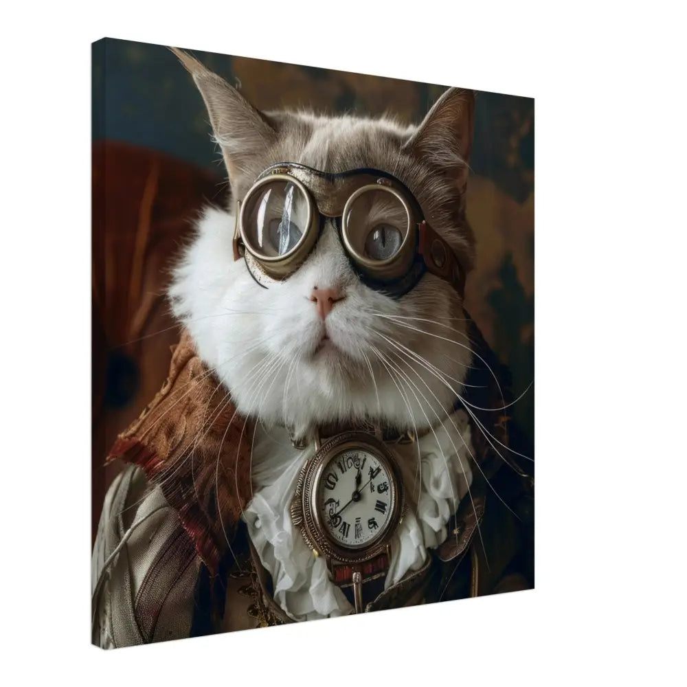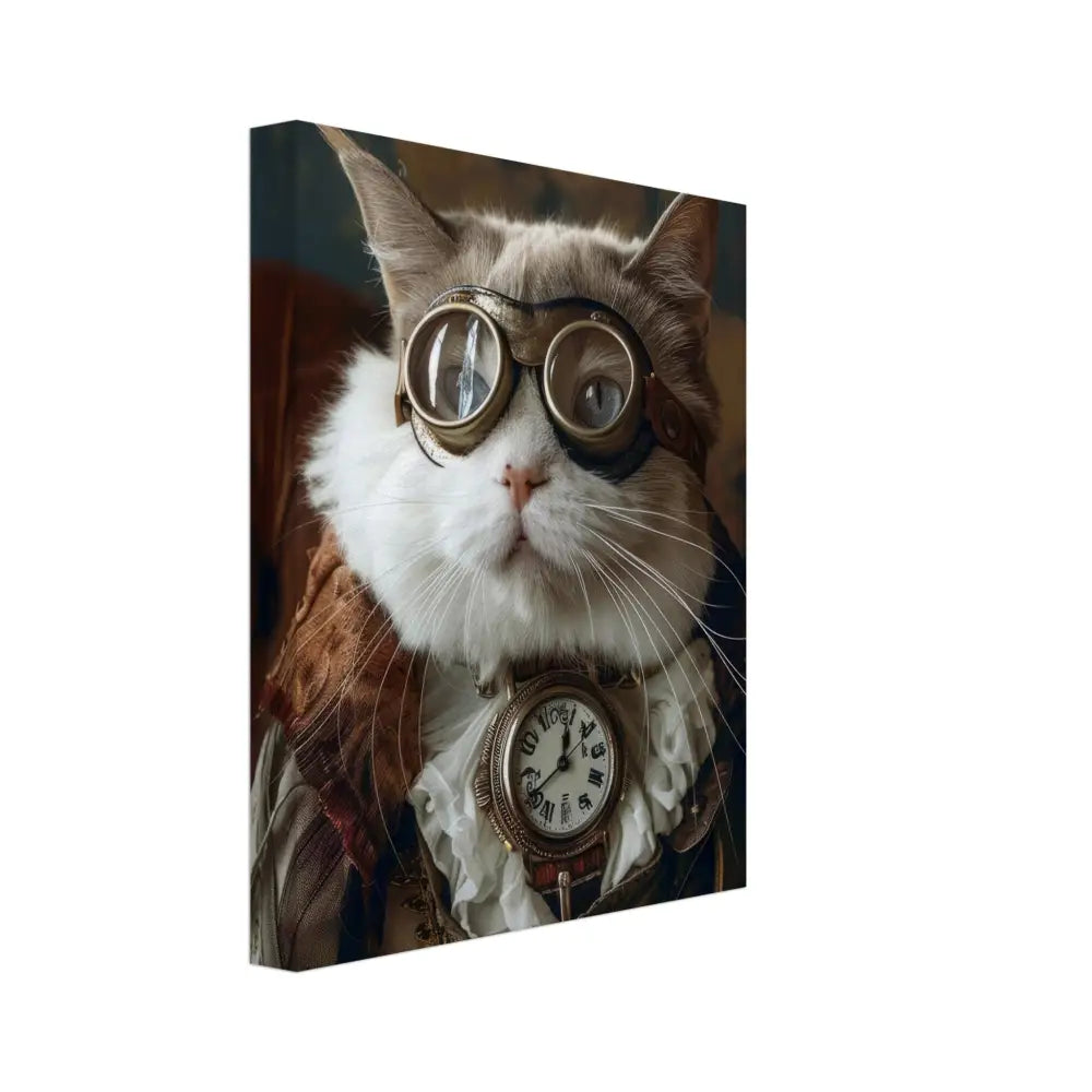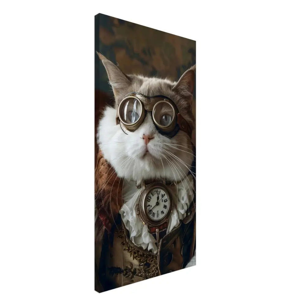 Dit schilderij toont een kat, gekleed in een prachtige vintage steampunk outfit. Hij draagt een elegante, gouden jas met ingewikkelde borduursels en metallic accenten. Om zijn nek hangt een antieke klok in brons, die zijn opvallende stijl benadrukt. Zijn kop is versierd met grote, retro-futuristische bril met koperen details, wat hem een mysterieuze uitstraling geeft. De manchetjes van zijn pootjes zijn bekleed met weelderig, wit bont, dat prachtig contrasteert met de leren en metalen details van zijn outfit. Op de achtergrond is een wereldkaart te zien, wat zijn avontuurlijke geest benadrukt.