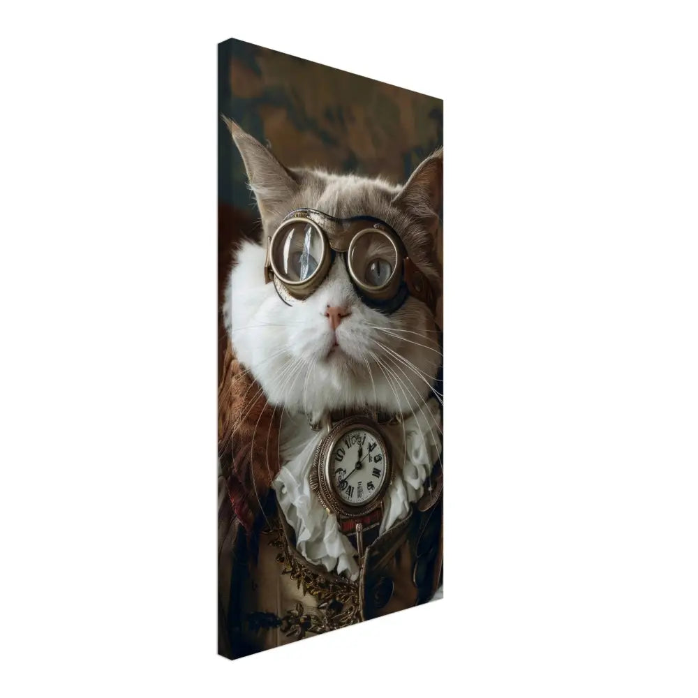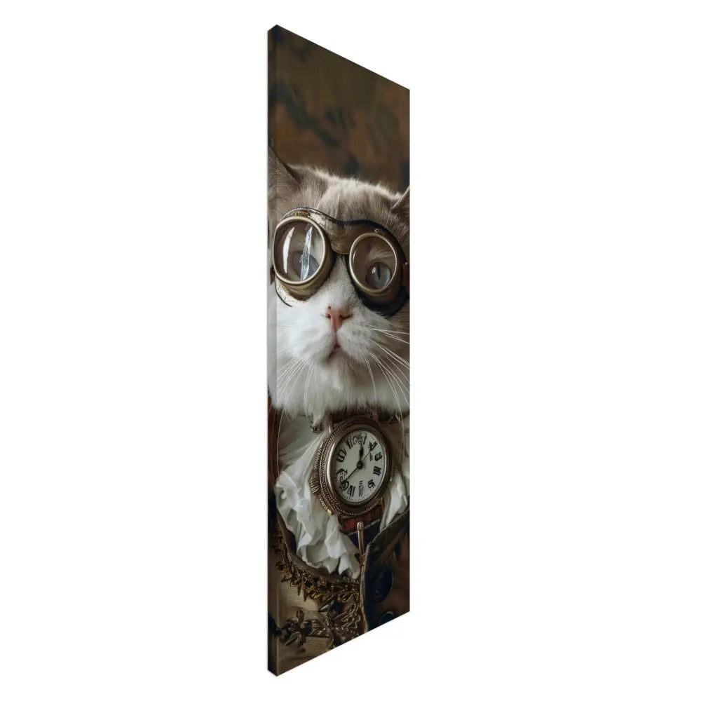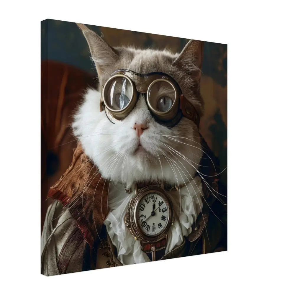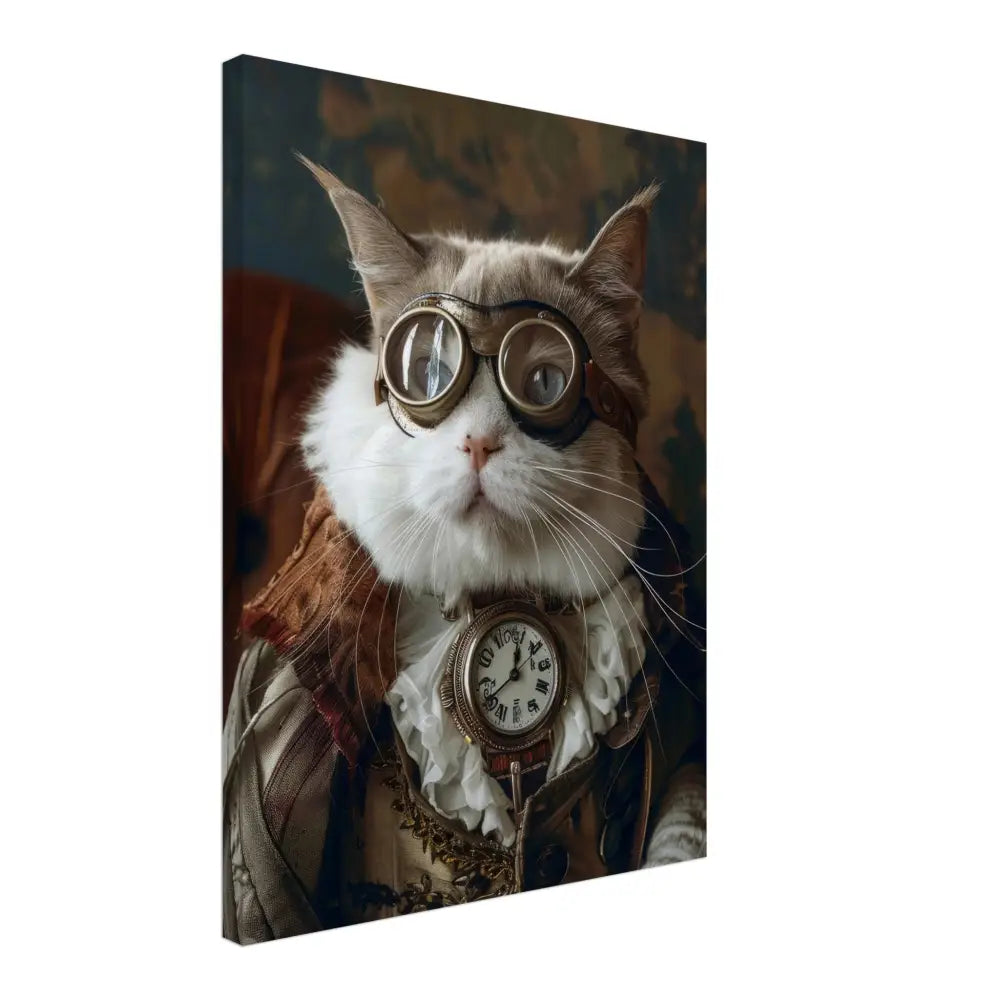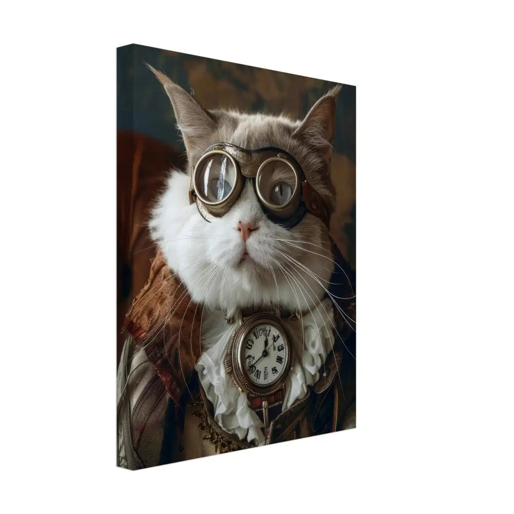 Dit schilderij toont een kat, gekleed in een prachtige vintage steampunk outfit. Hij draagt een elegante, gouden jas met ingewikkelde borduursels en metallic accenten. Om zijn nek hangt een antieke klok in brons, die zijn opvallende stijl benadrukt. Zijn kop is versierd met grote, retro-futuristische bril met koperen details, wat hem een mysterieuze uitstraling geeft. De manchetjes van zijn pootjes zijn bekleed met weelderig, wit bont, dat prachtig contrasteert met de leren en metalen details van zijn outfit. Op de achtergrond is een wereldkaart te zien, wat zijn avontuurlijke geest benadrukt.