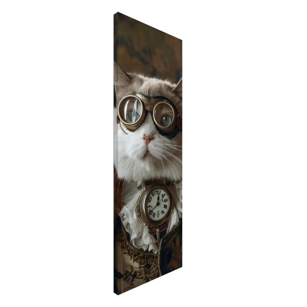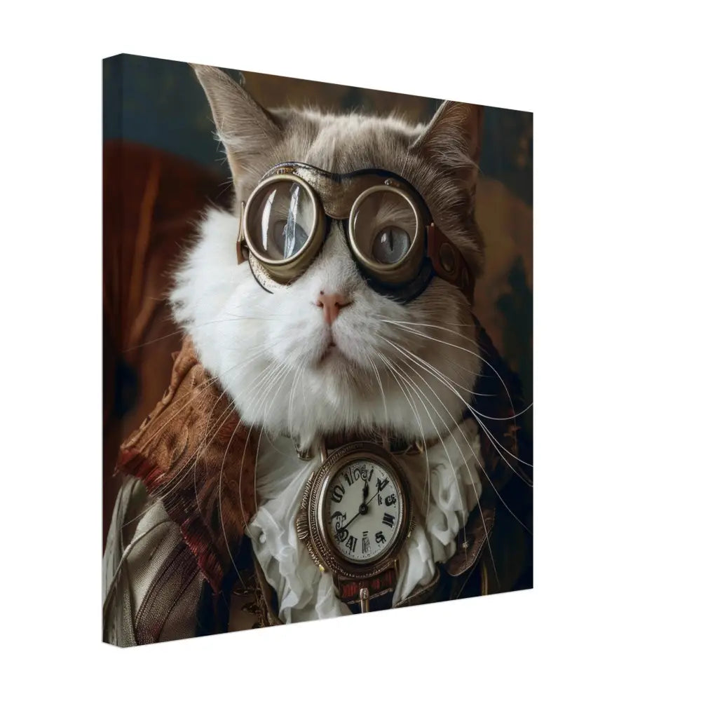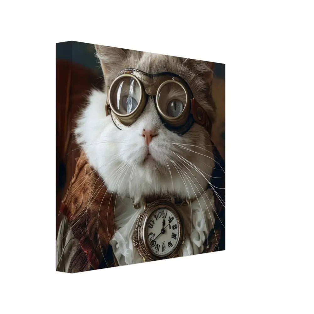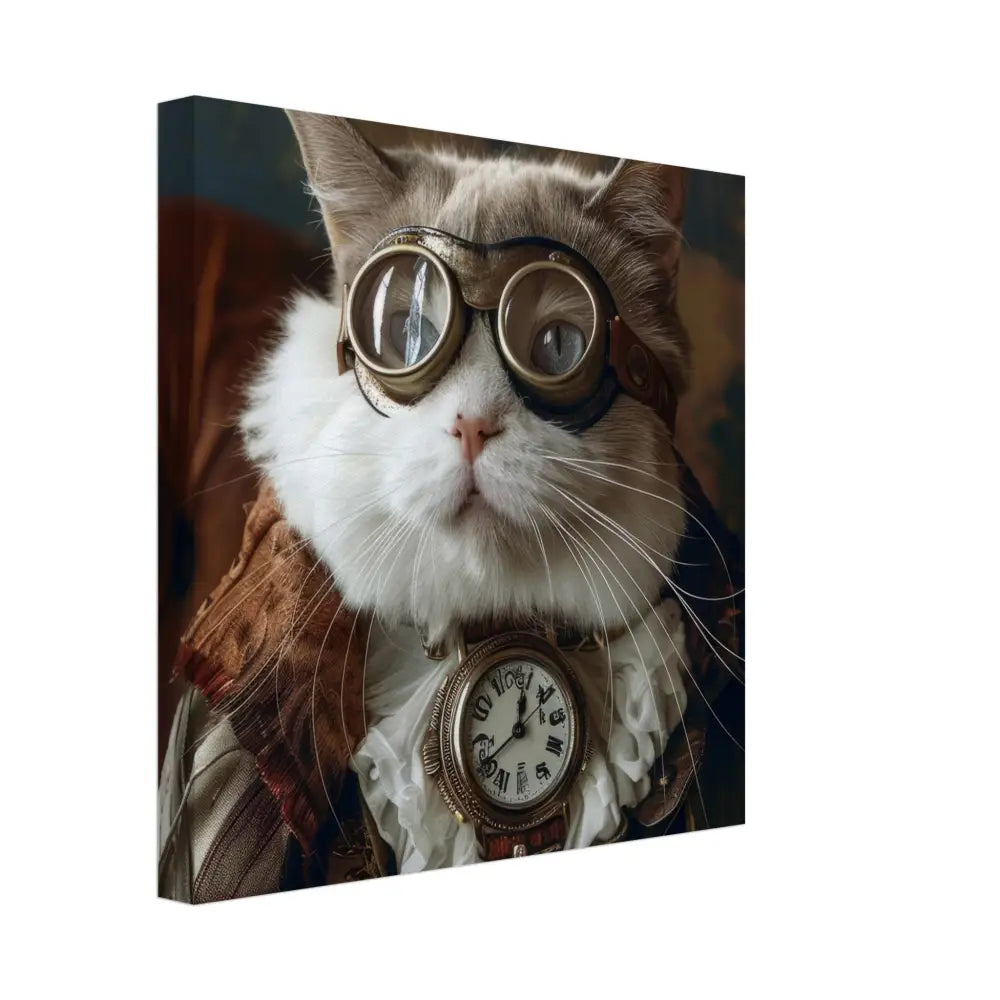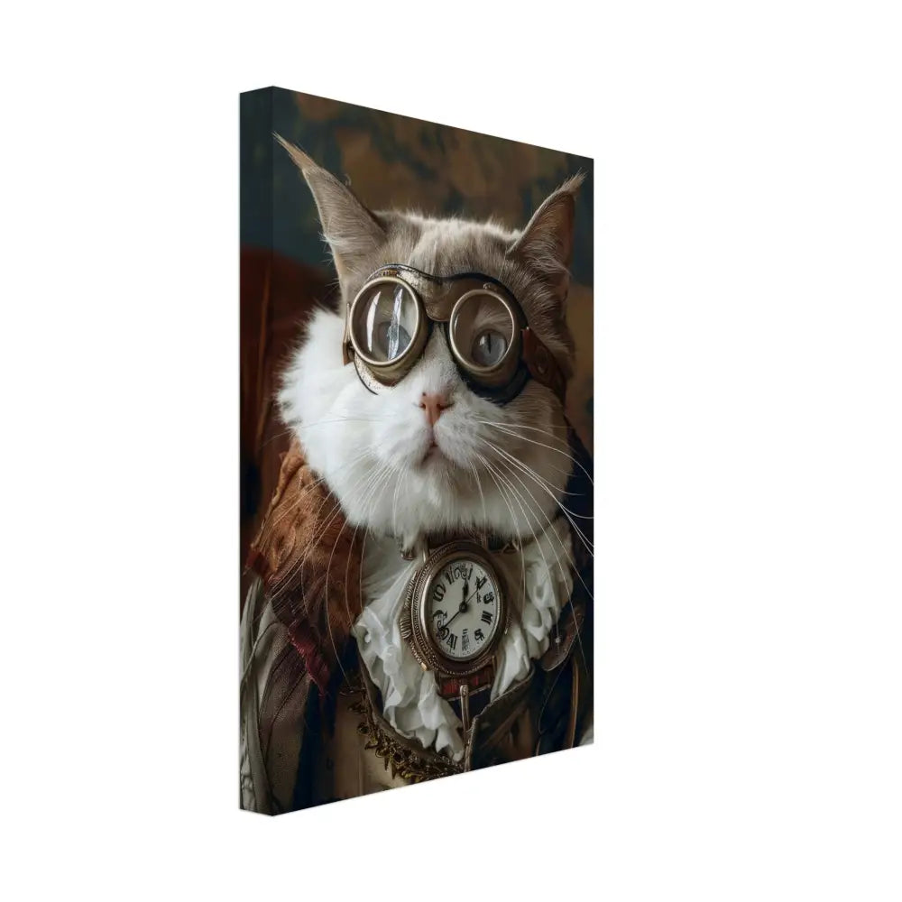 Dit schilderij toont een kat, gekleed in een prachtige vintage steampunk outfit. Hij draagt een elegante, gouden jas met ingewikkelde borduursels en metallic accenten. Om zijn nek hangt een antieke klok in brons, die zijn opvallende stijl benadrukt. Zijn kop is versierd met grote, retro-futuristische bril met koperen details, wat hem een mysterieuze uitstraling geeft. De manchetjes van zijn pootjes zijn bekleed met weelderig, wit bont, dat prachtig contrasteert met de leren en metalen details van zijn outfit. Op de achtergrond is een wereldkaart te zien, wat zijn avontuurlijke geest benadrukt.
