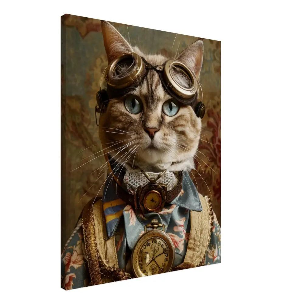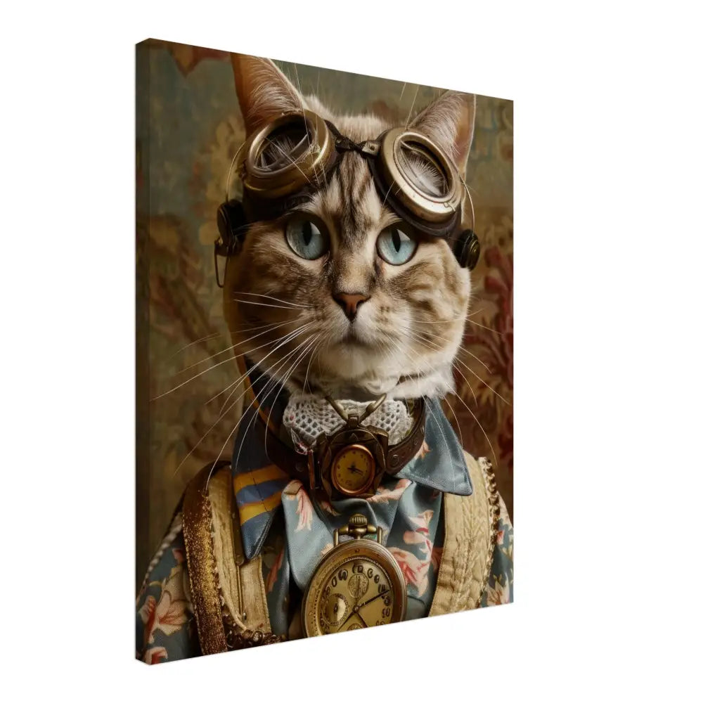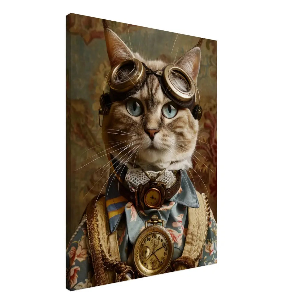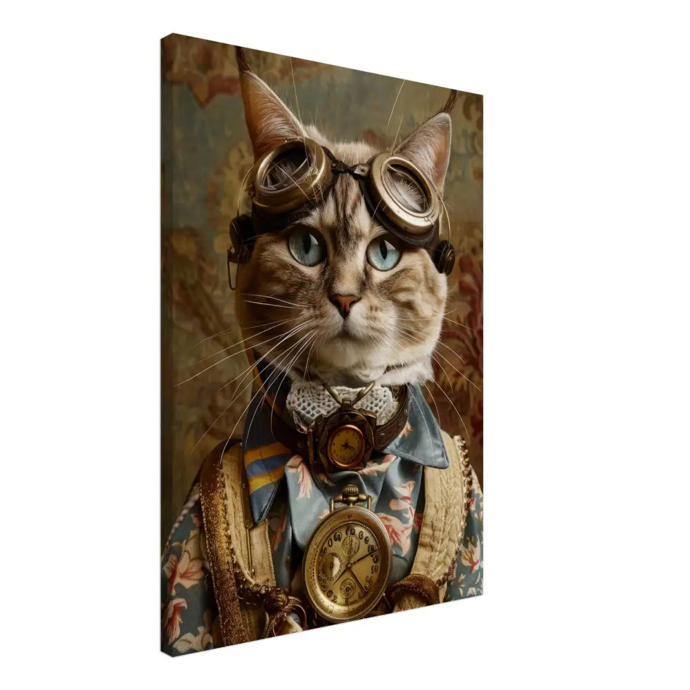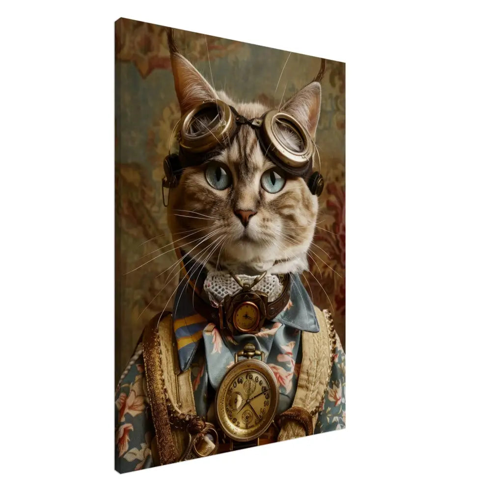 Dit schilderij toont een kat, gekleed in een prachtige vintage steampunk outfit. De kat draagt een elegante, blauwe jas met ingewikkelde bloemenpatronen en verfijnde brokaat accenten. Om haar nek hangt een antieke gouden klok, die haar charmante en historische uitstraling versterkt. Verder wordt haar kop gesierd door een paar grote, retro-futuristische brillen met bronzen metalen details, wat haar een avontuurlijke, wetenschappelijke flair geeft. Haar pootjes zijn voorzien van subtiele, beige leren accenten die perfect contrasteren met de jas. De achtergrond bevat een romantisch, gedrapeerd bloemenbehang, waardoor de afbeelding een nostalgische sfeer krijgt.