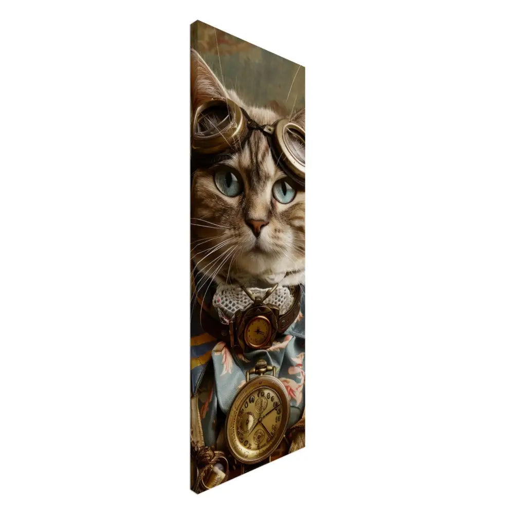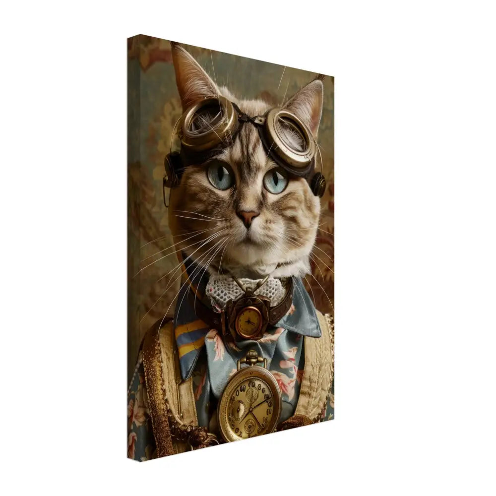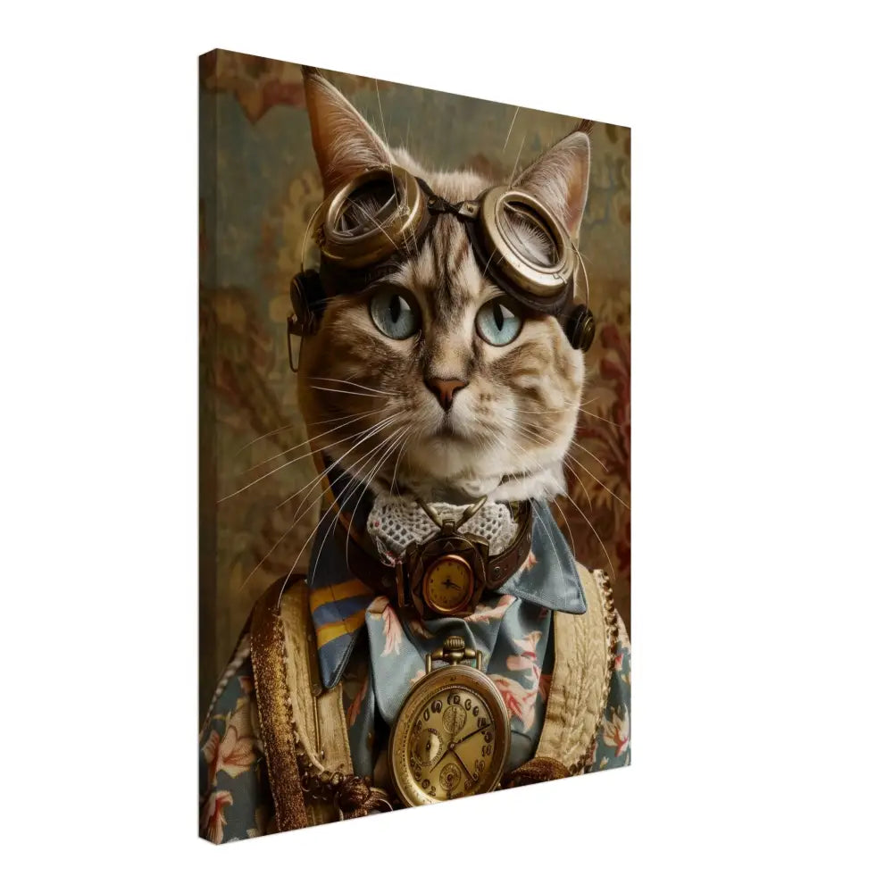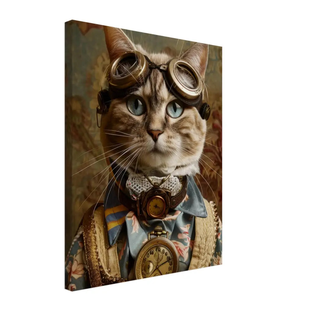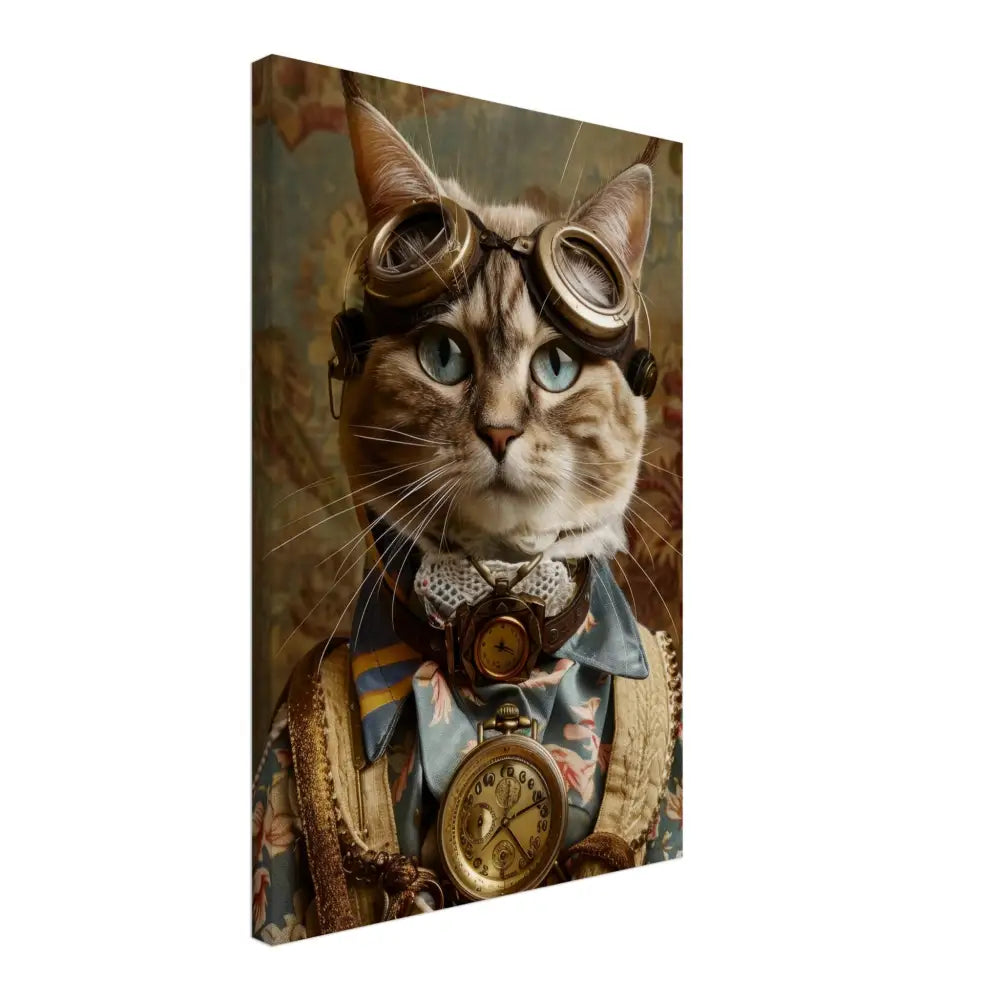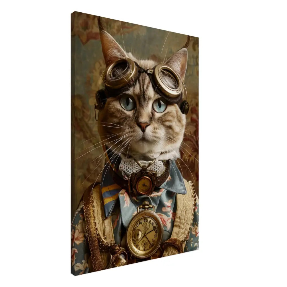Dit schilderij toont een kat, gekleed in een prachtige vintage steampunk outfit. De kat draagt een elegante, blauwe jas met ingewikkelde bloemenpatronen en verfijnde brokaat accenten. Om haar nek hangt een antieke gouden klok, die haar charmante en historische uitstraling versterkt. Verder wordt haar kop gesierd door een paar grote, retro-futuristische brillen met bronzen metalen details, wat haar een avontuurlijke, wetenschappelijke flair geeft. Haar pootjes zijn voorzien van subtiele, beige leren accenten die perfect contrasteren met de jas. De achtergrond bevat een romantisch, gedrapeerd bloemenbehang, waardoor de afbeelding een nostalgische sfeer krijgt.