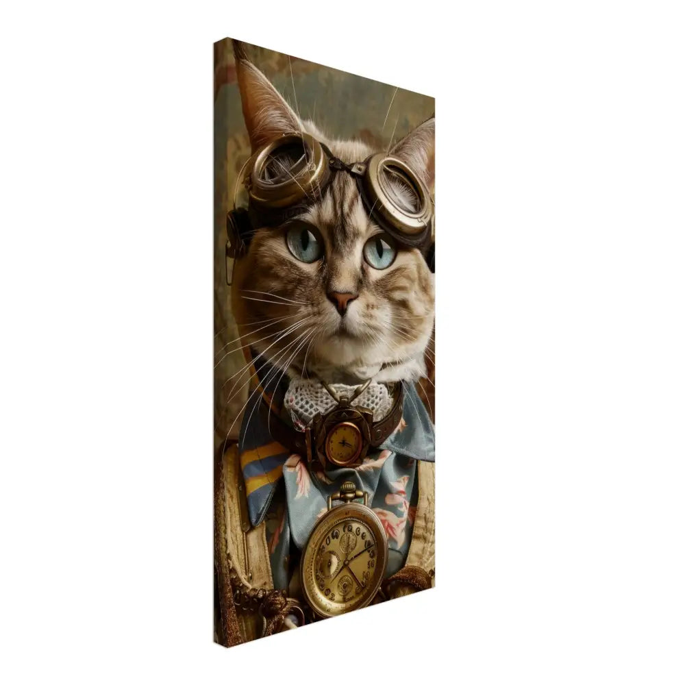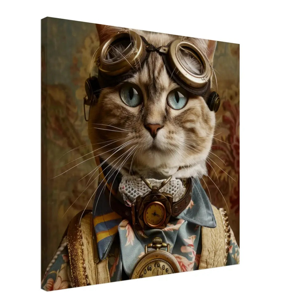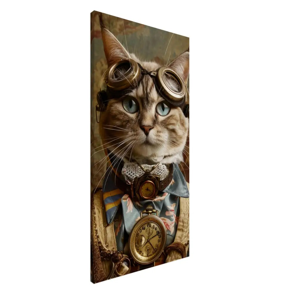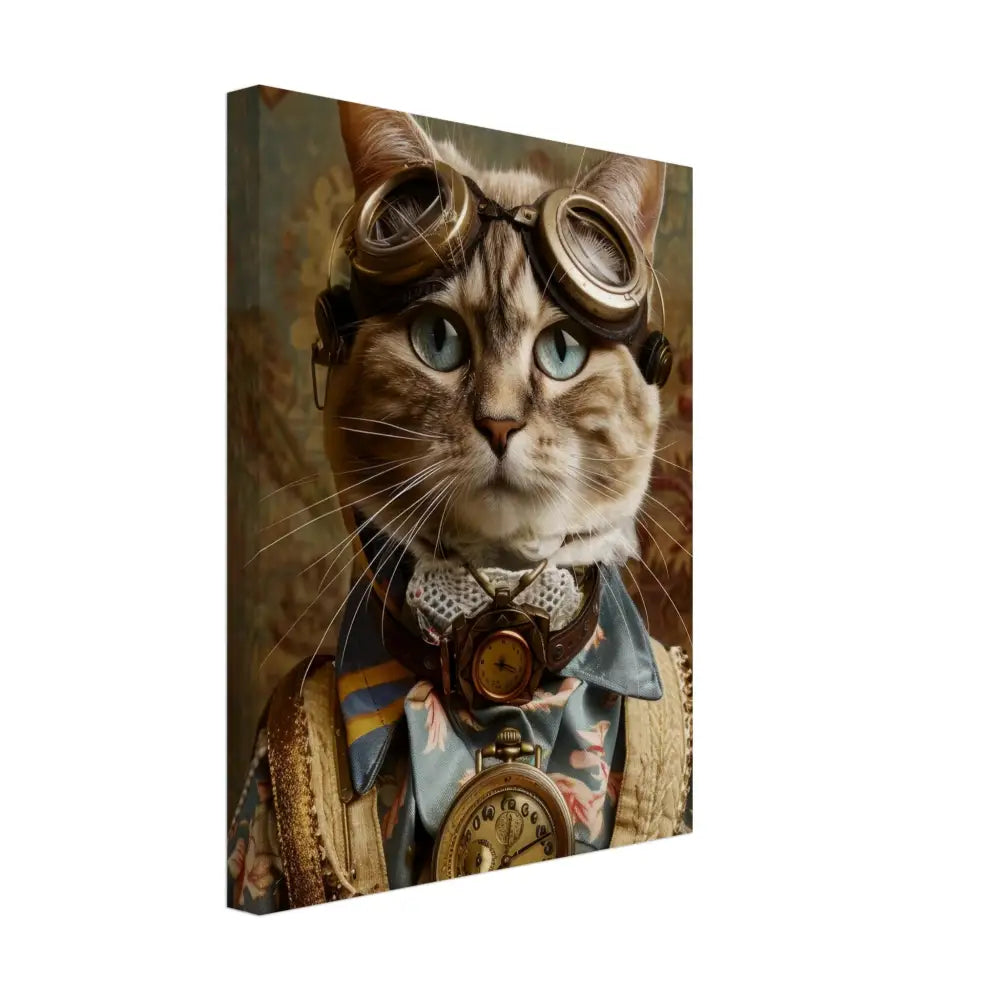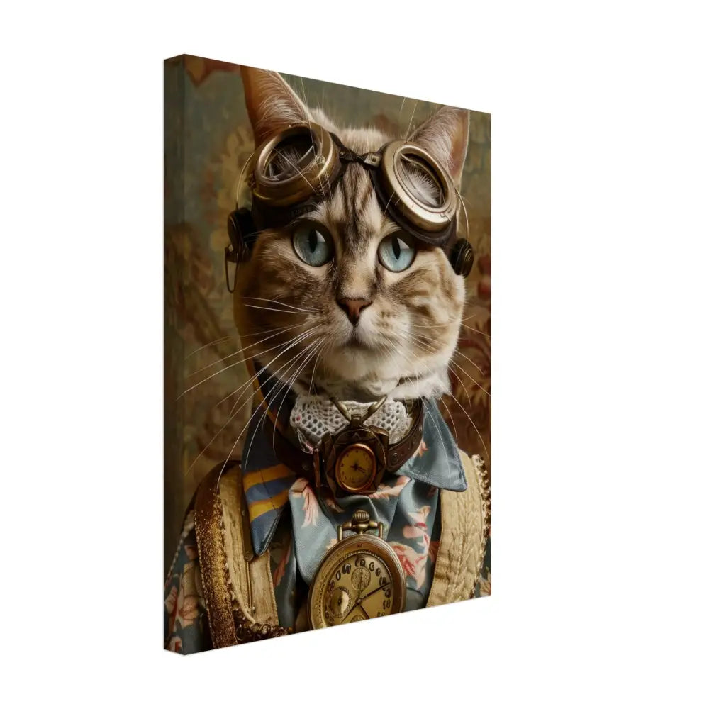 Dit schilderij toont een kat, gekleed in een prachtige vintage steampunk outfit. De kat draagt een elegante, blauwe jas met ingewikkelde bloemenpatronen en verfijnde brokaat accenten. Om haar nek hangt een antieke gouden klok, die haar charmante en historische uitstraling versterkt. Verder wordt haar kop gesierd door een paar grote, retro-futuristische brillen met bronzen metalen details, wat haar een avontuurlijke, wetenschappelijke flair geeft. Haar pootjes zijn voorzien van subtiele, beige leren accenten die perfect contrasteren met de jas. De achtergrond bevat een romantisch, gedrapeerd bloemenbehang, waardoor de afbeelding een nostalgische sfeer krijgt.