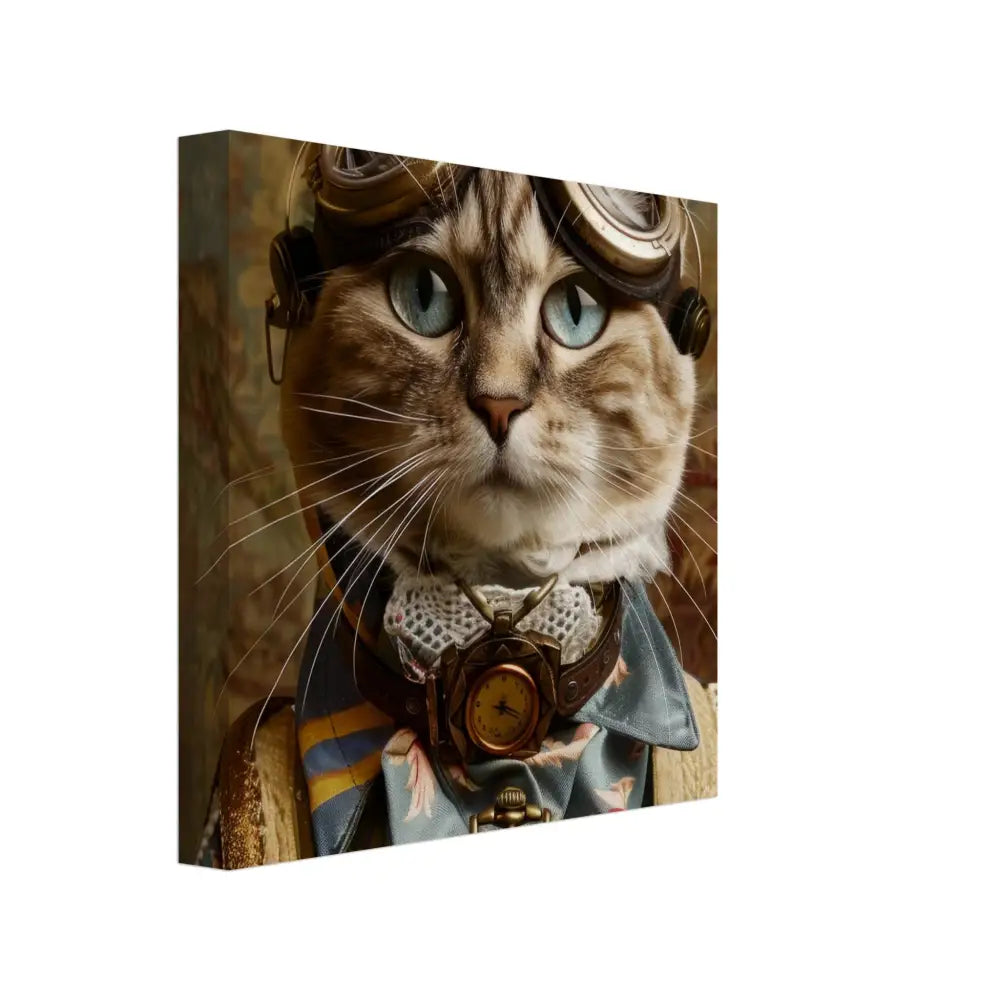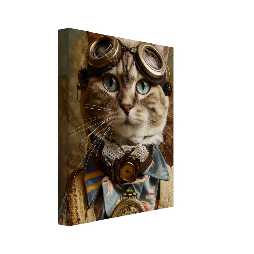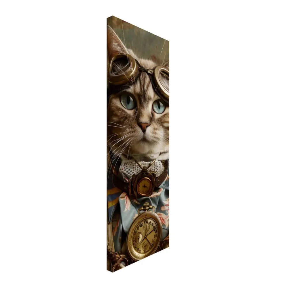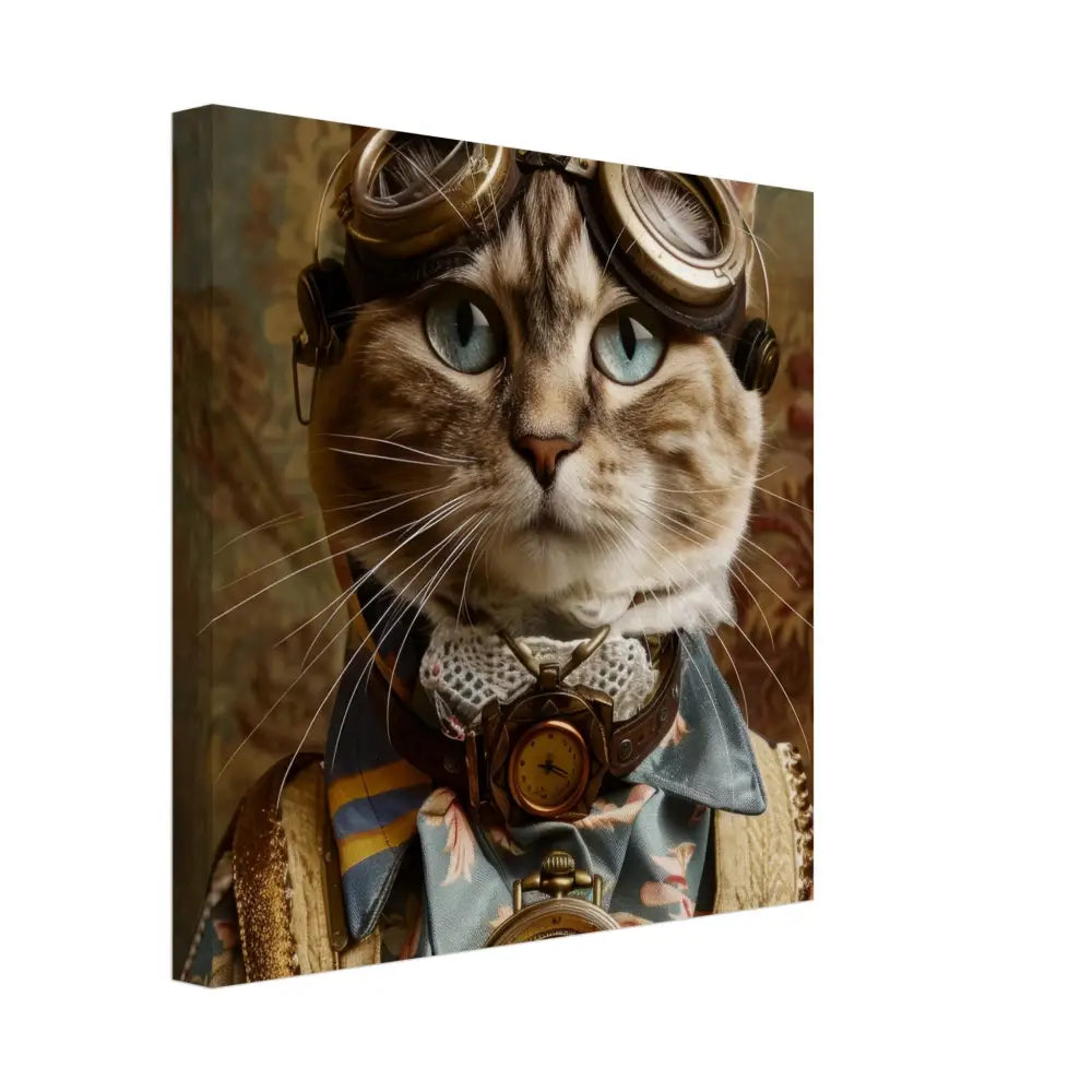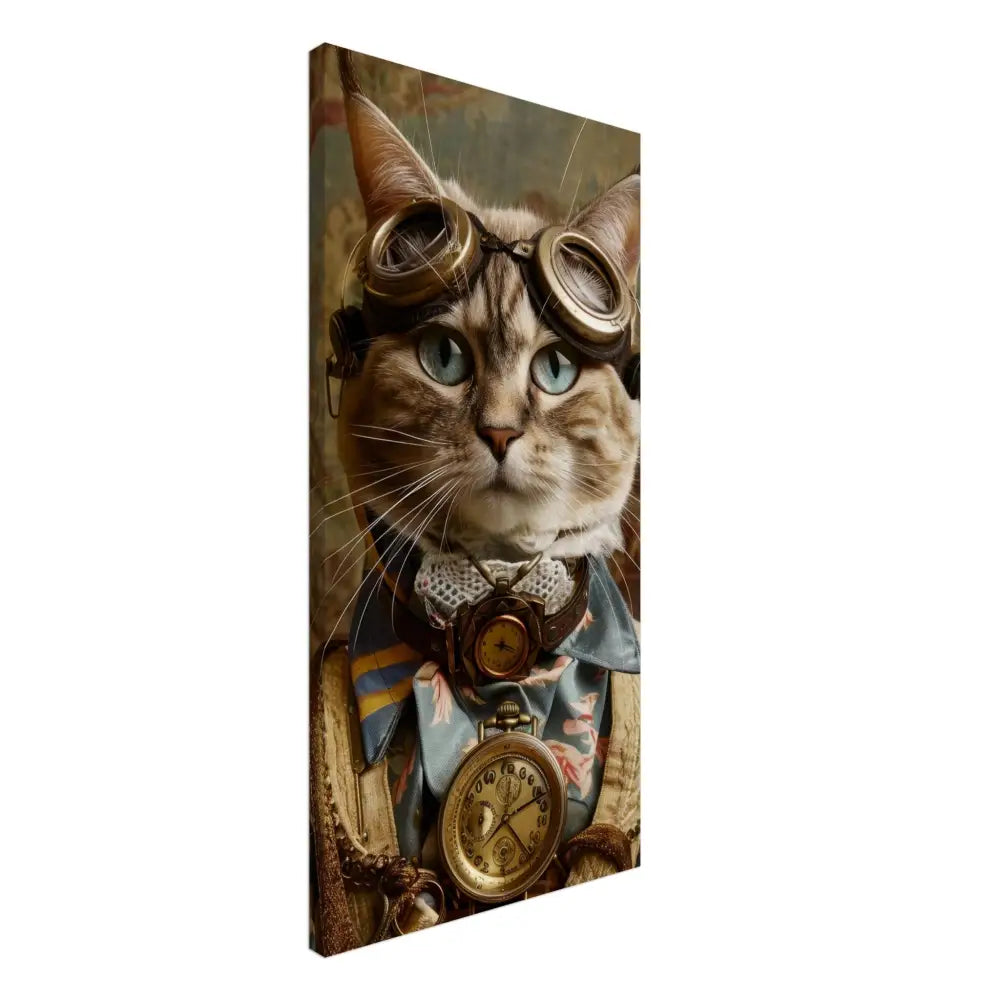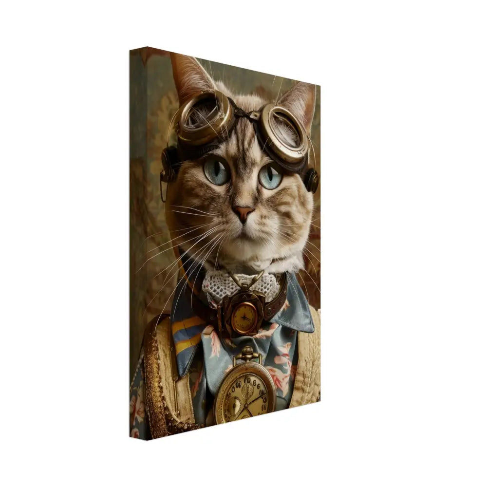 Dit schilderij toont een kat, gekleed in een prachtige vintage steampunk outfit. De kat draagt een elegante, blauwe jas met ingewikkelde bloemenpatronen en verfijnde brokaat accenten. Om haar nek hangt een antieke gouden klok, die haar charmante en historische uitstraling versterkt. Verder wordt haar kop gesierd door een paar grote, retro-futuristische brillen met bronzen metalen details, wat haar een avontuurlijke, wetenschappelijke flair geeft. Haar pootjes zijn voorzien van subtiele, beige leren accenten die perfect contrasteren met de jas. De achtergrond bevat een romantisch, gedrapeerd bloemenbehang, waardoor de afbeelding een nostalgische sfeer krijgt.