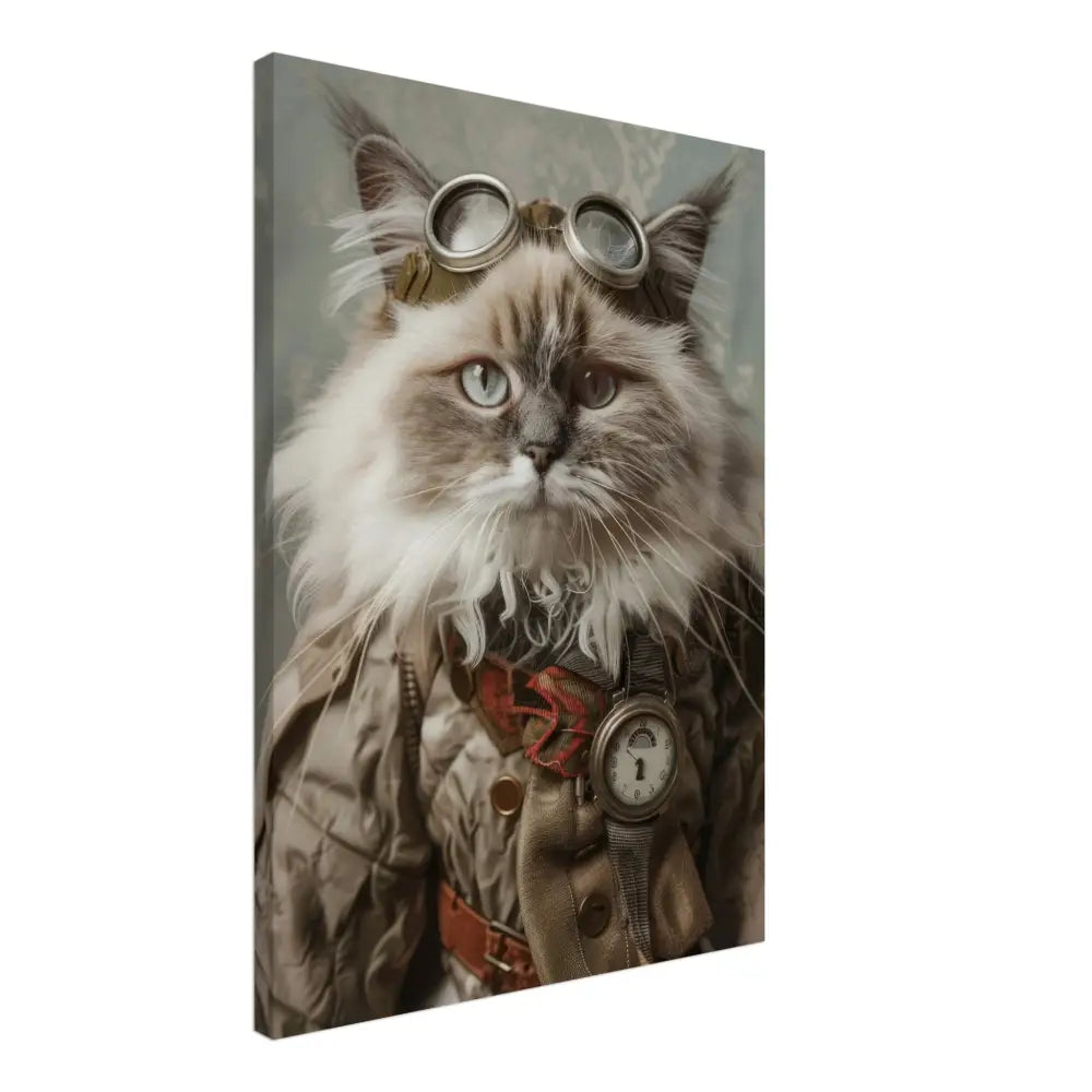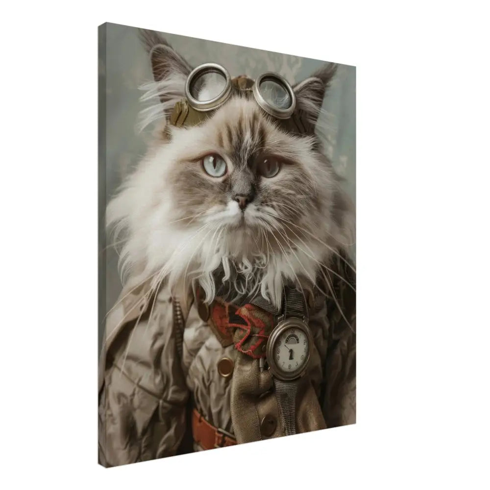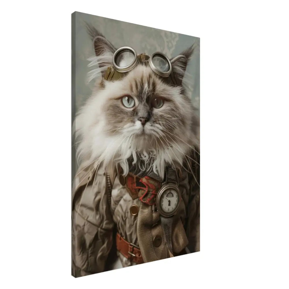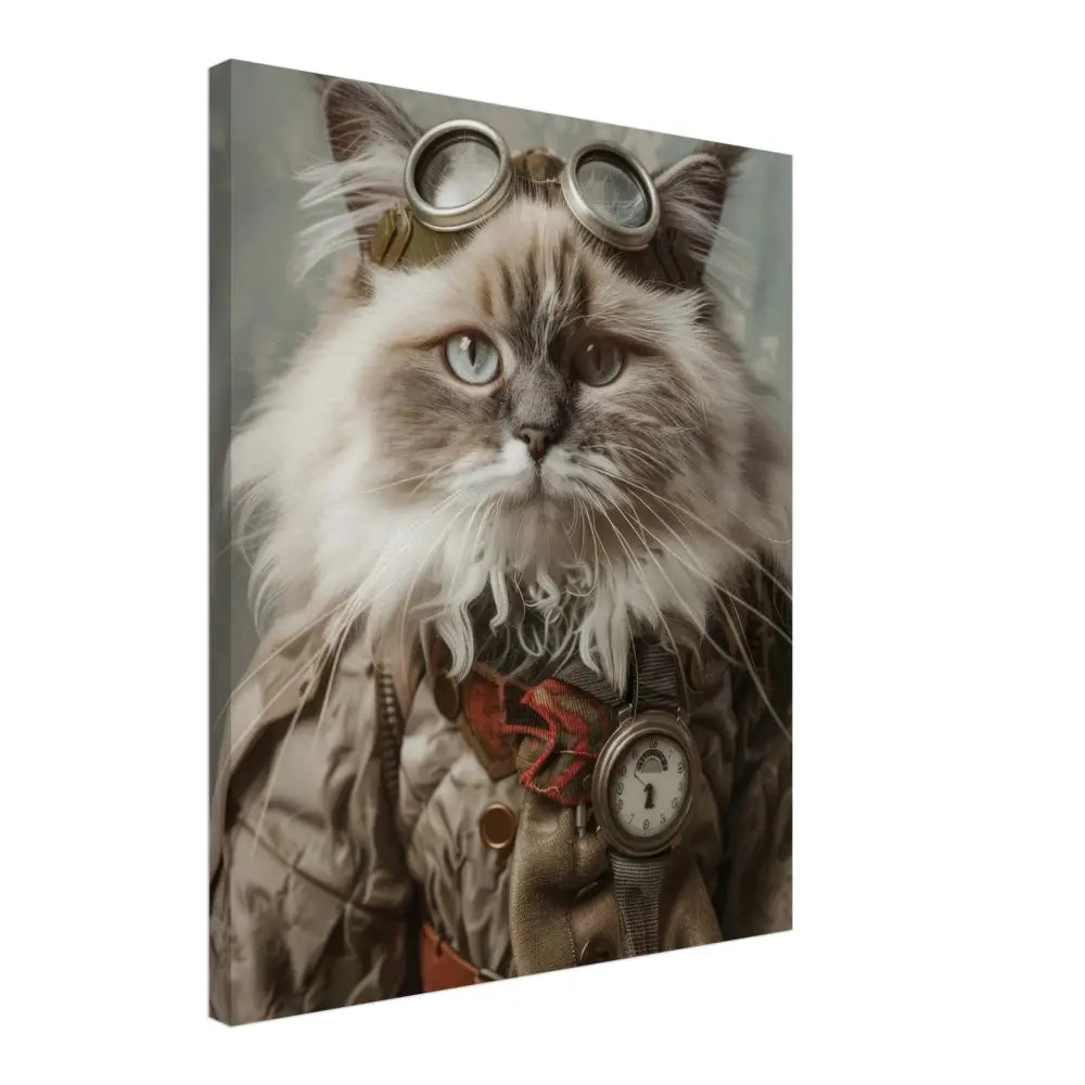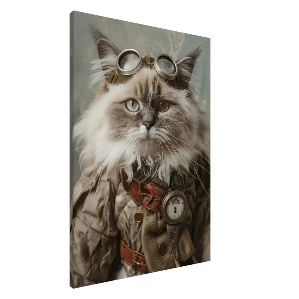 Dit schilderij toont een kat, gekleed in een prachtige vintage steampunk outfit. Hij draagt een gedetailleerde jas met een bronskleurige tint en subtiele stiksels. Om zijn nek hangt een antieke zilveren klok, die zijn verfijnde stijl benadrukt. Op zijn hoofd prijkt een paar grote, retro-futuristische brillen met metalen details in een gepatineerde zilvertint, wat hem een fascinerende, mechanistische uitstraling geeft. Zijn voorpoten zijn geaccentueerd met elegante, grijze bontachtige manchetjes. Op de achtergrond is een romantisch bloemenbehang te zien, wat bijdraagt aan de nostalgische sfeer van het geheel.